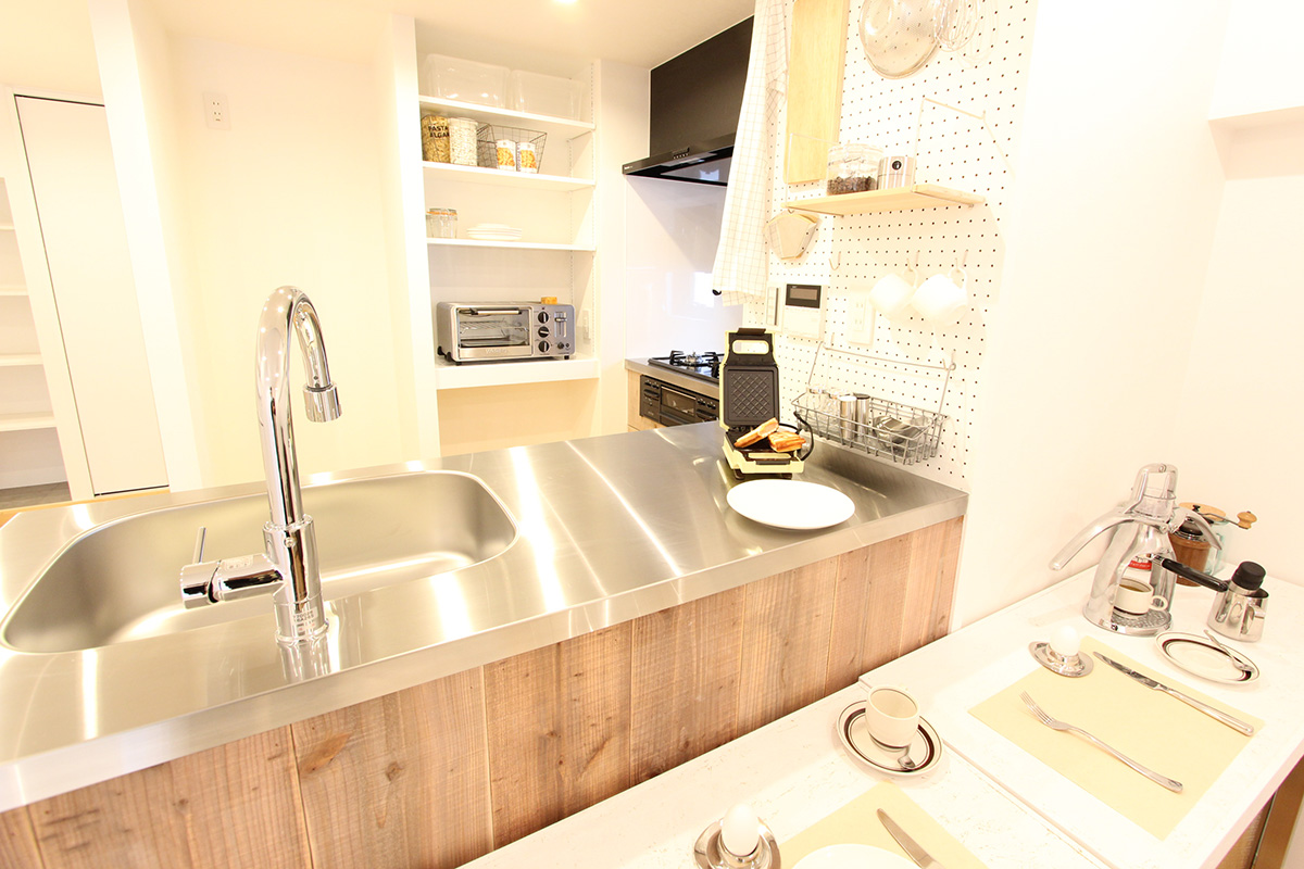 UDATSUでは、内覧される皆さまが、その物件での暮らしをイメージしやすいように、家具やキッチン用品などをディスプレイしています。