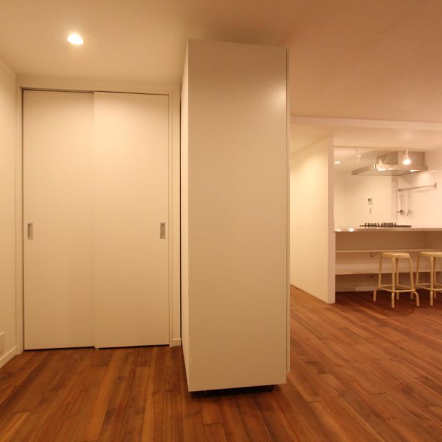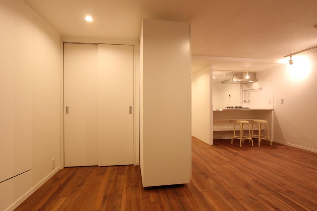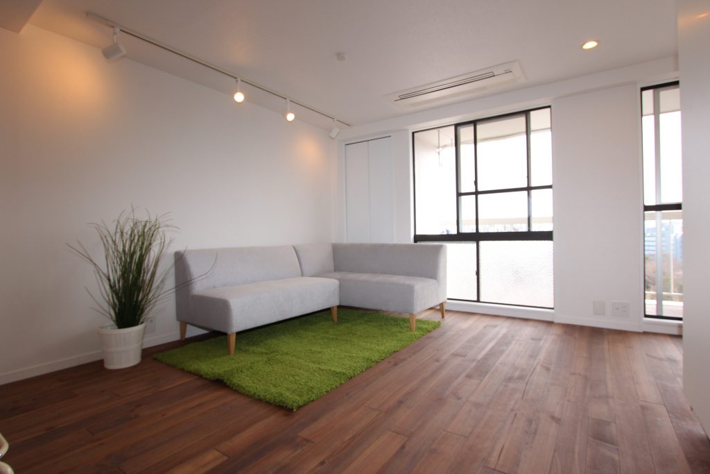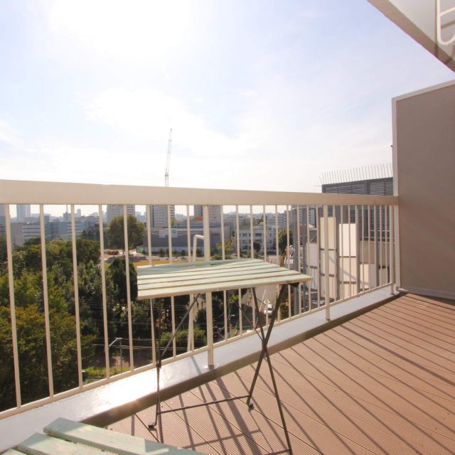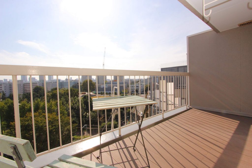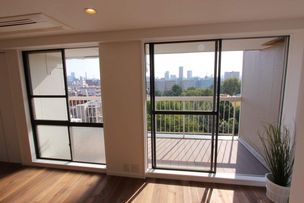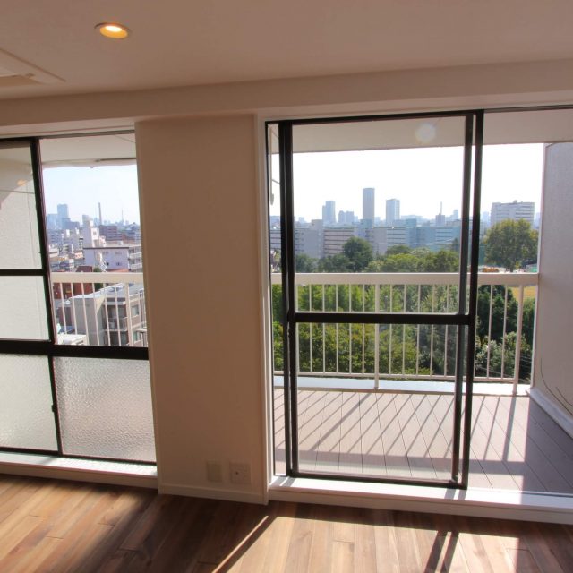バルコニーまで進んでみると、思わず「うわぁ!」と歓声をあげたくなるほどの美しいパノラマ眺望が広がっていました。紅葉が色づきはじめた『東山公園』の杜の向こう側には、渋谷の高層ビル群が。その先には、東京タワーや六本木ヒルズ、東京スカイツリーの姿も確認できます。この“THE TOKYO”とも言うべき美しい眺望は、まさしく【東山コーポラス】の自慢の財産。ずっとカーテンを開けたまま部屋で過ごしたくなりそうな、気持ちの良い住空間です。