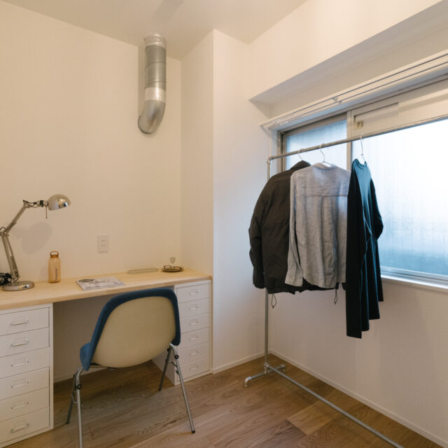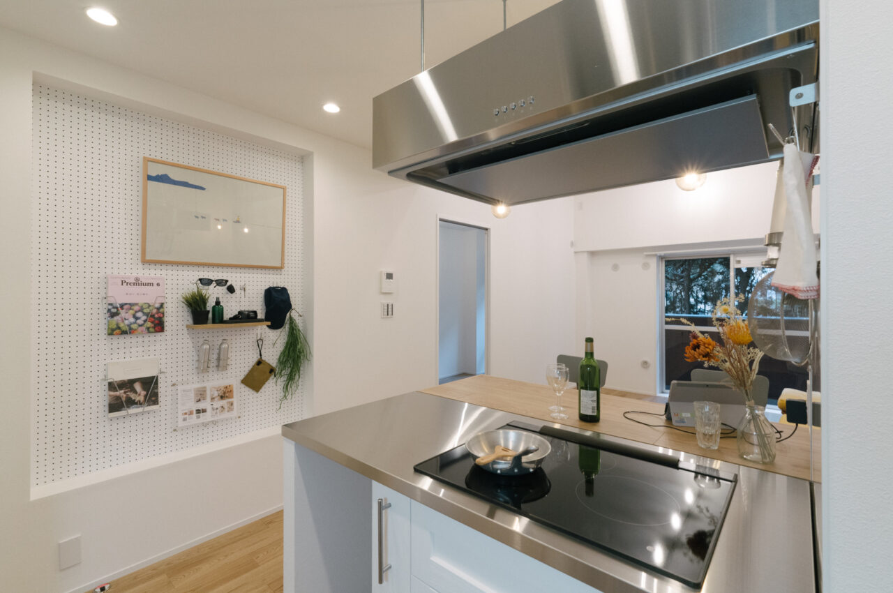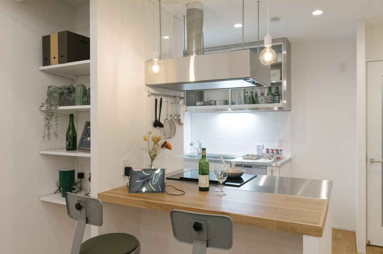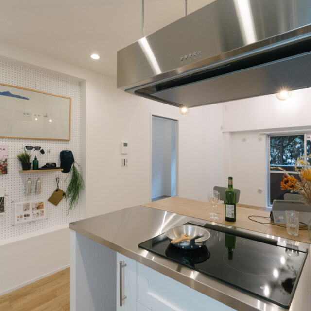 室内でまず目に入るのは約2.7mのリビングの天井高。この垂直方向のゆとりが面積以上の開放感を生み出しています。空間の主役はダイニングカウンター付きのⅡ型キッチンで、オーク材のフローリングが柔らかな温かみを添えています。玄関横の約2.9Jのサービスルームは、リモートワークに集中する書斎としても、趣味の道具を詰め込む収納としても、住む人のライフスタイルに合わせて形を変えるマルチスペースです。