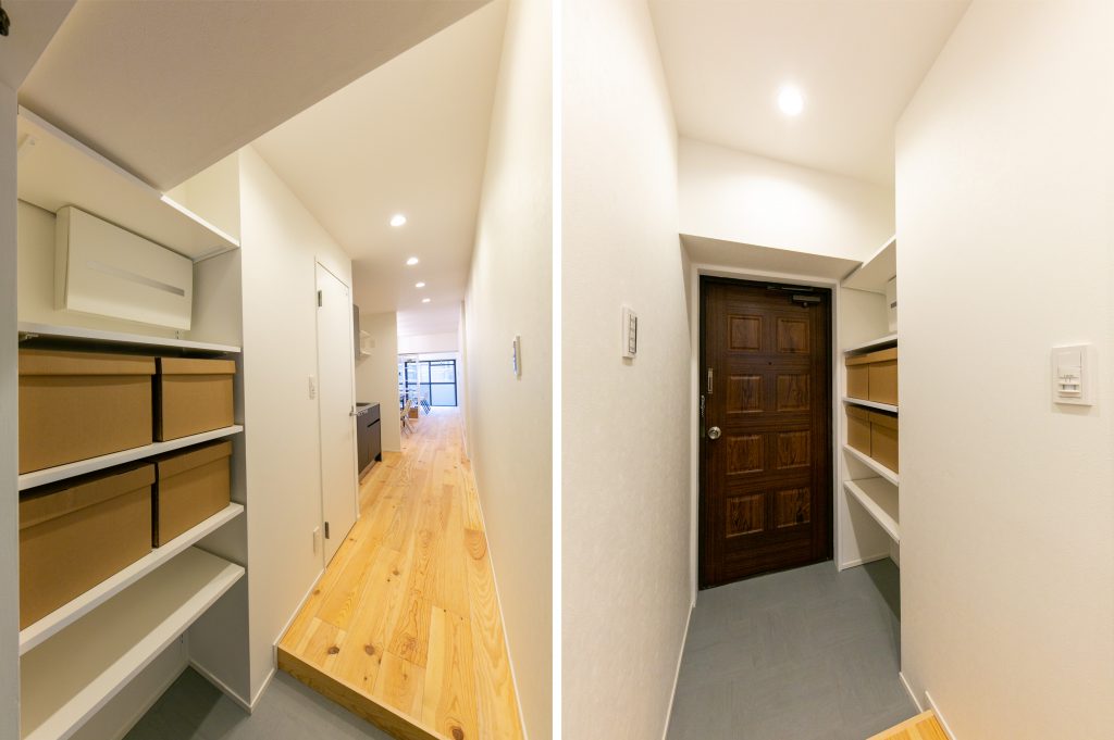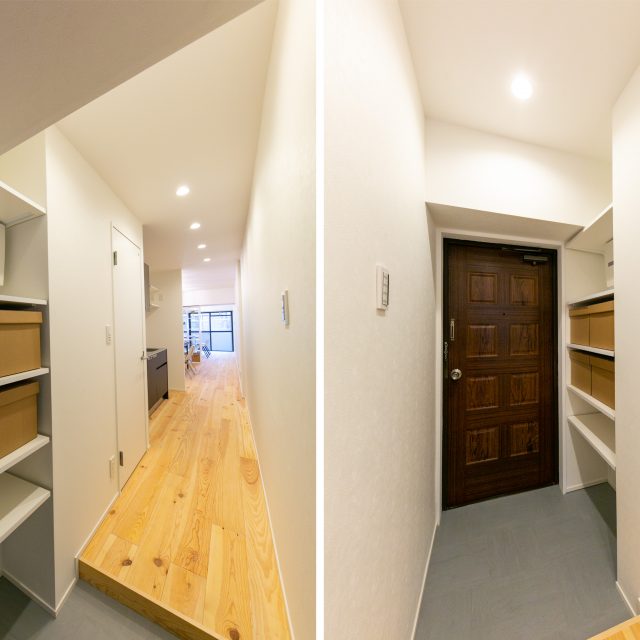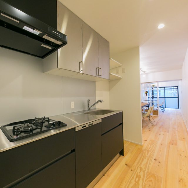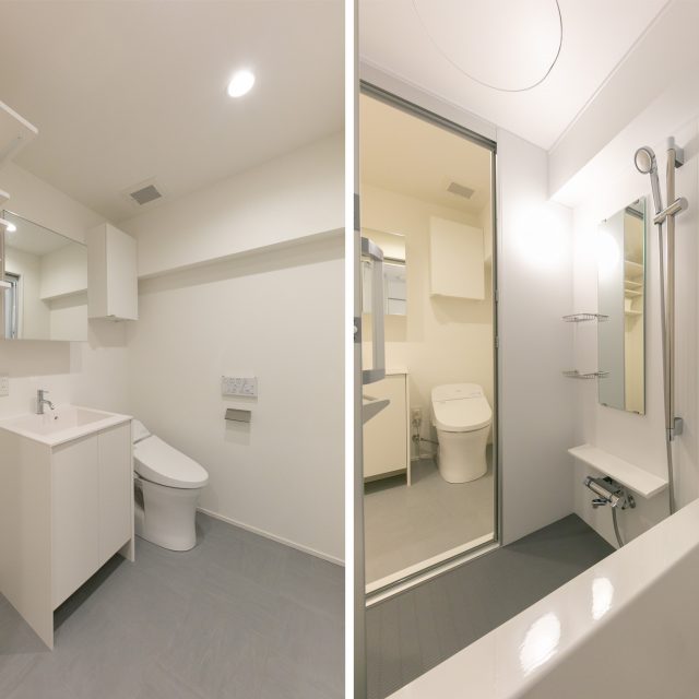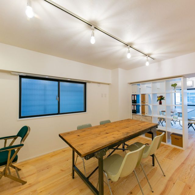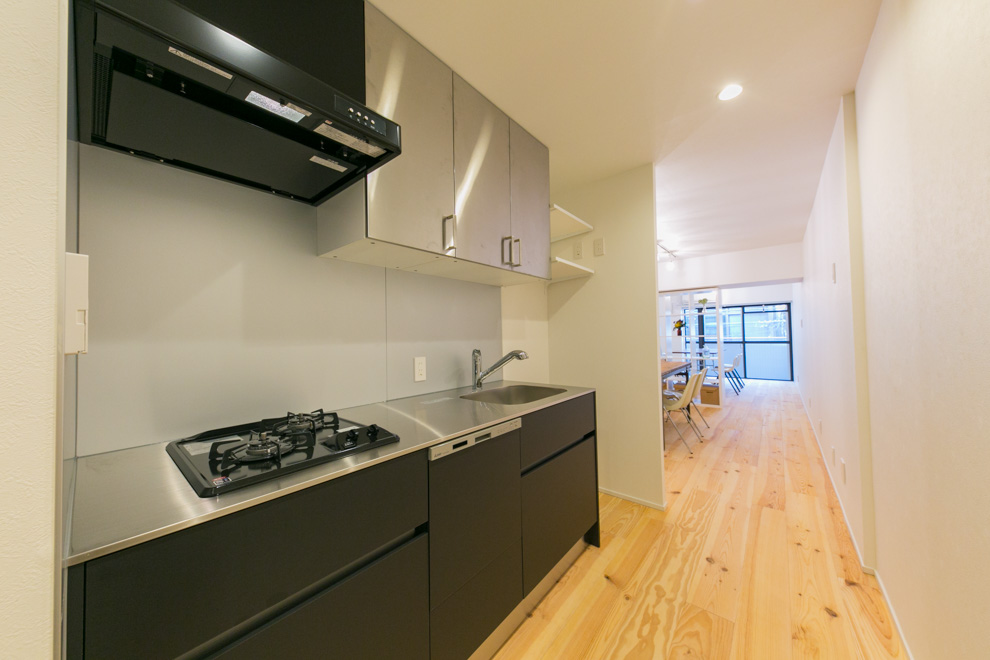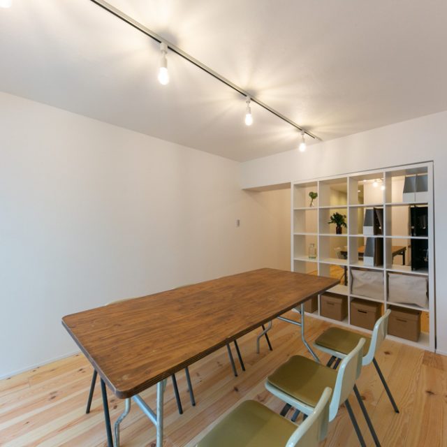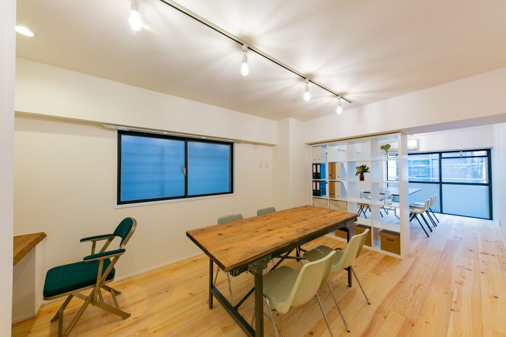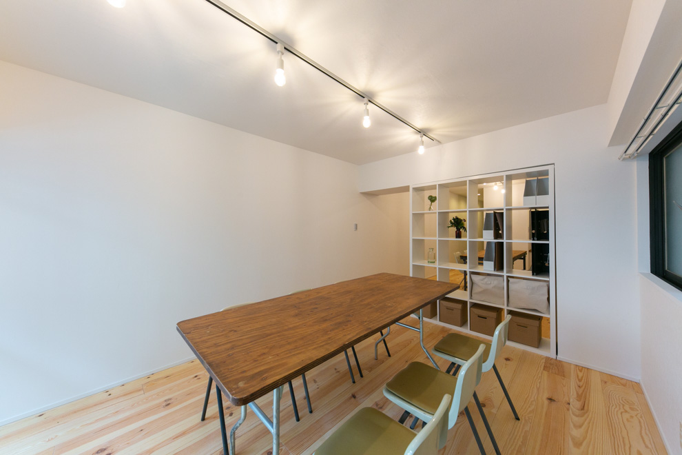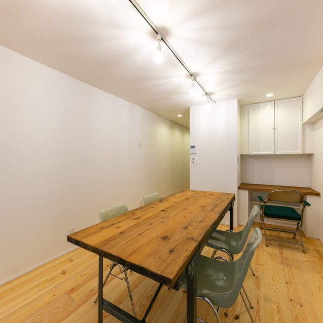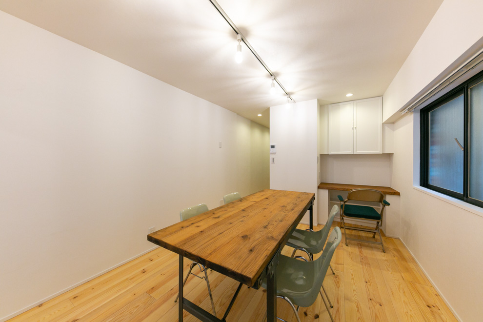 巨大ターミナル「新宿」駅から徒歩8分、高層ビル街にほど近い立地の新耐震物件です。パイン材無垢フローリングと白い壁のシンプルな空間に、事務所使いも想定して、水回りをぎゅっとコンパクトにまとめ、デスクが配置しやすいように居室スペースを充実させたプランでリノベーションしました。
