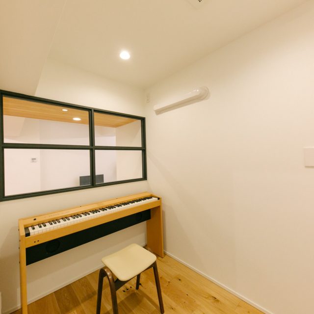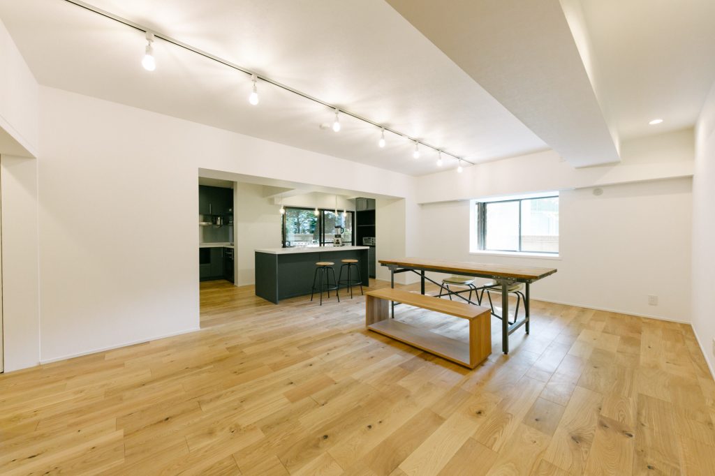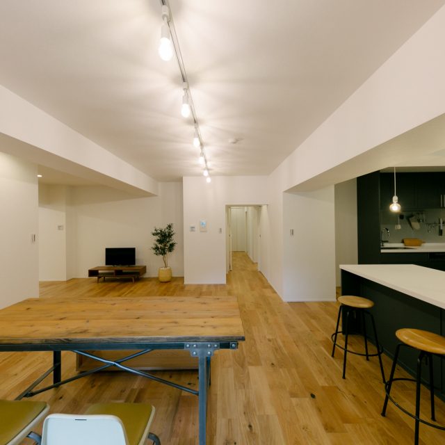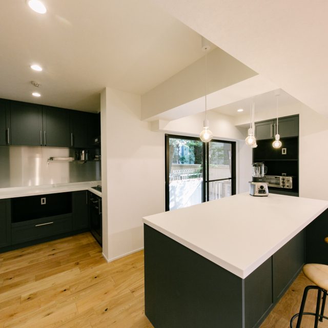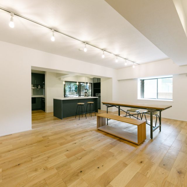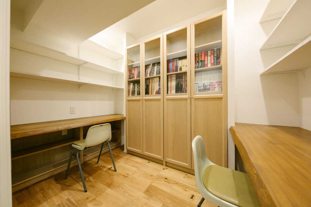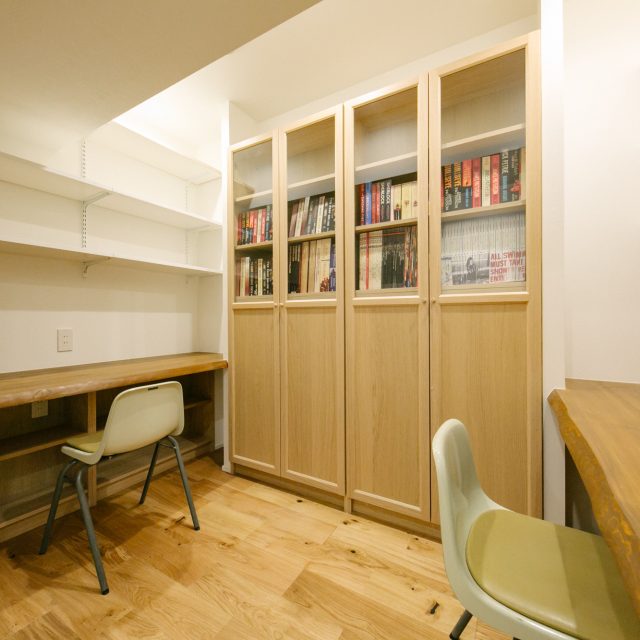 國學院大学と常陸宮邸にほど近い凛とした空気の邸宅地、マンションへの長いアプローチが瀟洒なヴィンテージマンションです。1階138㎡の室内はまるで森の中、個性的な間取りプランは見どころが盛りだくさん。開放感なキッチンは、コンロとシンクは奥に配置、みんなで作業したり軽く食事したりするアイランド型。約43JのLDKの中央にRC躯体に囲まれた小部屋があったことを逆手に取り、防音性のあるミニスタジオを設置しました。玄関横には大人2人が使えるワークスペースを設け、アカデミックなファミリーの暮らしがよく似合います。