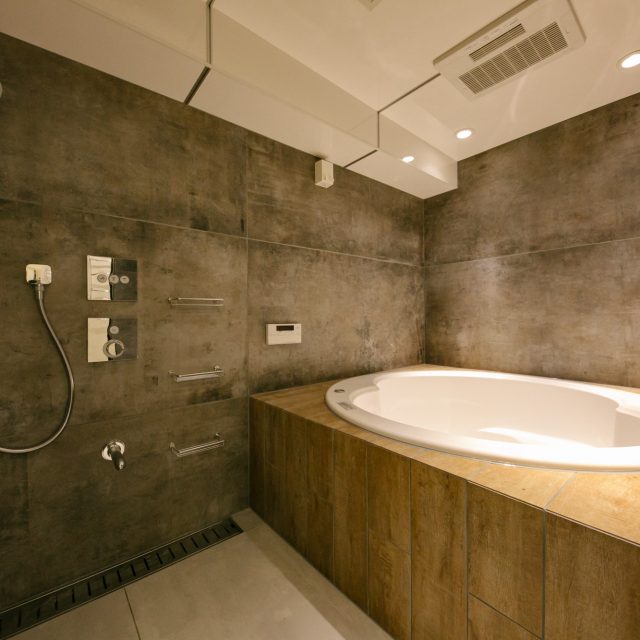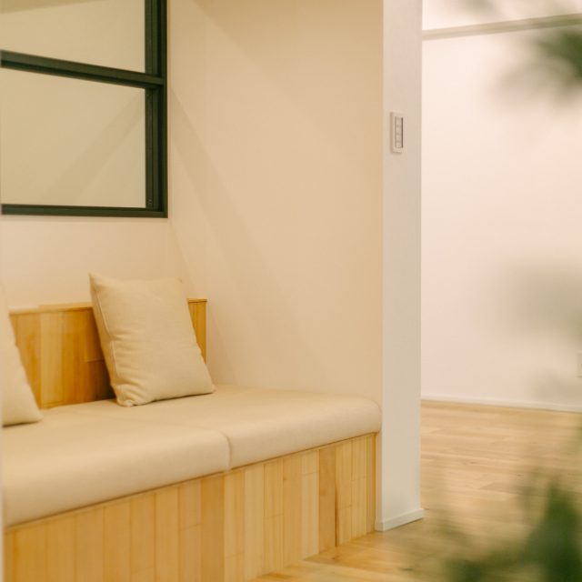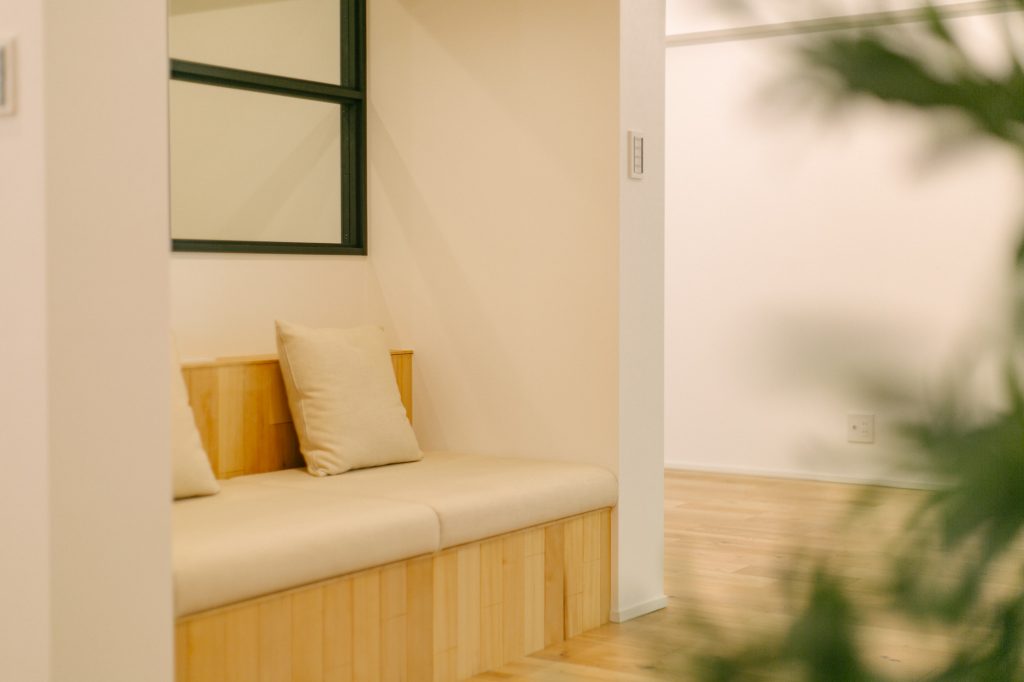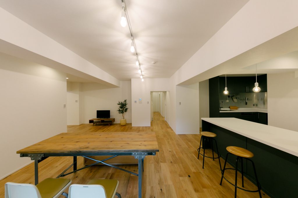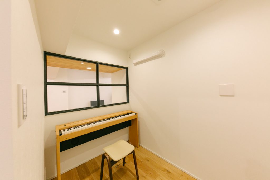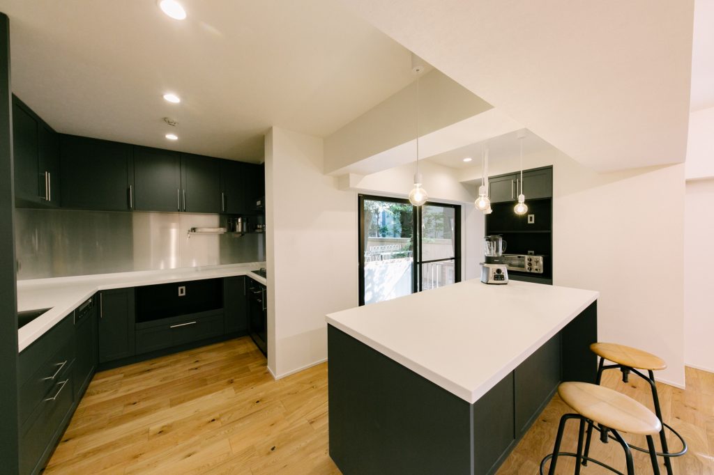 國學院大学と常陸宮邸にほど近い凛とした空気の邸宅地、マンションへの長いアプローチが瀟洒なヴィンテージマンションです。1階138㎡の室内はまるで森の中、個性的な間取りプランは見どころが盛りだくさん。開放感なキッチンは、コンロとシンクは奥に配置、みんなで作業したり軽く食事したりするアイランド型。約43JのLDKの中央にRC躯体に囲まれた小部屋があったことを逆手に取り、防音性のあるミニスタジオを設置しました。玄関横には大人2人が使えるワークスペースを設け、アカデミックなファミリーの暮らしがよく似合います。