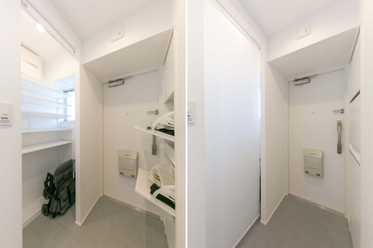 子供部屋と寝室をミニマイズ、その分を学習スペース、こども用DENへ振り向けました。キッチンでお料理するお母さんが宿題をする子供たちを見守れるレイアウト、子供たちだけがこもって遊べる窓際のカーペットコーナーは、学校に行っている間には室内干しスペースにもなります。玄関にベビーカーも収納できる大き目の収納も設けられ・・・この至れり尽くせりのお部屋で、豊洲子育てライフを満喫してみてはいかがでしょうか。
