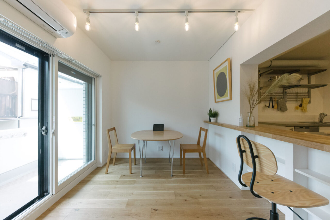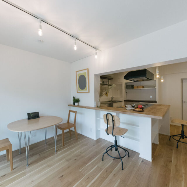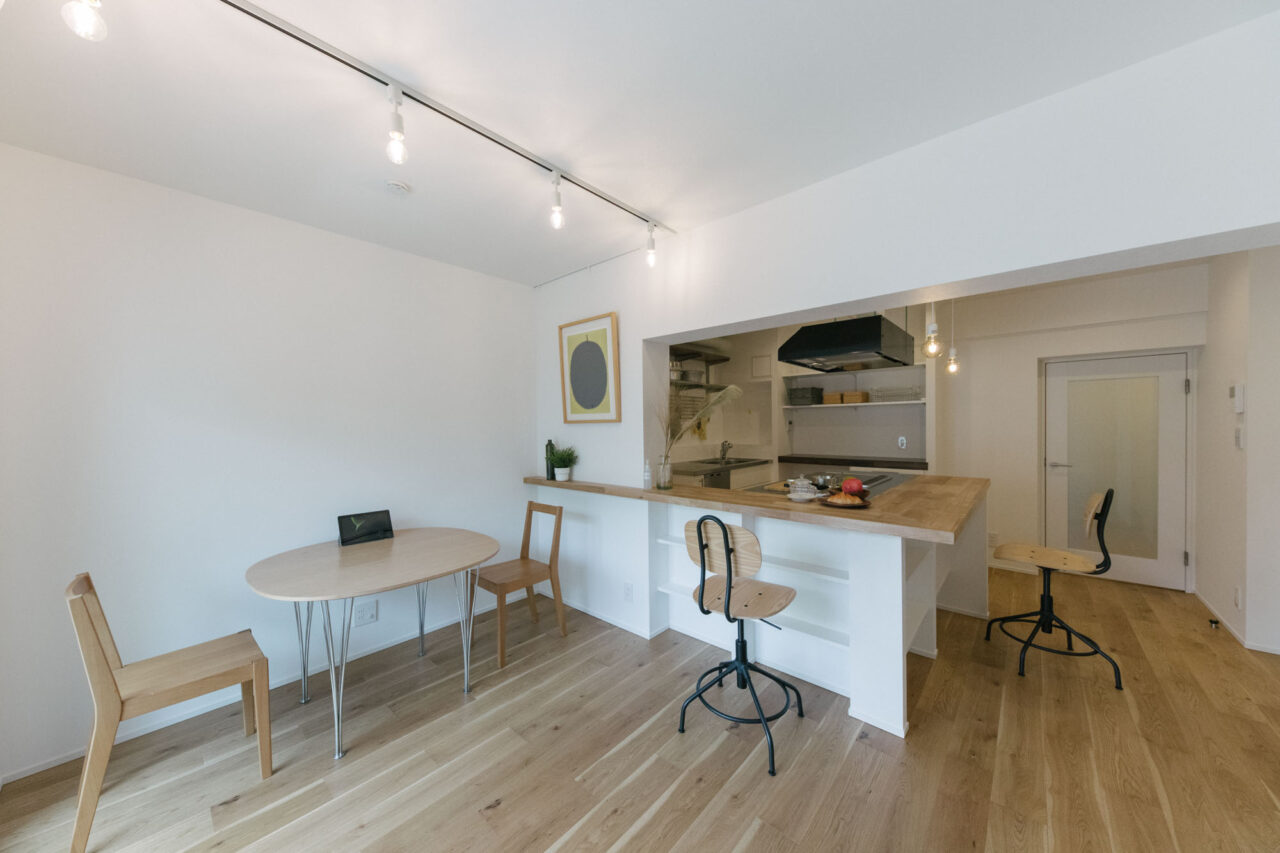 最寄りは駒沢大学駅、三軒茶屋へも歩けます。少し足をのばせば駒沢オリンピック公園、学芸大学も生活圏の世田谷区野沢。建物は白タイル張りのEVのない3階建て18世帯、2階部分のお部屋です。室内は2LDK、ダイニングカウンター一体型のオープンキッチンが中央にドーンと鎮座しています。水回り設備や収納も過不足なく配置。サービススペースを書斎にするか、WICにするかセレクトできて売主負担で改装後お引渡しする物件です。