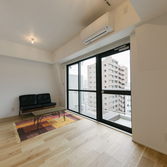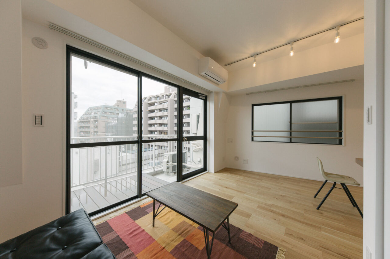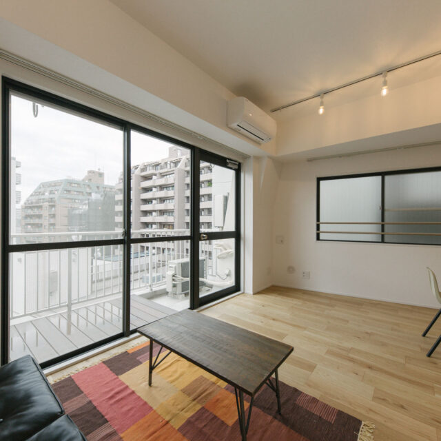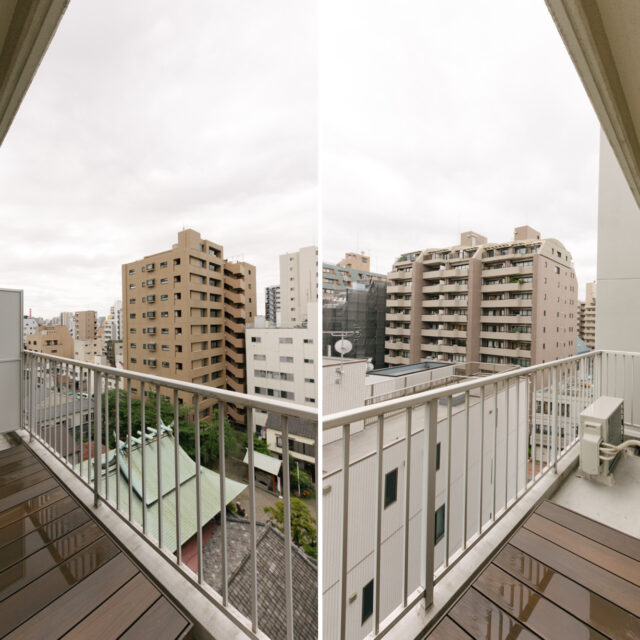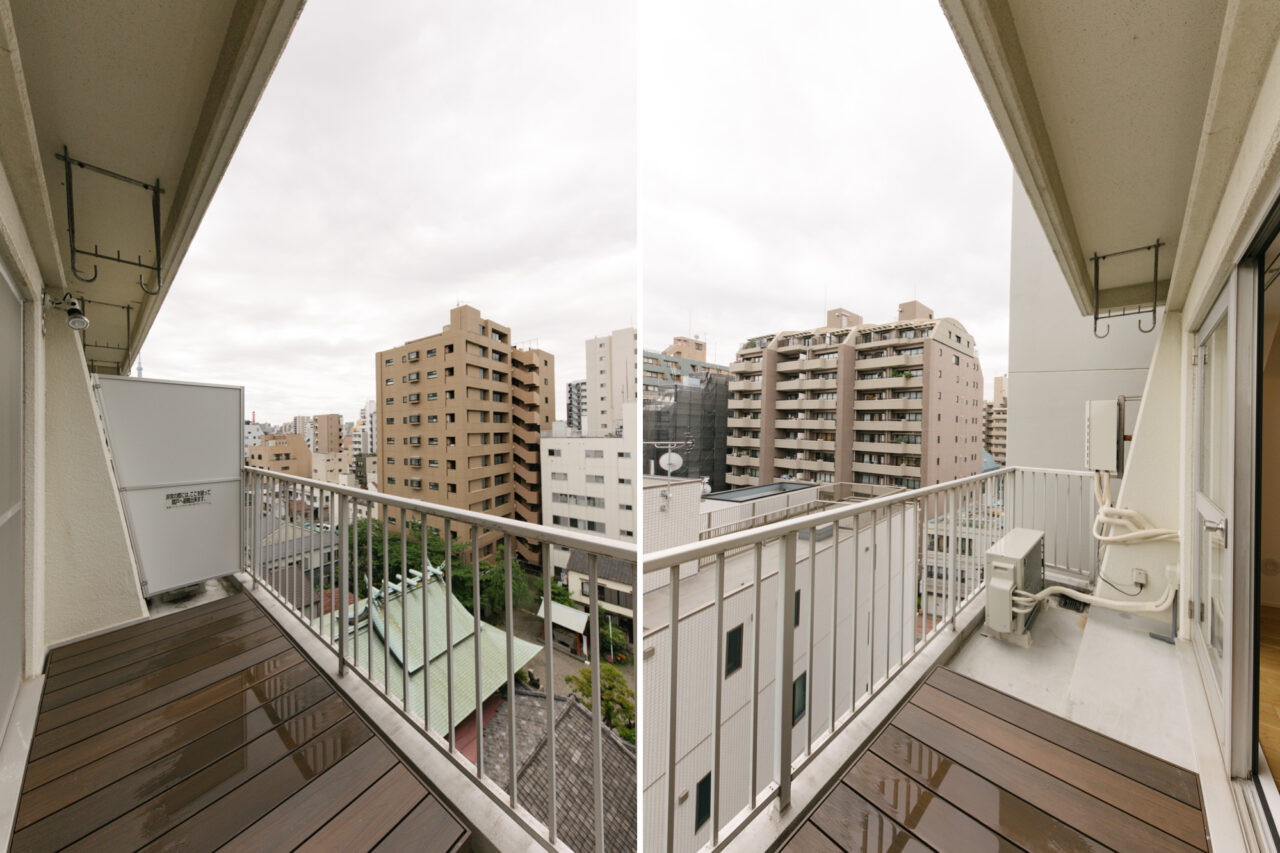 上野と浅草のちょうど中間、台東区松が谷といえば、なんといってもみんな大好きかっぱ橋道具街。プロ向けキッチングッズや調理器具、和食器など連なるお店を見て回るだけで楽しくなります。建物は入谷南公園に隣接する8階建て、新耐震基準適合物件です。7階部分南向きの室内は、39㎡とコンパクトながら天井高は約2.6m、面積以上に広々とした印象の1LDKです。備付ダイニングテーブルがある食洗器付オープンキッチン、奥行のあるバルコニーに設置したウッドデッキが特徴のお部屋です。