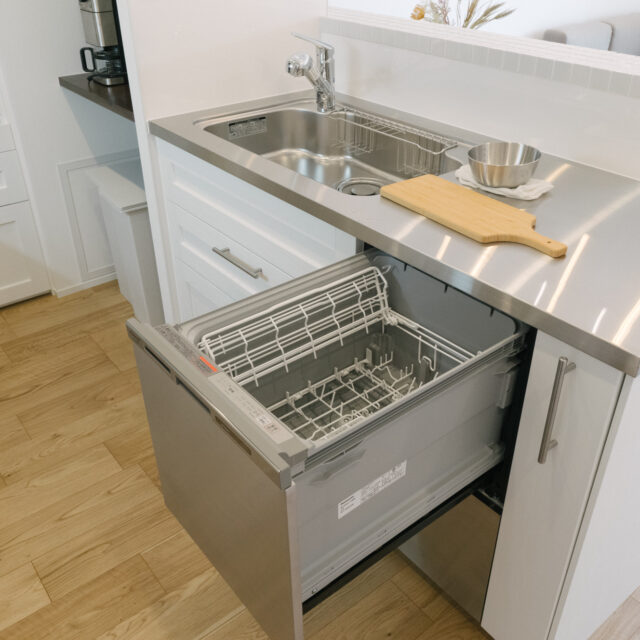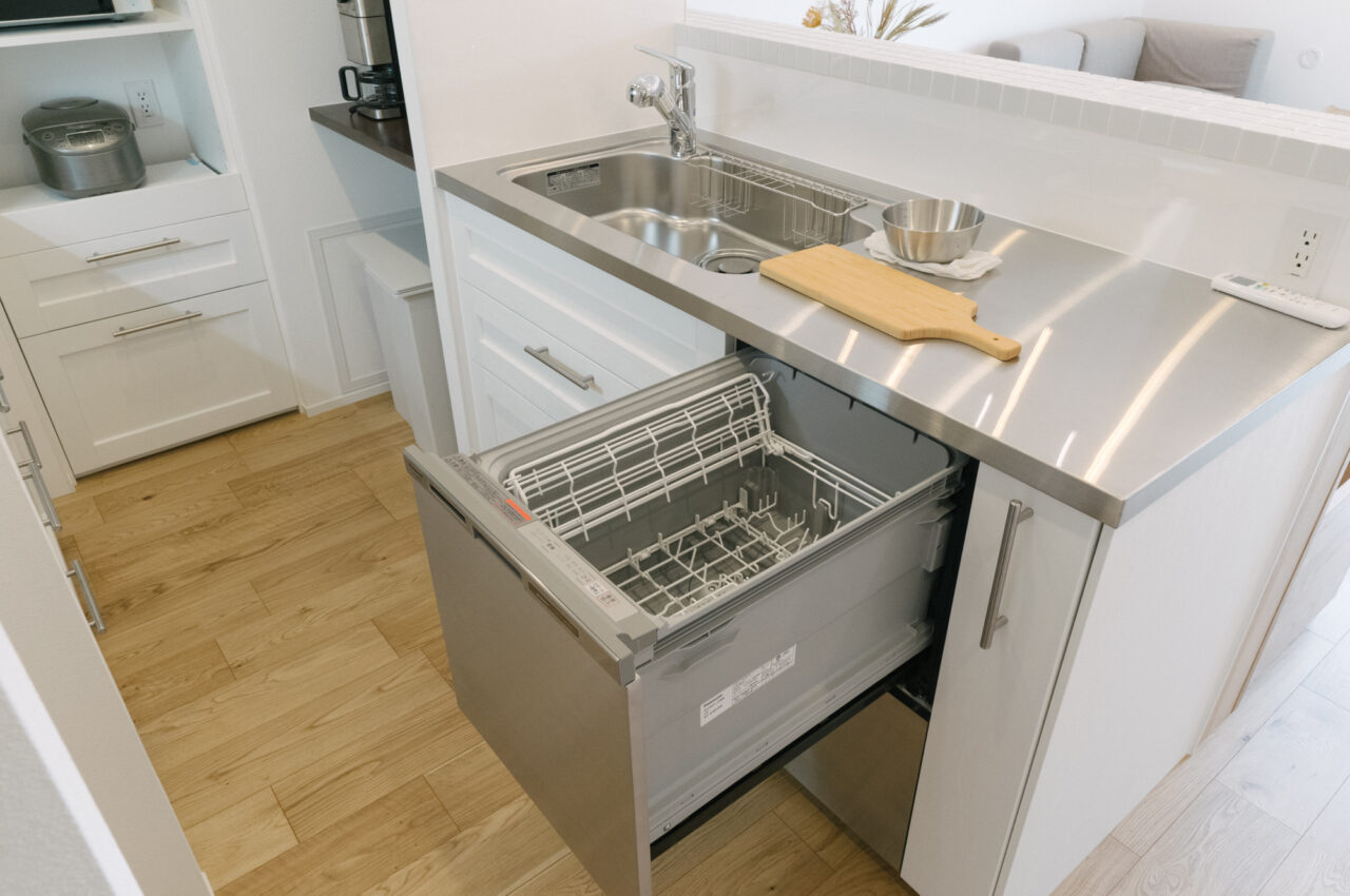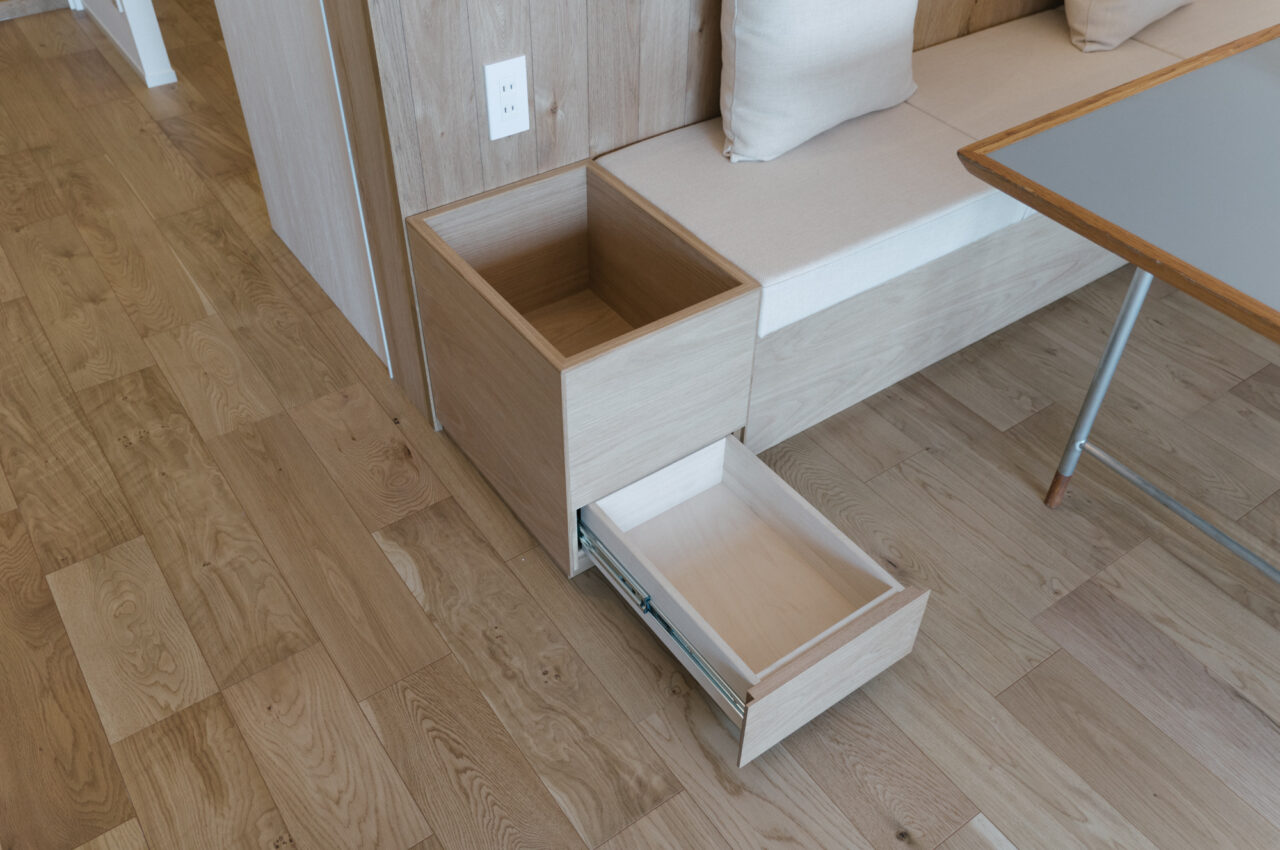 71㎡のゆとりの空間、夫婦2人が並んでも余裕のあるⅡ型キッチンとダイニングには造作ソファを備えました。さらに広い玄関土間やすっきり暮らせる豊富な収納も随所に配置しました。