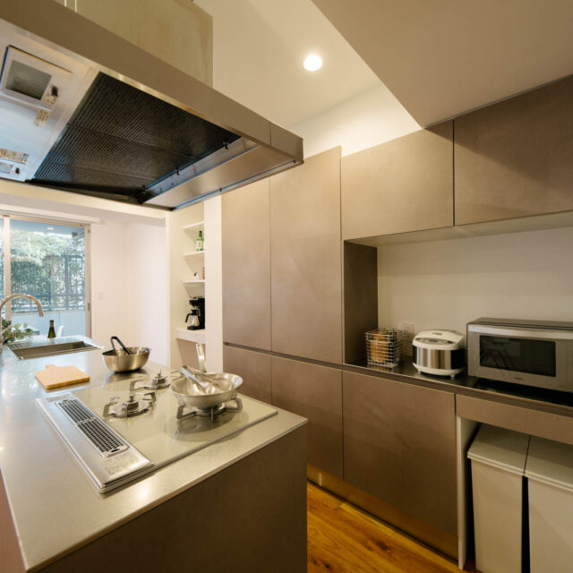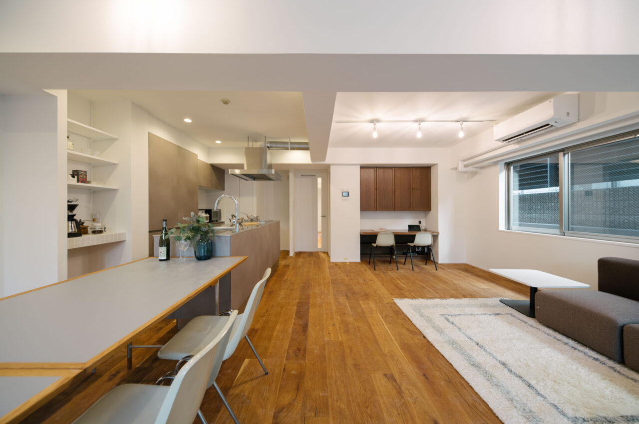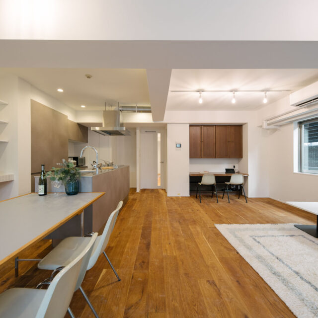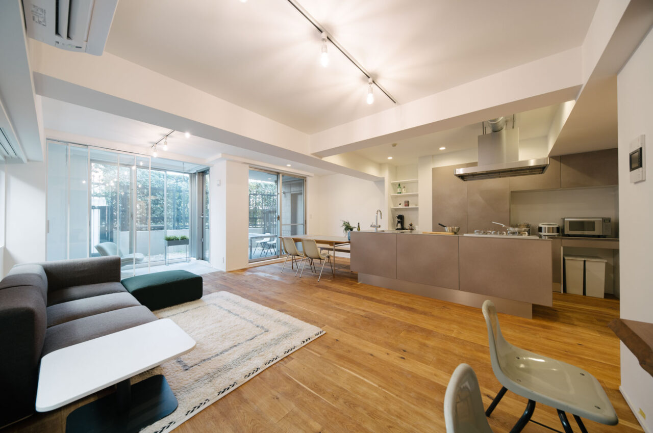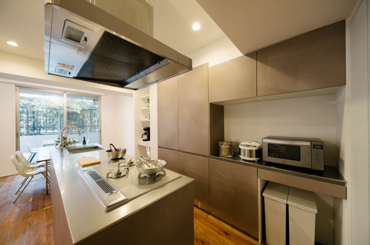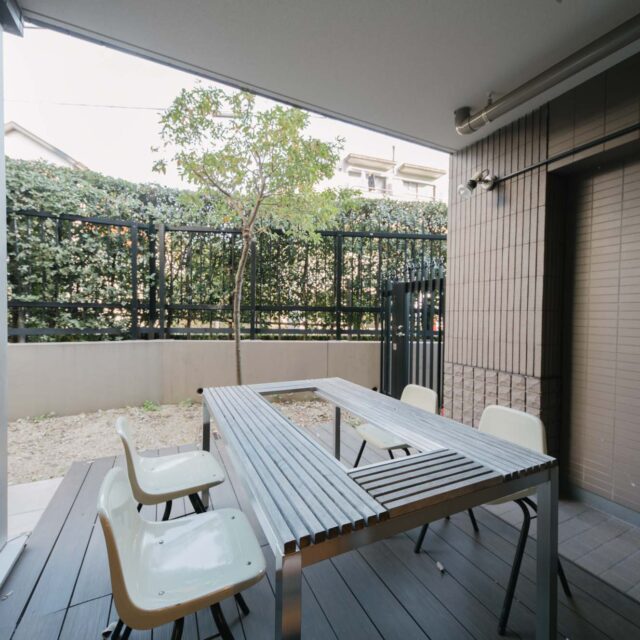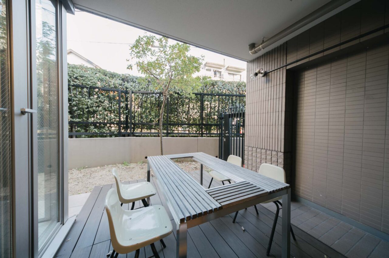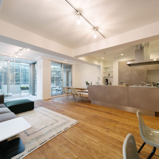 住所は目黒本町でも通りを挟んだ碑文谷~サレジオ教会界隈の緑の多い閑静な住宅地、専用庭付きの1階88㎡、下階を気にせず子供たちも元気に走り回れるお部屋です。タイル敷きのインナーテラスからウッドデッキ付専用庭はペットの居場所や日向ぼっこするのにぴったり。オープンキッチンと壁一面のビルトインのカップボード+サイドボードは「食」にまつわるすべてのモノをすっきり収納できます。