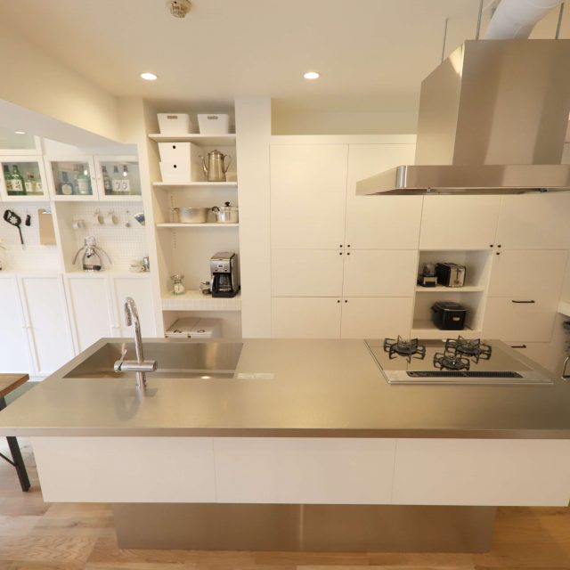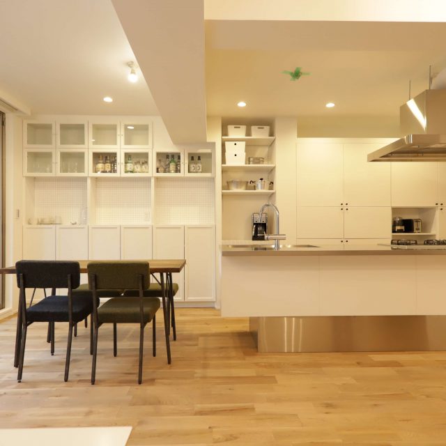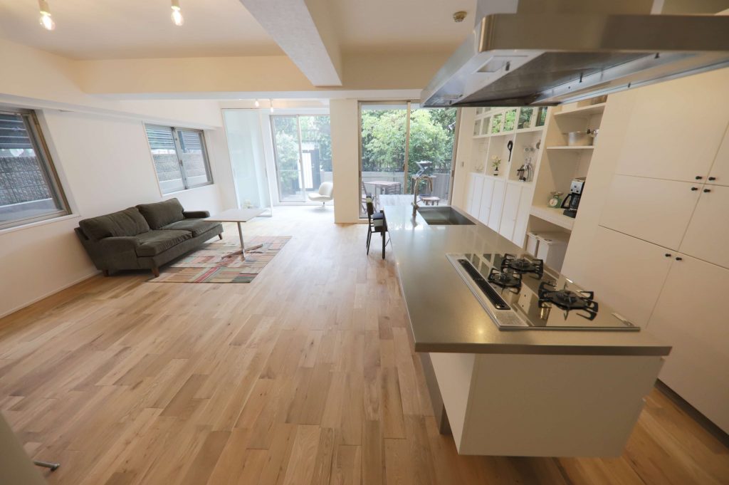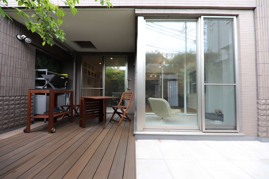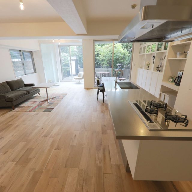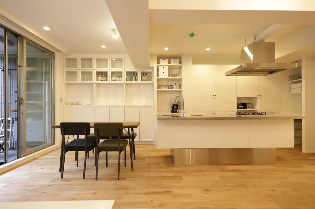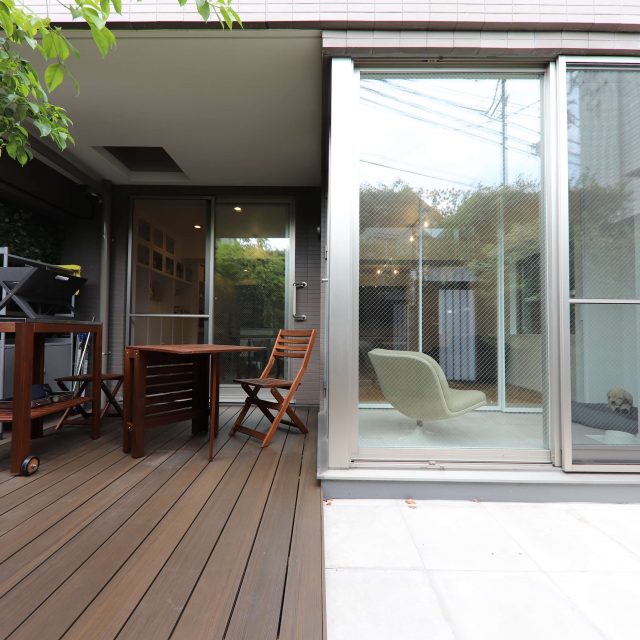 住所は目黒本町でも通りを挟んだ碑文谷~サレジオ教会界隈の緑の多い閑静な住宅地、専用庭付きの1階88㎡、下階を気にせず子供たちも元気に走り回れるお部屋です。タイル敷きのインナーテラスからウッドデッキ付専用庭はペットの居場所や日向ぼっこするのにぴったり。オープンキッチンと壁一面のビルトインのカップボード+サイドボードは「食」にまつわるすべてのモノをすっきり収納できます。