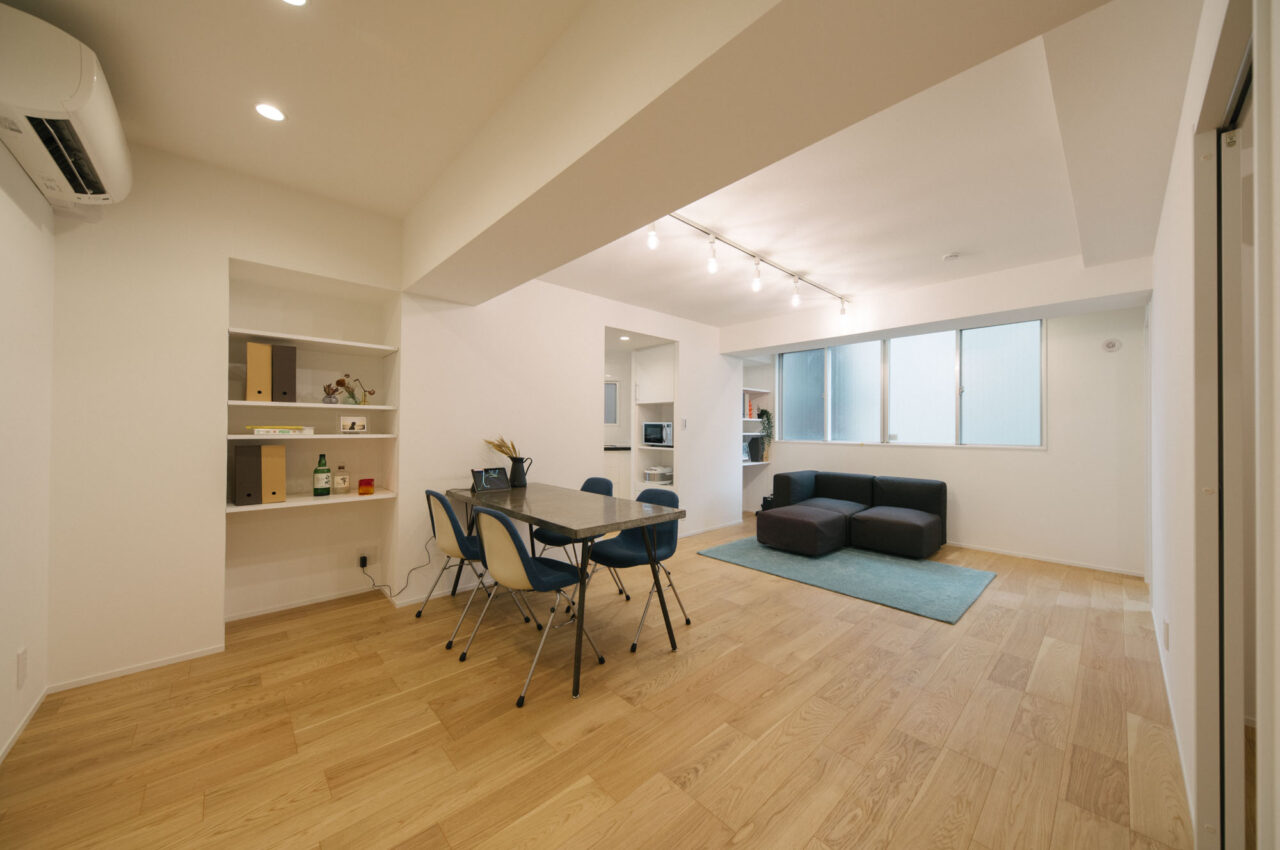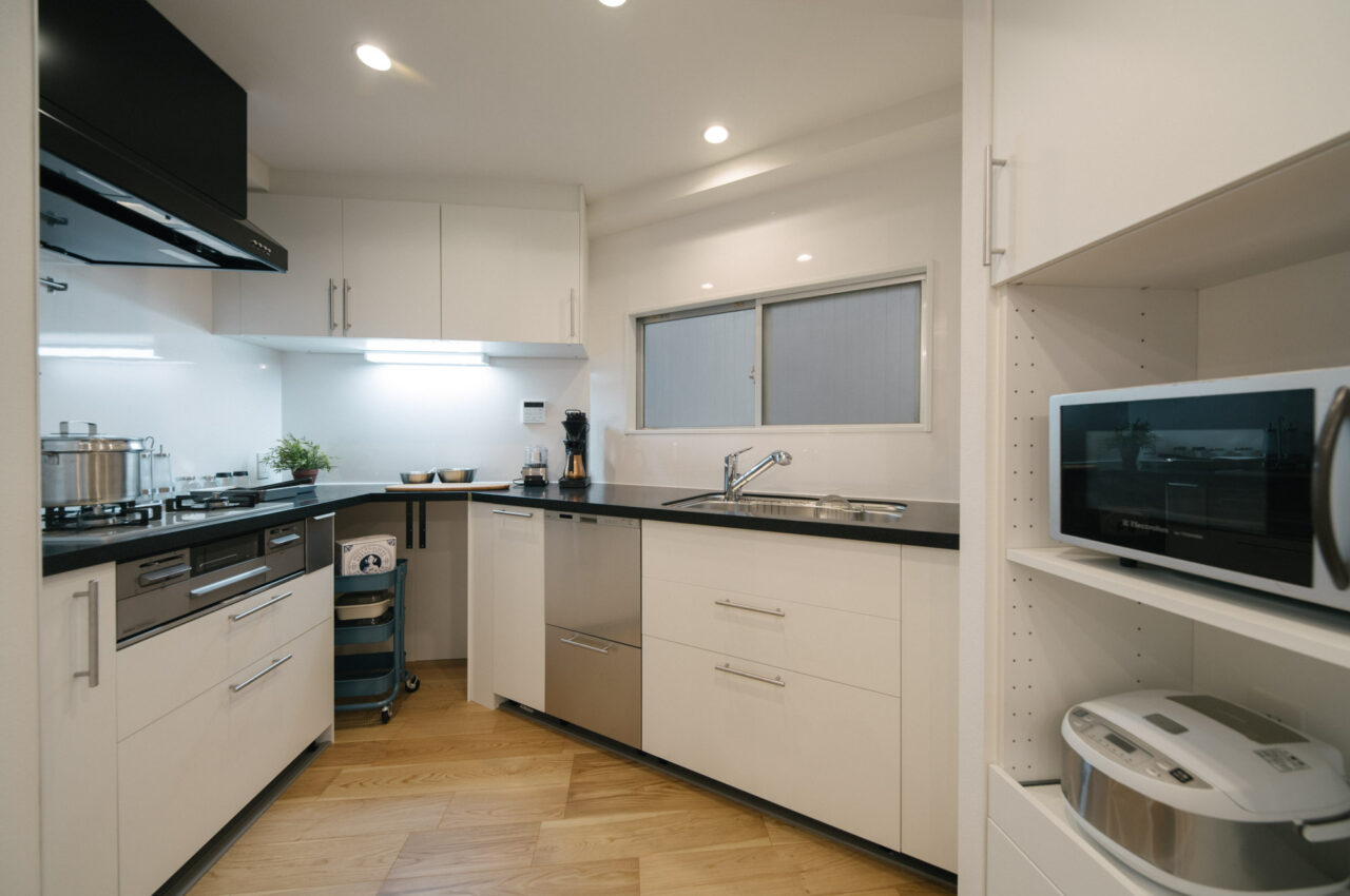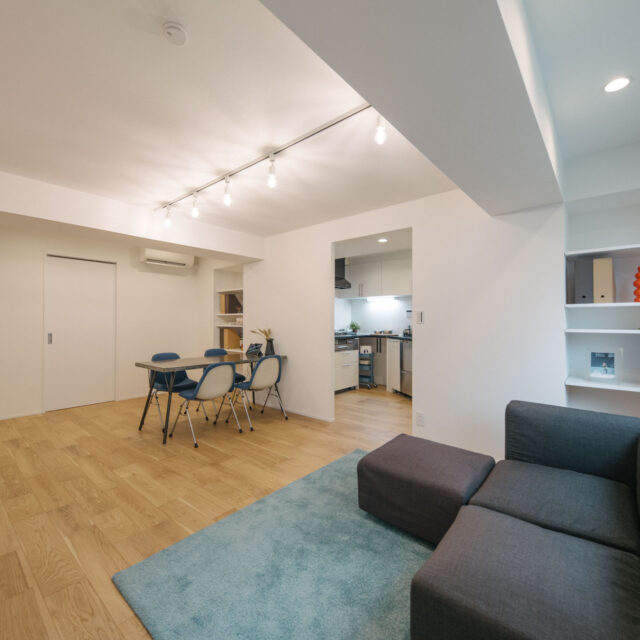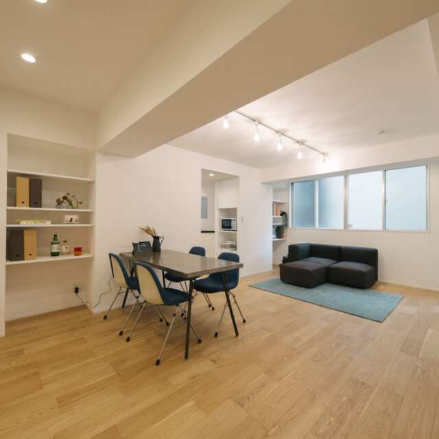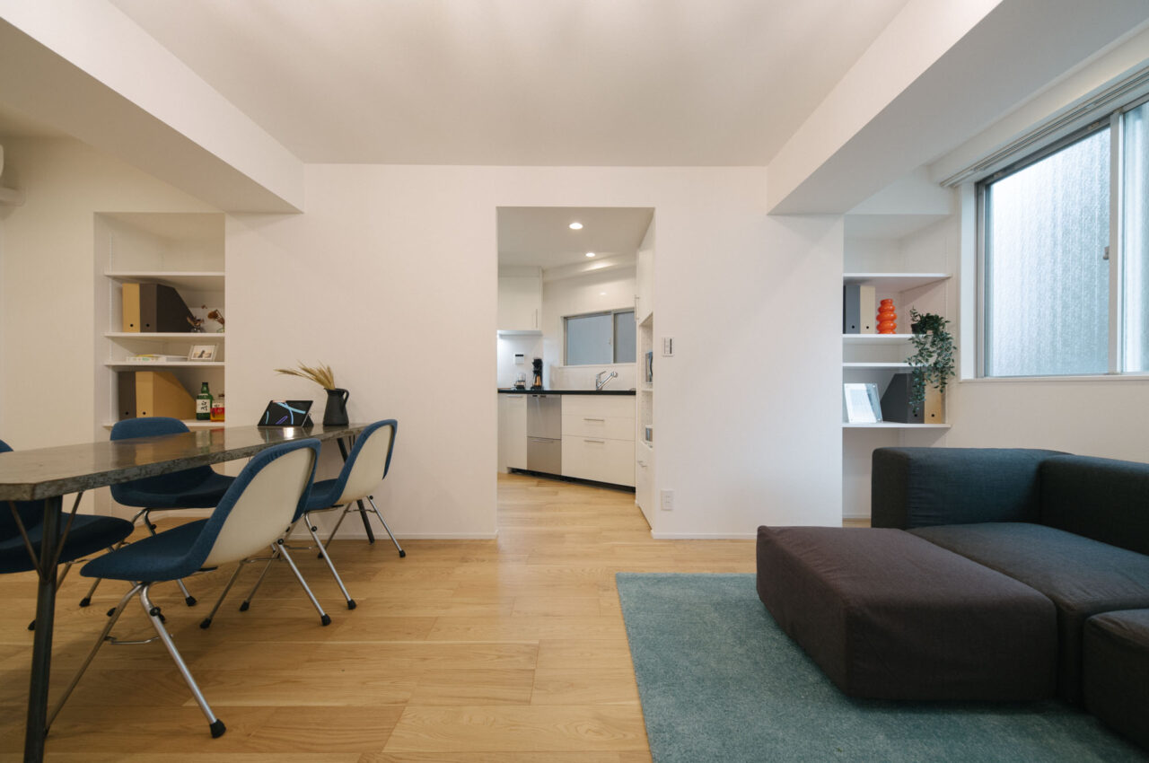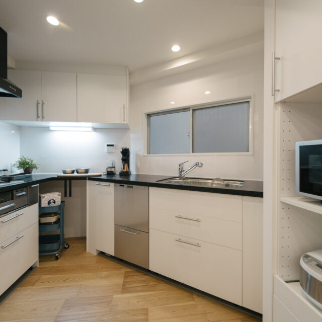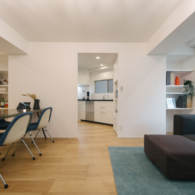 中央線のターミナル駅の三鷹南口から商店街をぬけて徒歩6分、土地持ち分は所有権、白いタイル貼りの総戸数14戸、ペットと暮らせる物件です。室内は約68㎡、ユニークなへの字型キッチンのある広めのリビング、暮らしの機能が満遍なく配置された3LDK、好立地で割安なプライスが魅力の物件です。