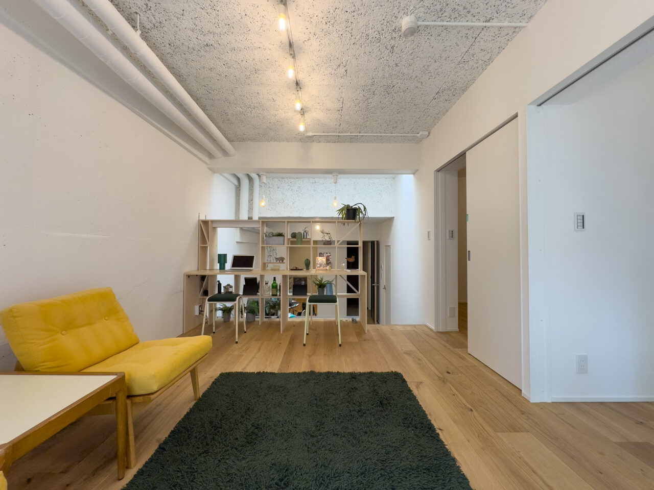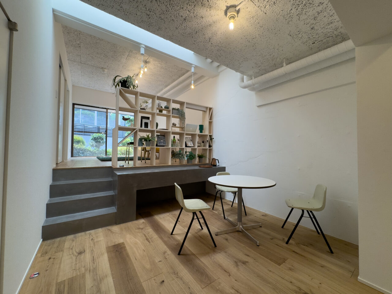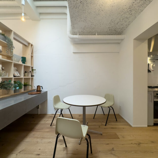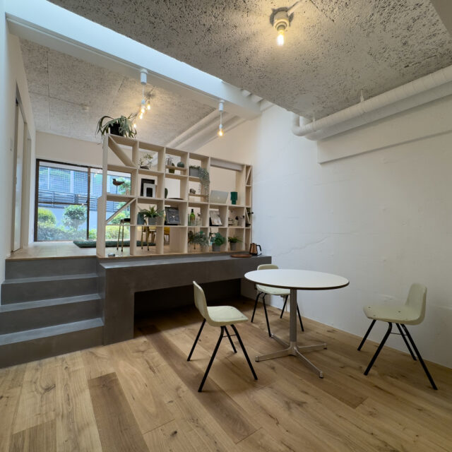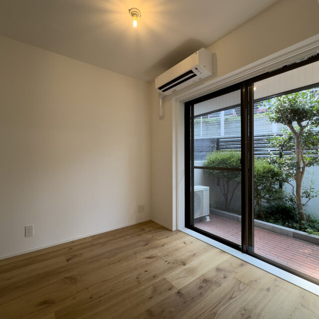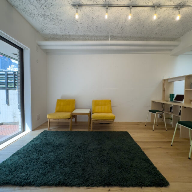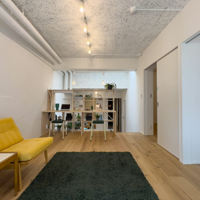 ロシア大使館裏手の狸穴町、鼠坂の途中の閑静な住宅街に建つ白いタイル貼りの2匹のペットと暮らせるマンションです。室内はたっぷり収納を確保した1SLDK、RC躯体や梁、木毛板の天井、オーク材の床など武骨なイメージの空間にテラスと小さな庭が気持ちのいいお部屋です。