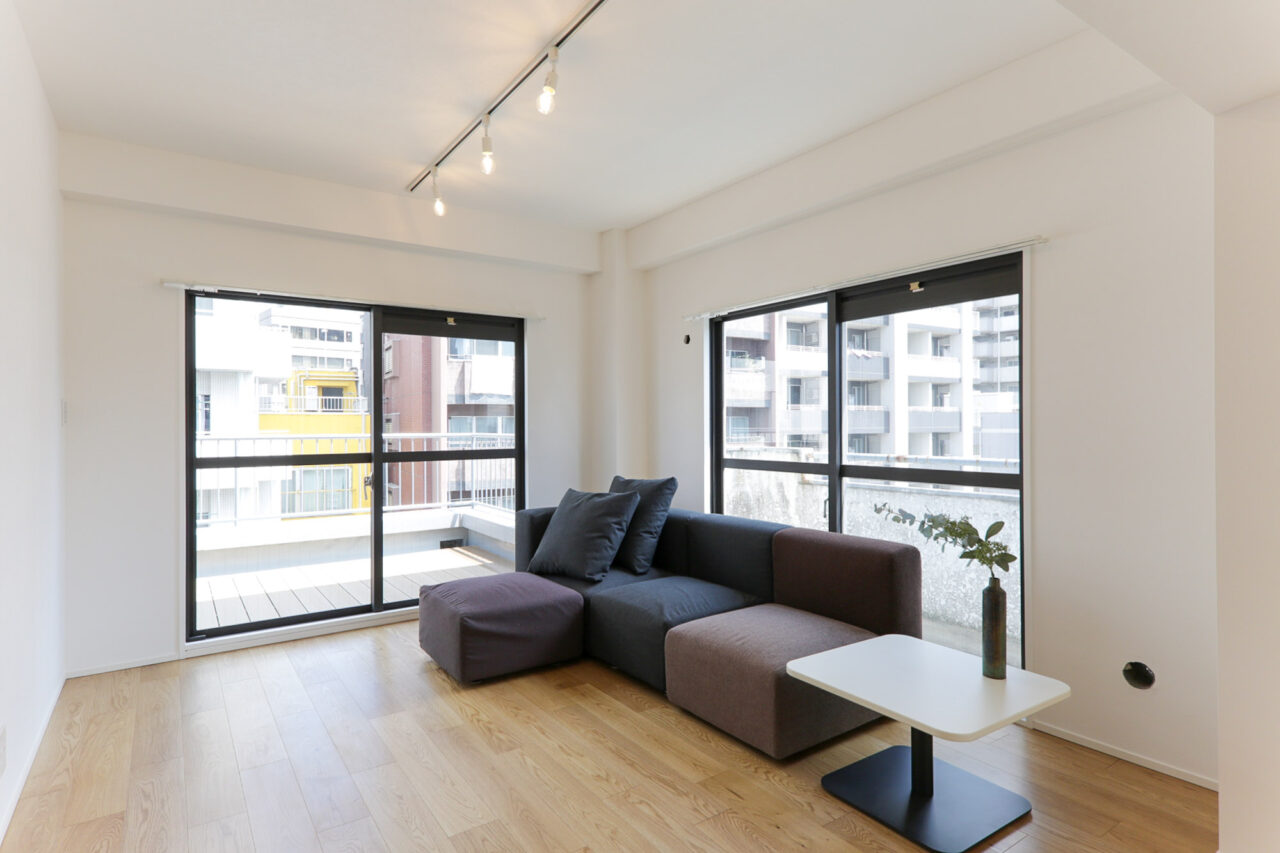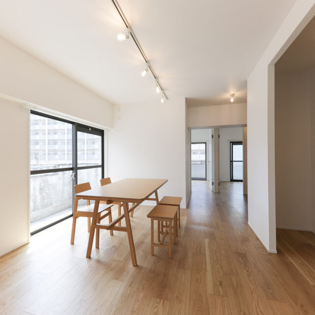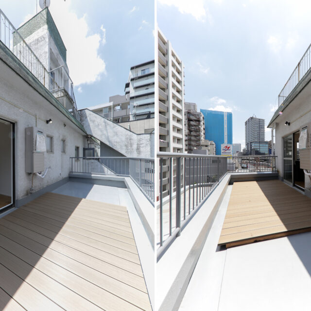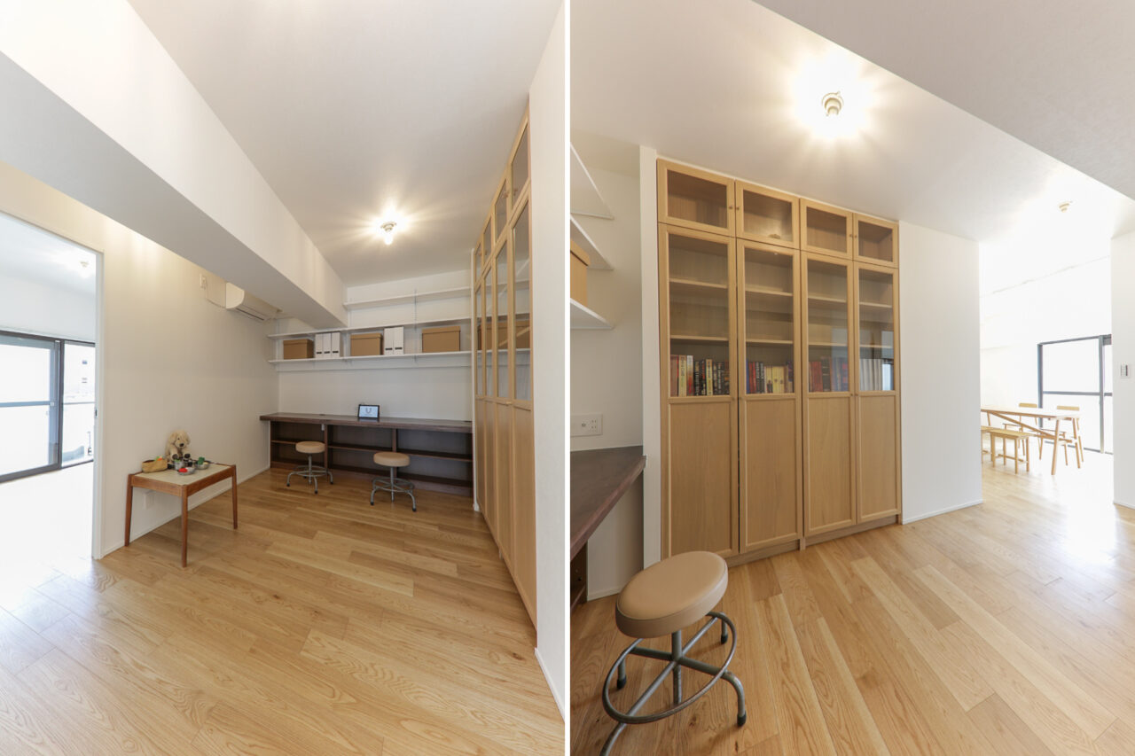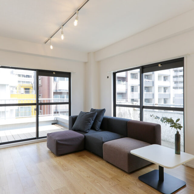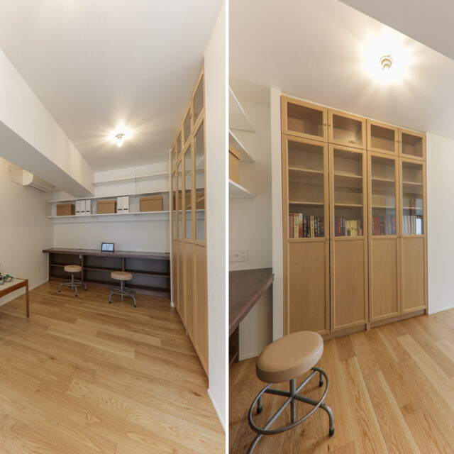 笹塚駅から線路沿いに徒歩3分、室内窓先のすぐそこにプラットフォームが見えるほどの駅前立地です。電車の音はうるさいけど、終電から始発までは静かなはず。広いルーフバルコニーにつながるLDKはくつろぎの空間、天井までの本棚と、2人が使えるデスクのあるセカンドリビングは、子供の勉強、大人の在宅ワークなど学びと仕事の空間です。約76㎡の面積を、寝室へはベッドが置けるスペースにミニマイズし、家族が過ごす共用空間に思い切ってスペースを割り振った2LDKのお部屋です。