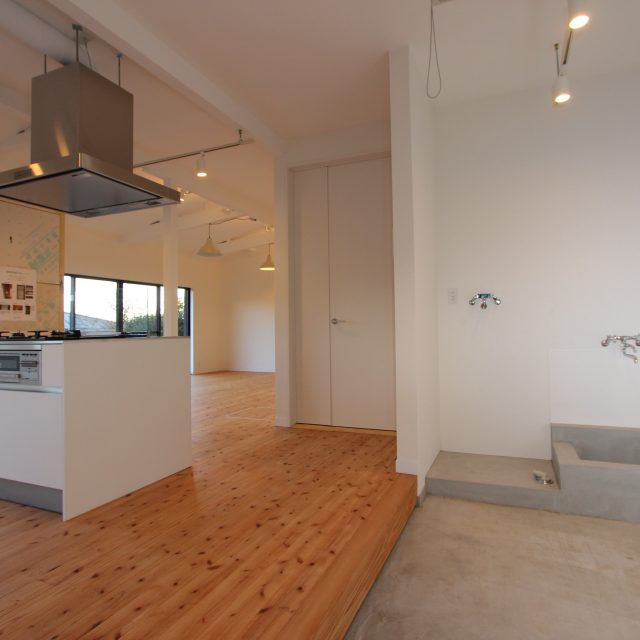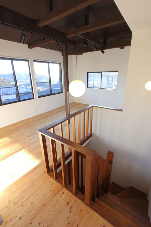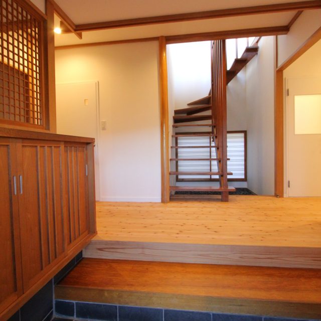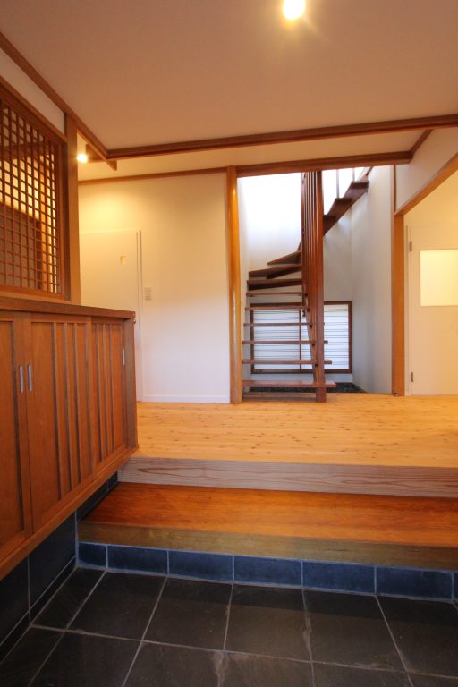 石塀の階段を上るとまず目の前に現れる玄関の引き戸は、再利用。玄関を開けるとまず目の前に飛び込んでくるのは、2階に続く階段。そして左手には質の良い木材を使用した造りつけの下駄箱が。その上にはうっすらと光が漏れる組子のパーテーションがあります。実はこれら全て、前の持ち主の方からそのまま引き継ぎ、きれいに洗いをかけたもの。もともと非常にこだわりのある住宅だったからこそ成せる和モダンが、ところどころに見え隠れしています。