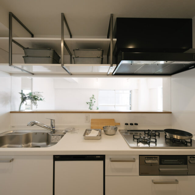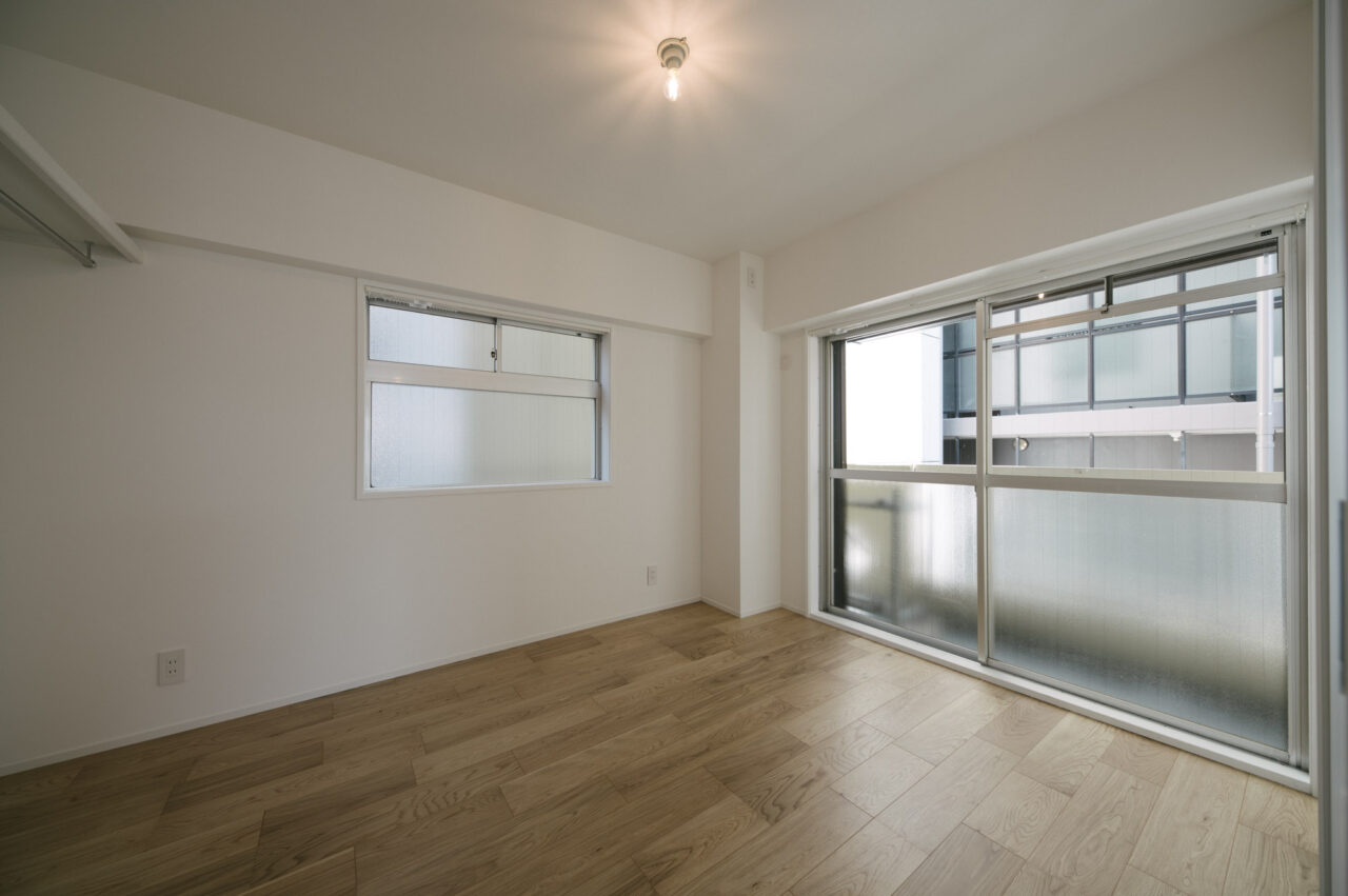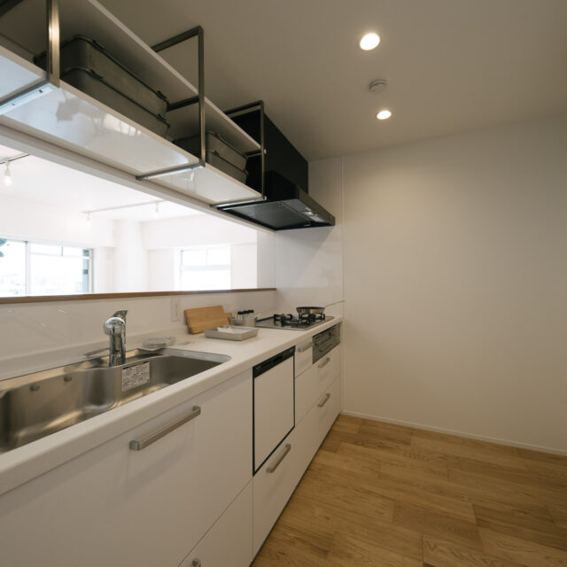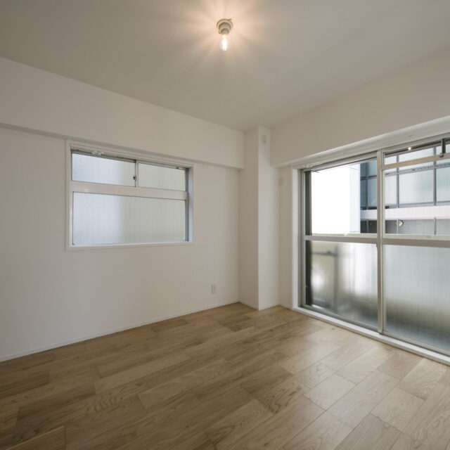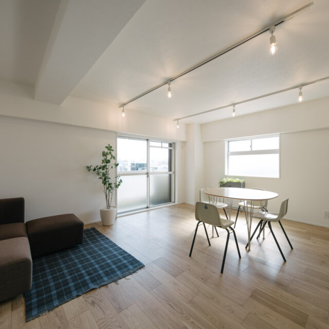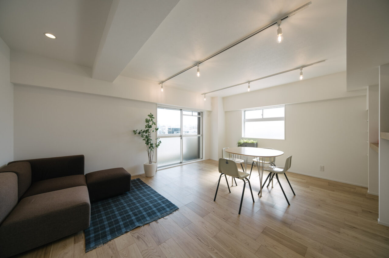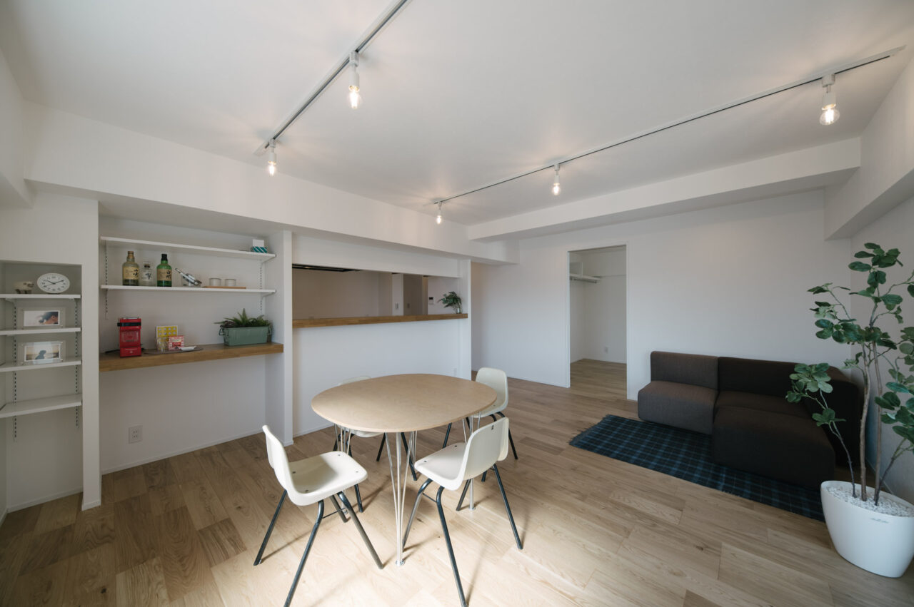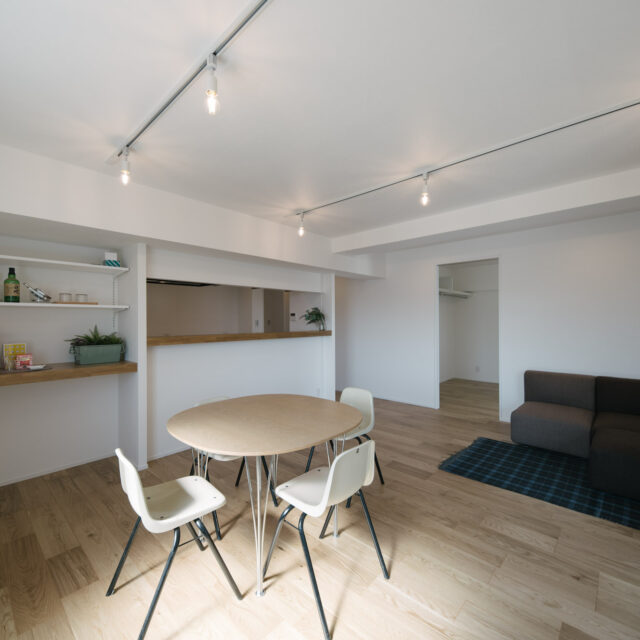 今回、前オーナーが新築分譲時に2部屋分を合体させた約60㎡の事務所タイプをウダツが取得、それを2LDKの今の暮らしに合った間取りへ全面改装しました。セミオープンのカウンター付キッチン、約15Jの広めのLDK、SIC、WIC等の各種収納等、奇をてらわず暮らしに必要な機能がまんべんなく配置されたお部屋です。