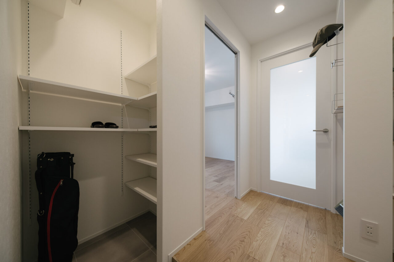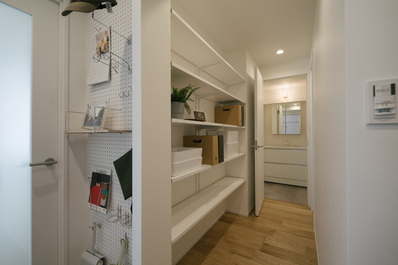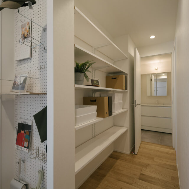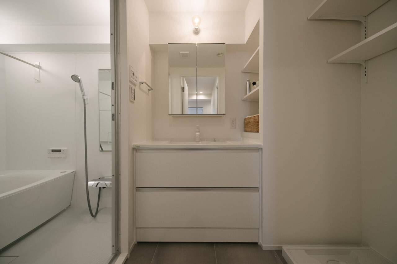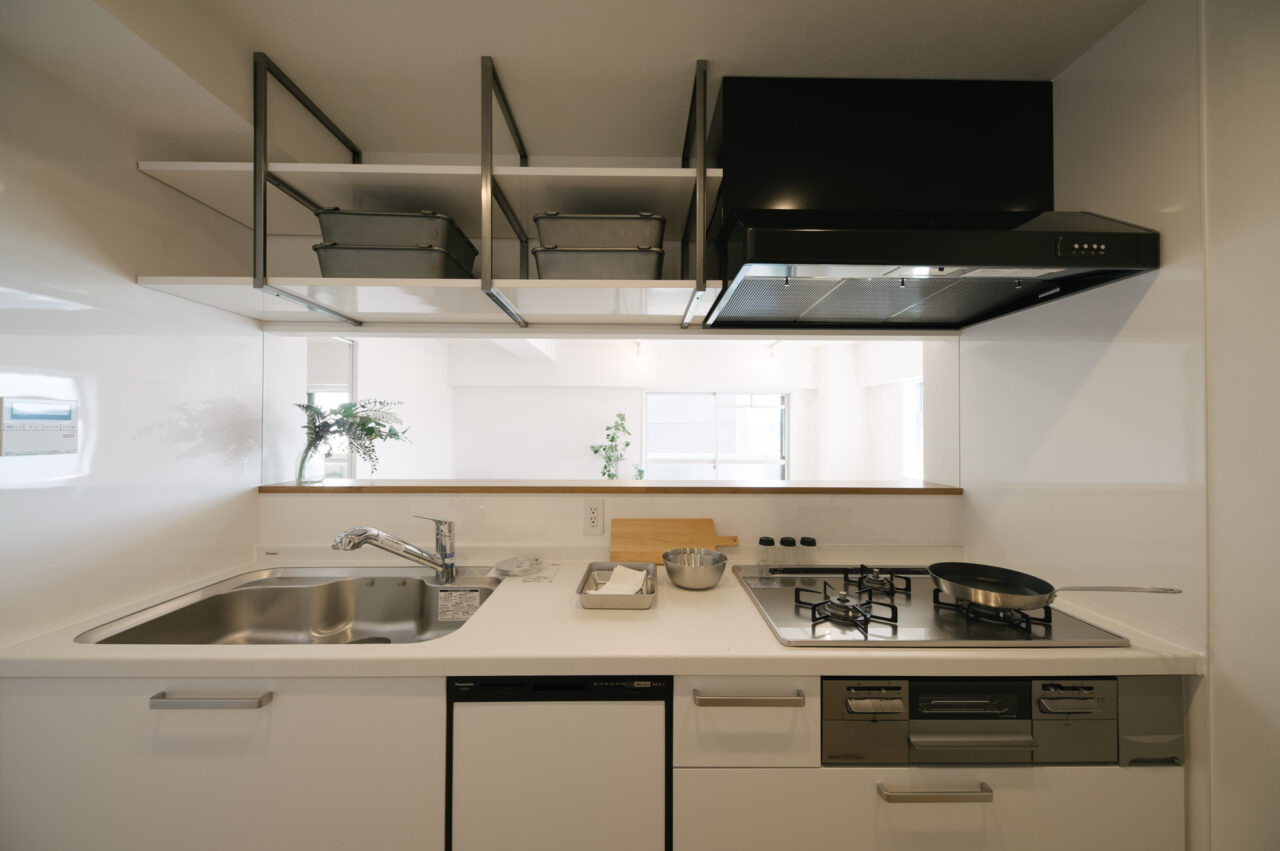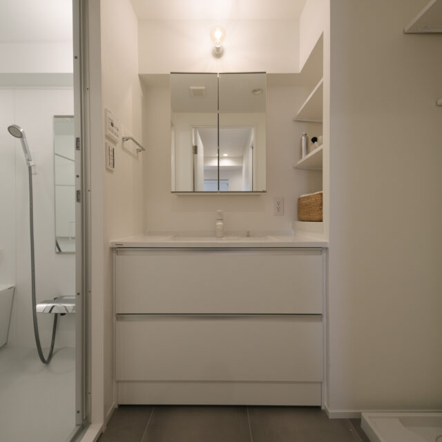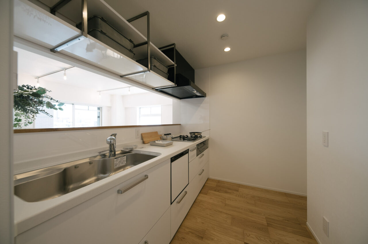 今回、前オーナーが新築分譲時に2部屋分を合体させた約60㎡の事務所タイプをウダツが取得、それを2LDKの今の暮らしに合った間取りへ全面改装しました。セミオープンのカウンター付キッチン、約15Jの広めのLDK、SIC、WIC等の各種収納等、奇をてらわず暮らしに必要な機能がまんべんなく配置されたお部屋です。