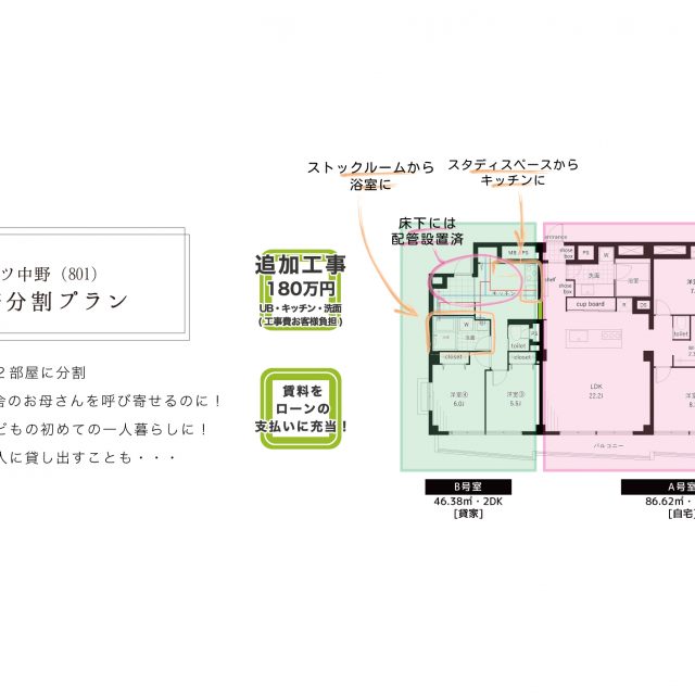 また、1部屋を賃貸することで、その収入を返済に回せば差額のみでお住まいいただくことも可能なライフステージに柔軟に対応できる変幻自在のお部屋です。