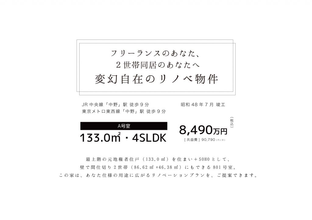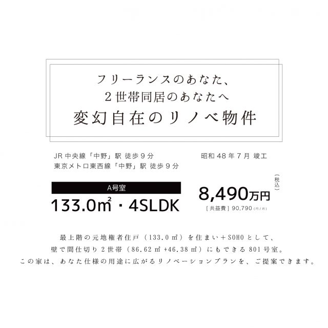 SOHO,2世帯求める人へ、この上なき最上階 中野