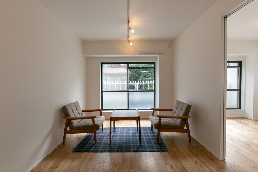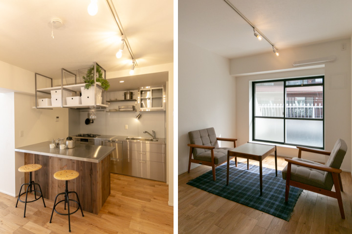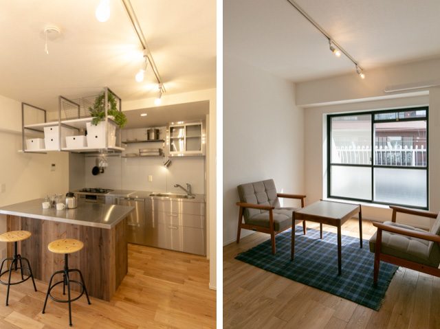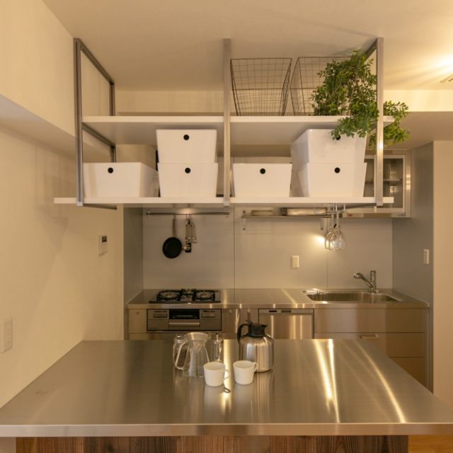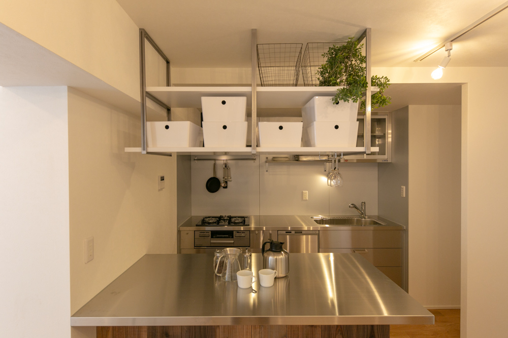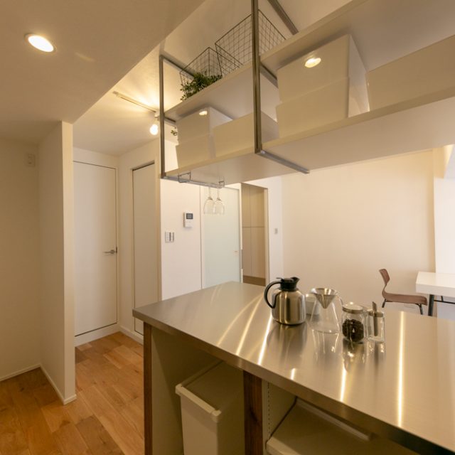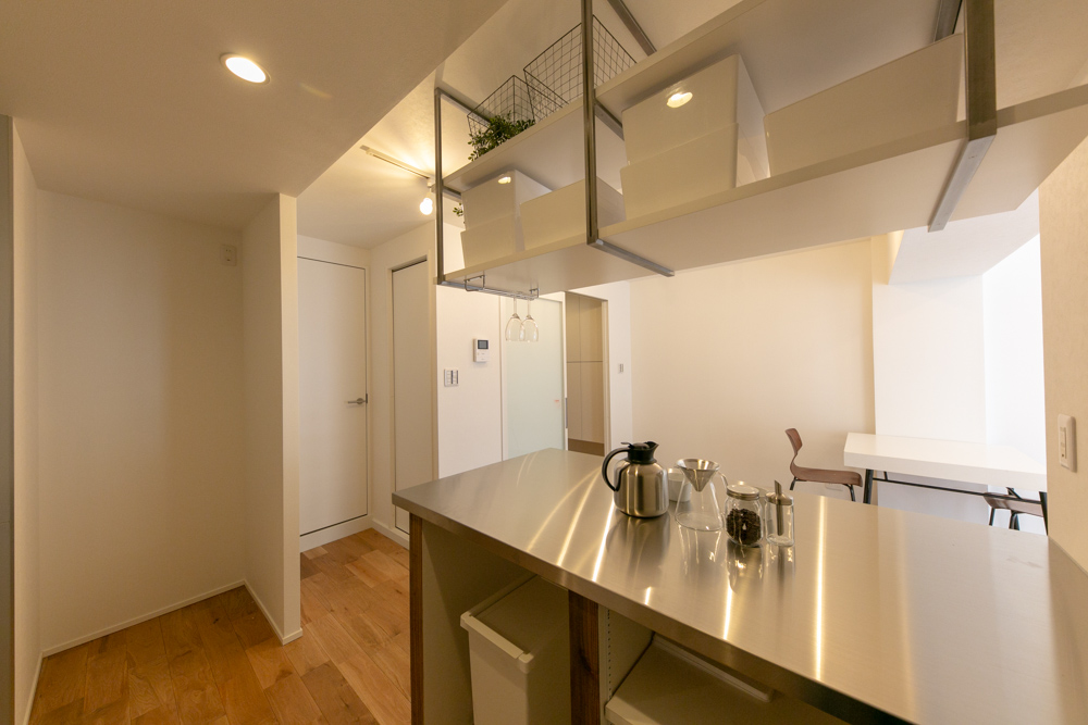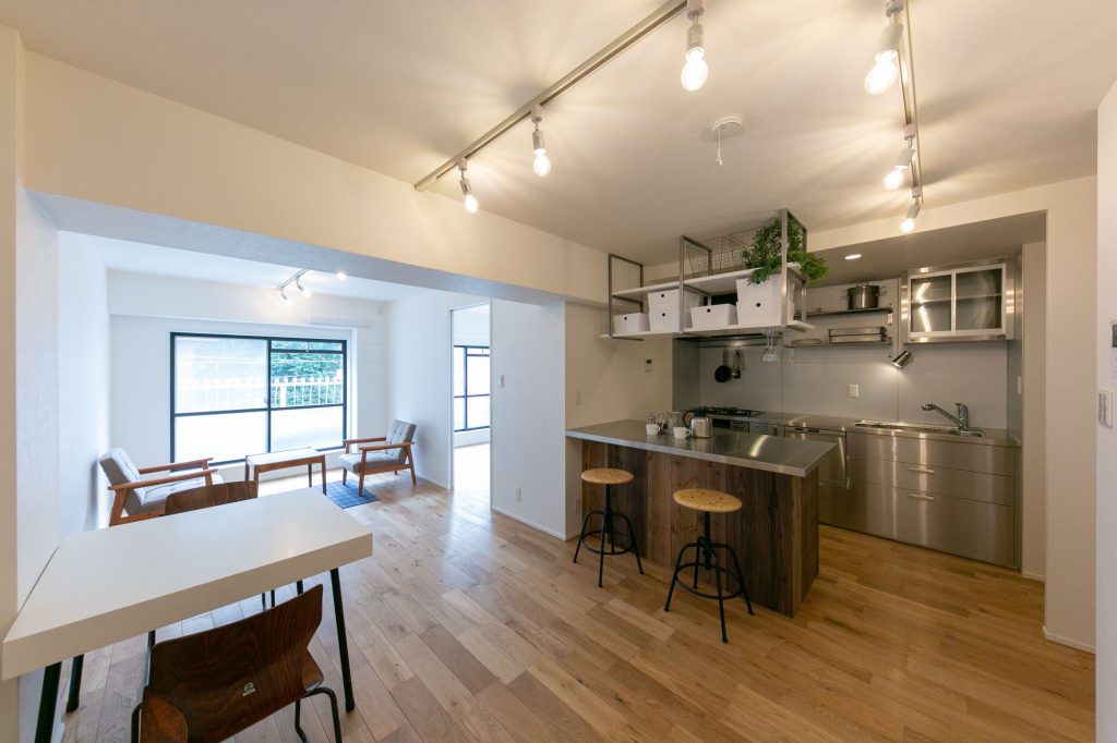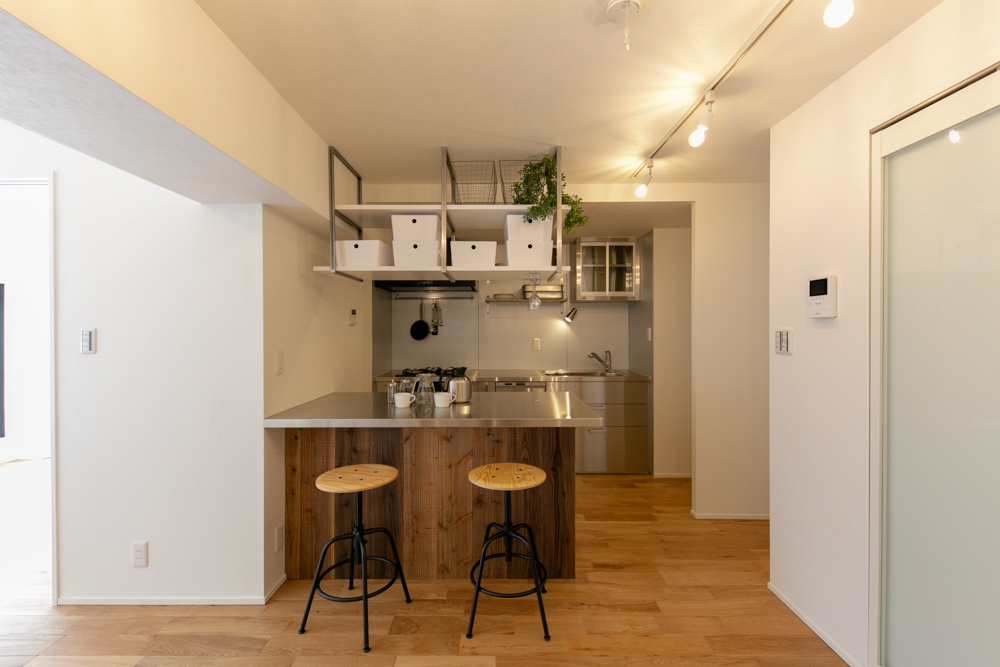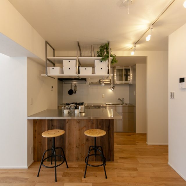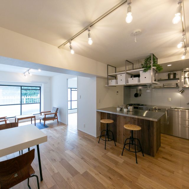 渋谷橋から恵比寿プライムスクウェアにほど近く、少し奥に入った閑静な立地です。広めのバルコニーのある49㎡を1LDKにリノベーションしました。フローリングにはオーク材の無垢フローリングを使用しており、無骨に仕上げられたキッチンはオールステンレス製です。キッチン奥には隠せる収納にぴったりのパントリースペース、ダイニングにもなる作業カウンターはきっと料理が楽しくなります。バリバリ仕事する恵比寿フリークの方にぴったりです。