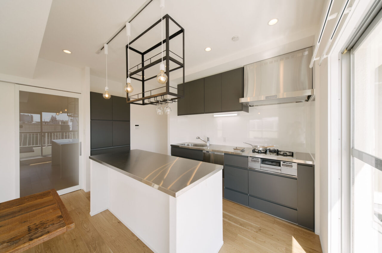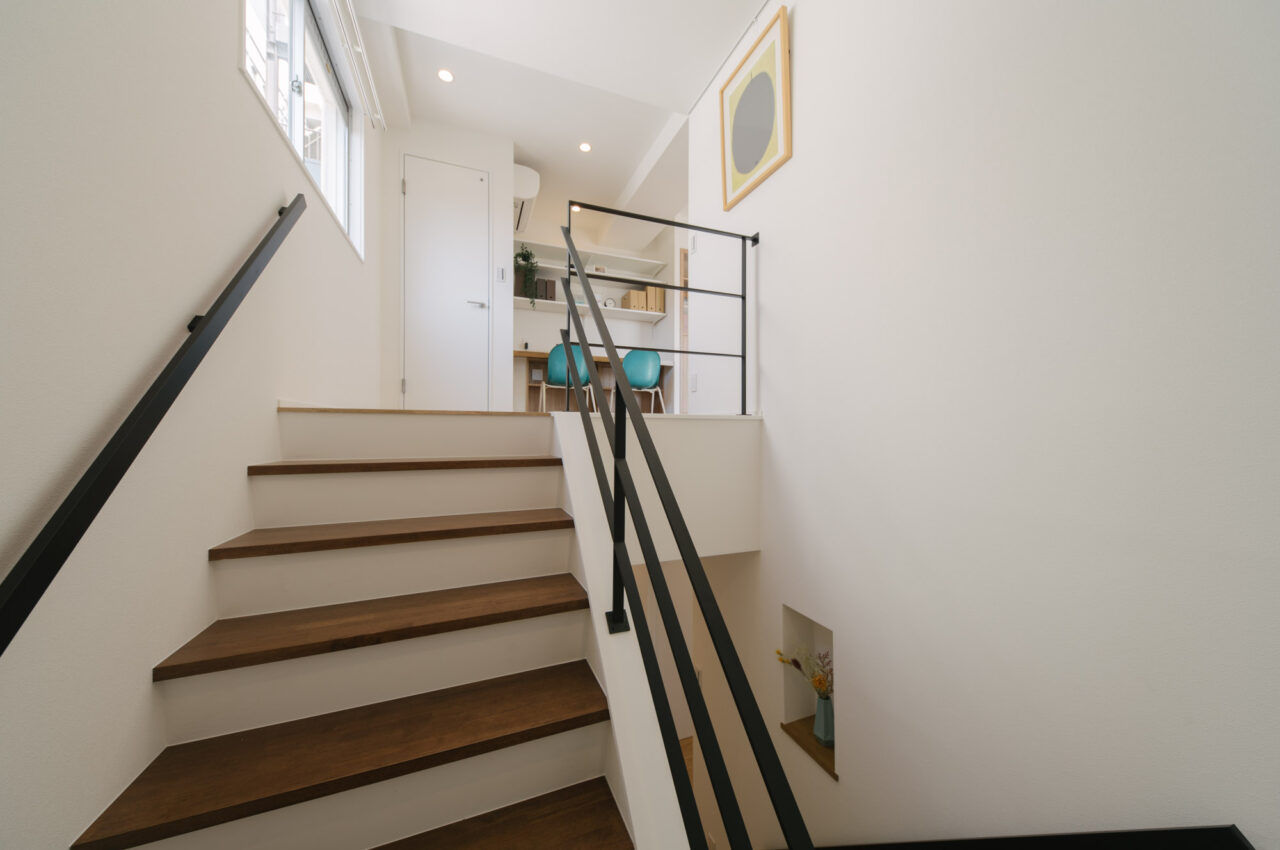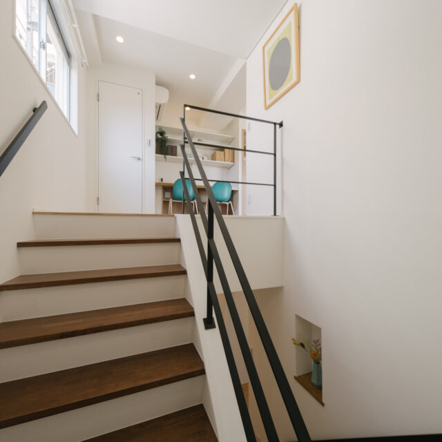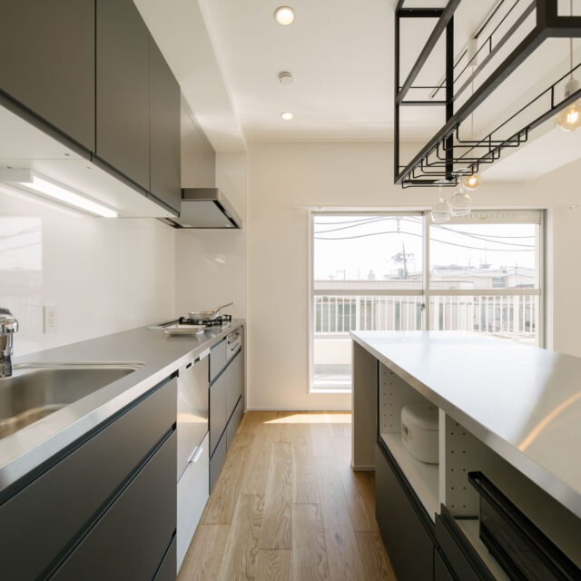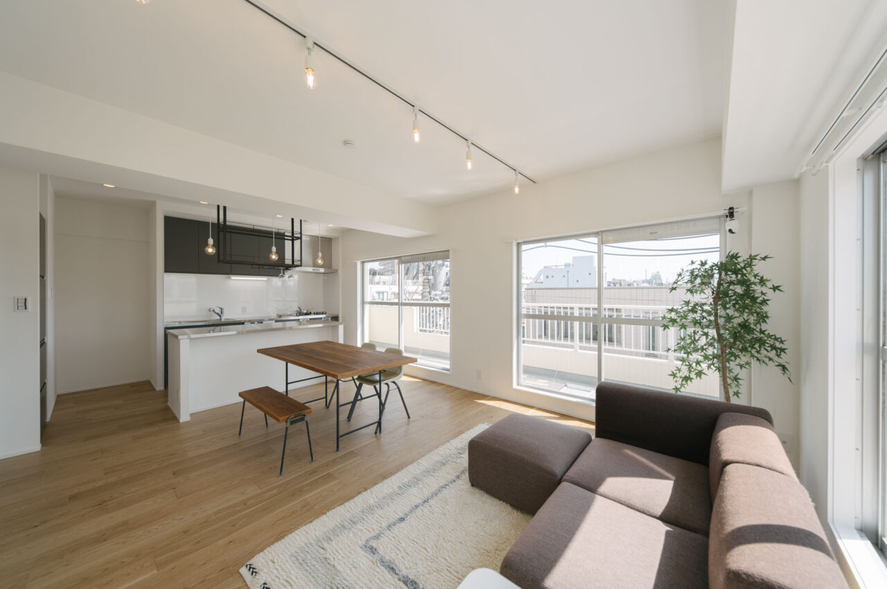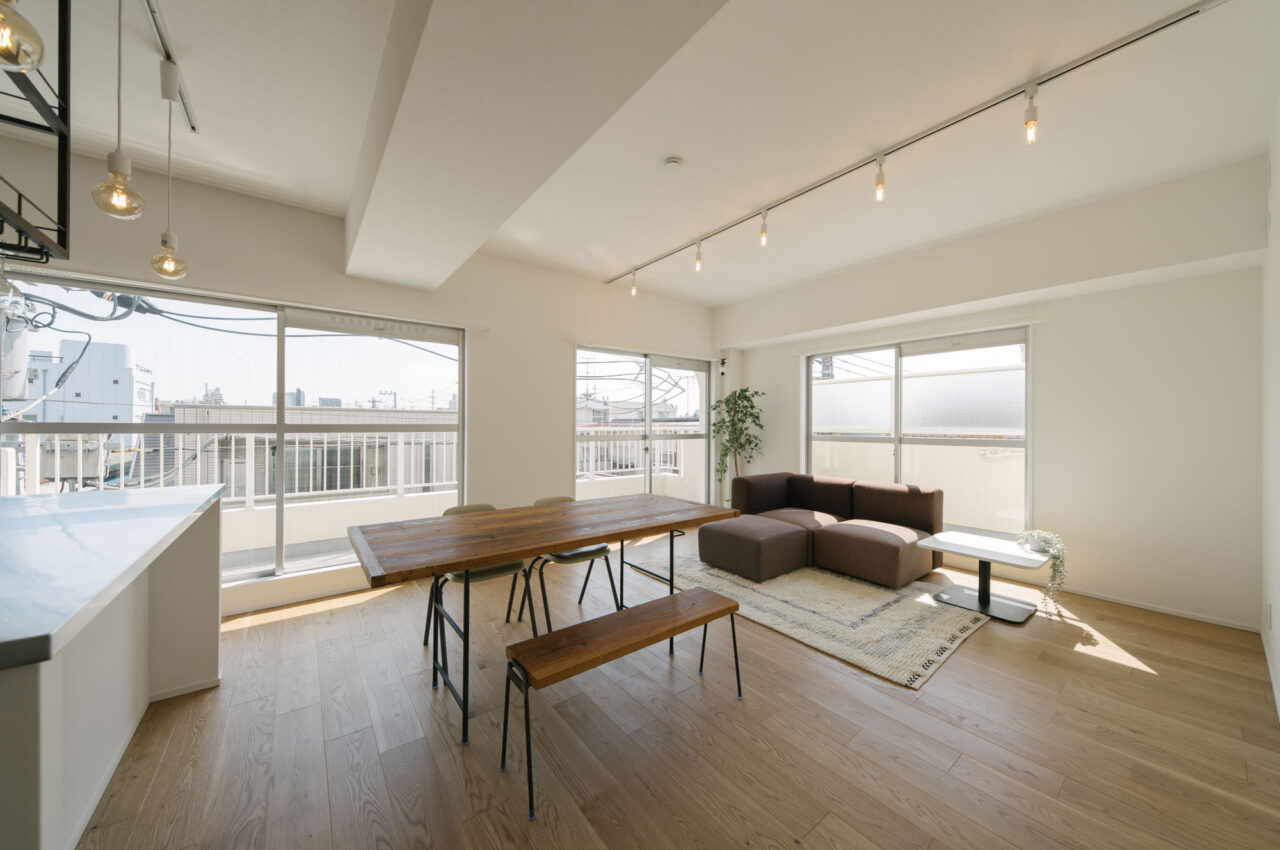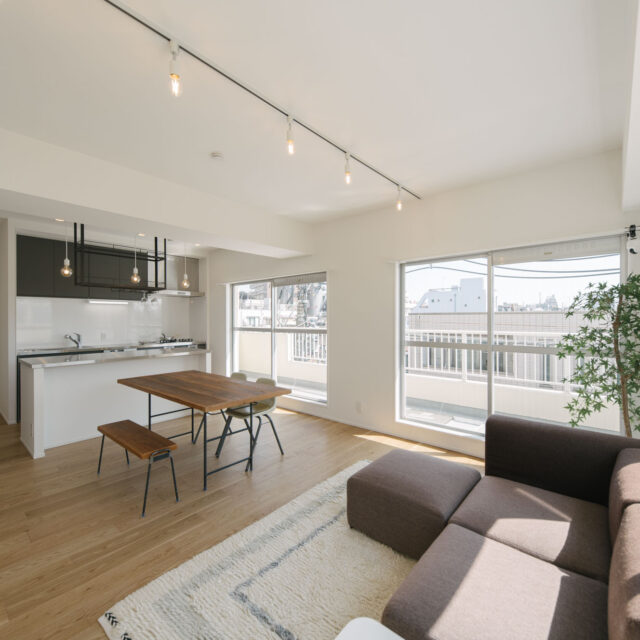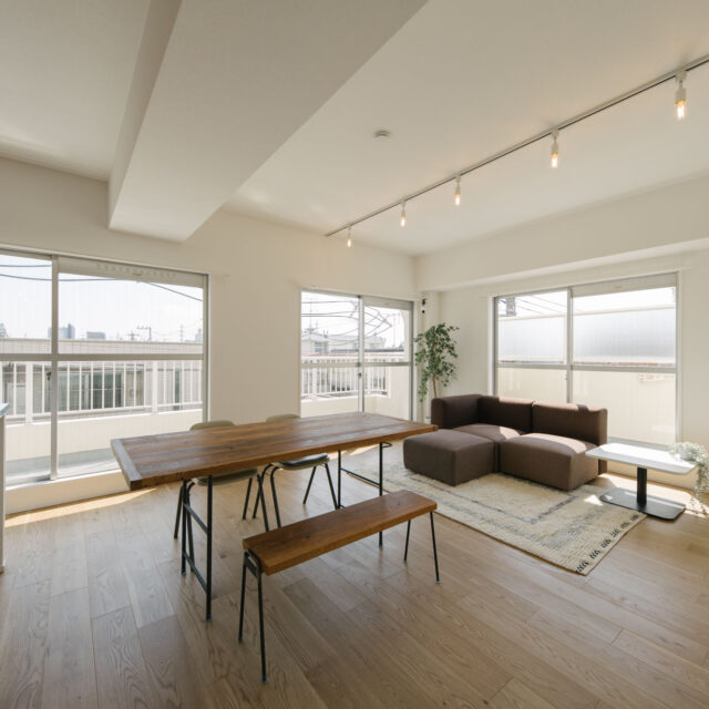 JR高円寺南口、パル通り商店街のアーケードを抜けて徒歩4分、1階に西友が入居する便利なこと極まりない好立地です。地主は近所のお寺さんの借地権(地上権)、室内は110㎡の広さを存分に活用したメゾネットタイプのリノベーションです。