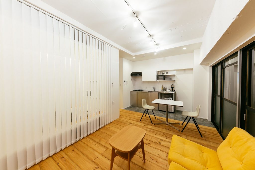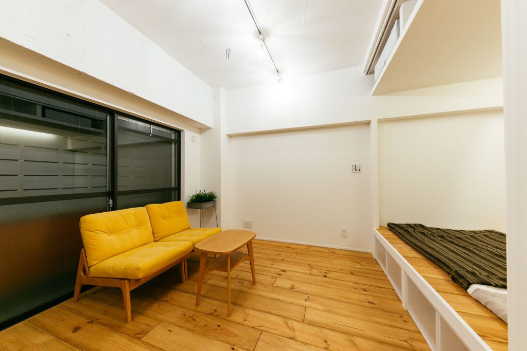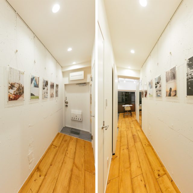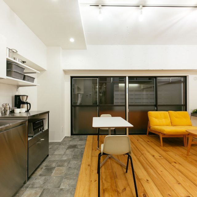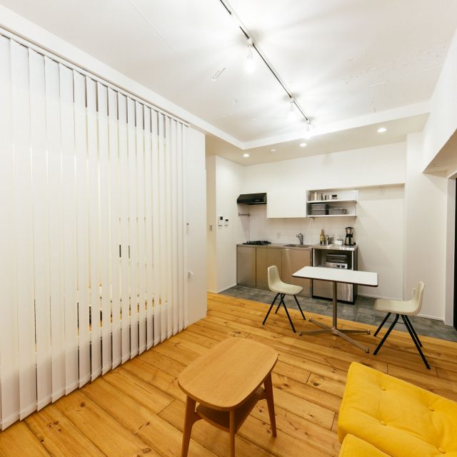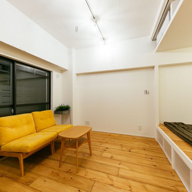 目黒五反田が生活圏で、かむろ坂の桜並木や林試の森公園が徒歩圏にある豊富な緑とフットワークが魅力の立地です。室内は武骨でシャープな男前風の仕上がりが共用部分とは異次元の雰囲気です。寝る場所はミニマムサイズの空間をつくってブラインドで仕切りました。1階のセキュリティなどさほど気にならない!といったインドア派の方にぴったりのお部屋に仕上がりました。