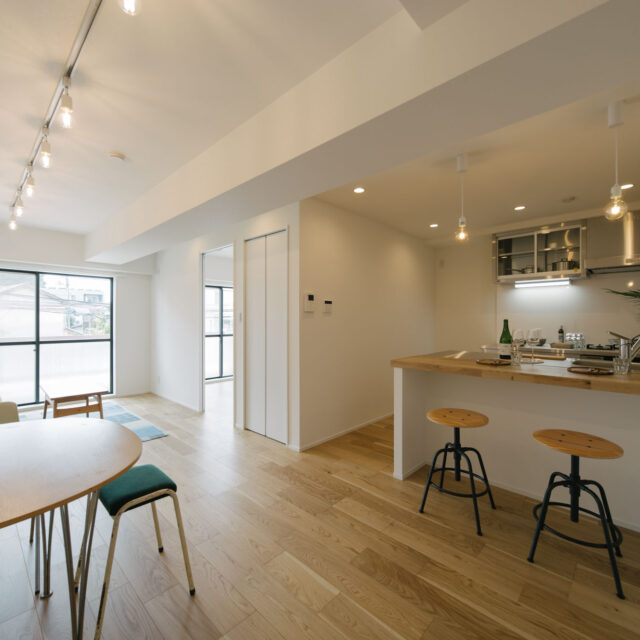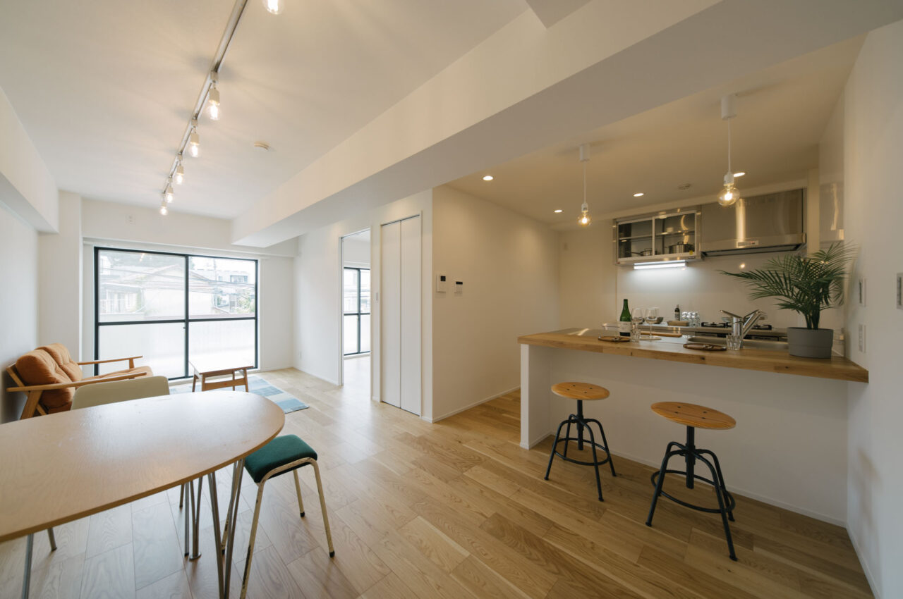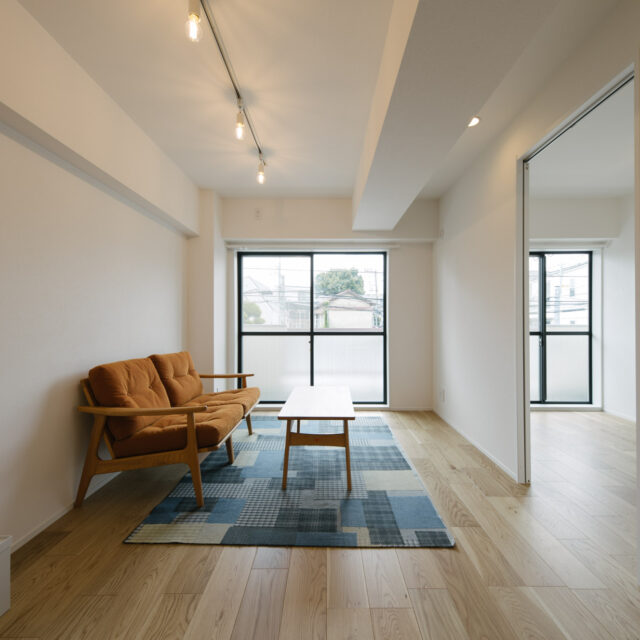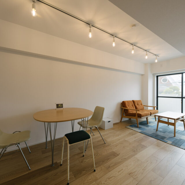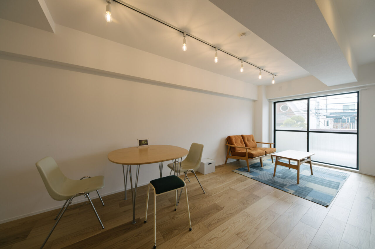 丸の内線新高円寺と方南町のちょうど中間点、個性的な飲食店や古着屋が建ち並ぶ高円寺がお散歩圏で、住宅価格が割安な立地です。建物はEVの無い4階建ての2階部分、寝室と水回りをミニマイズ、その分収納とLDKへ面積が割り振られたデッドスペースの少ない1LDKのリノベーションです。