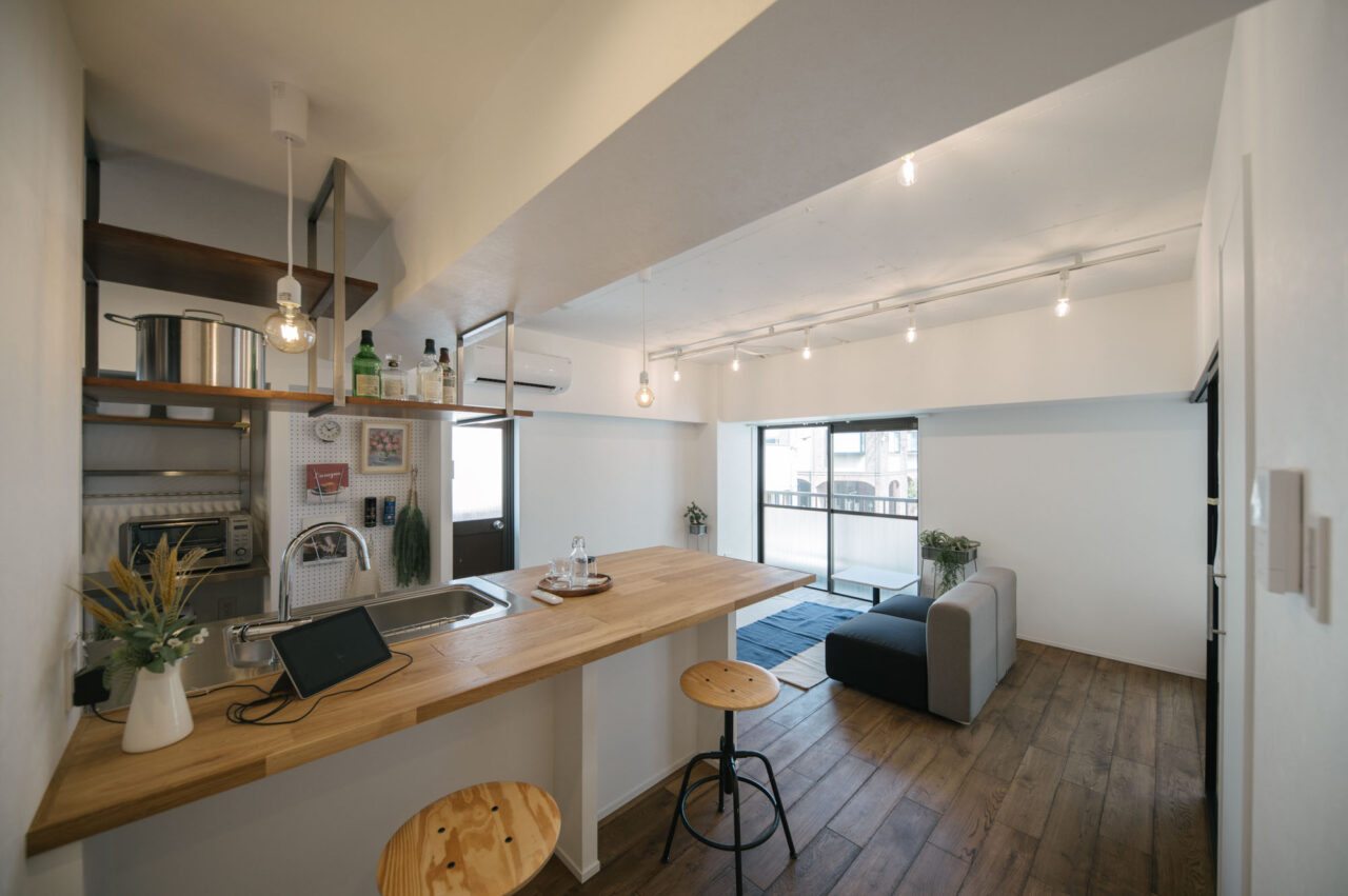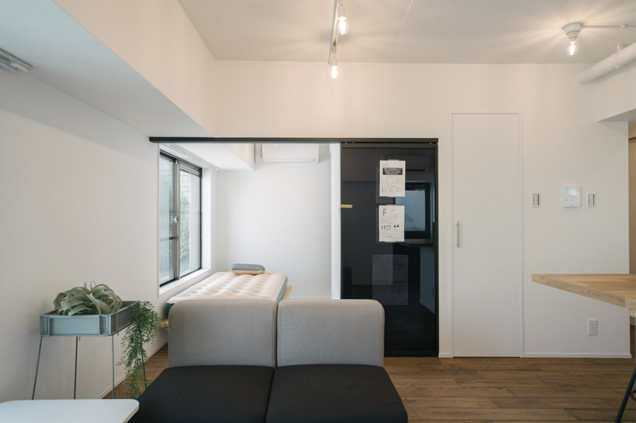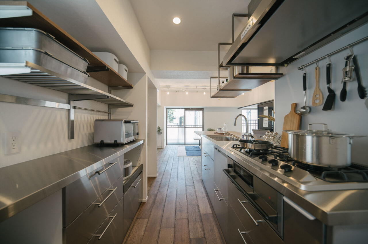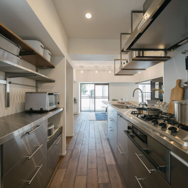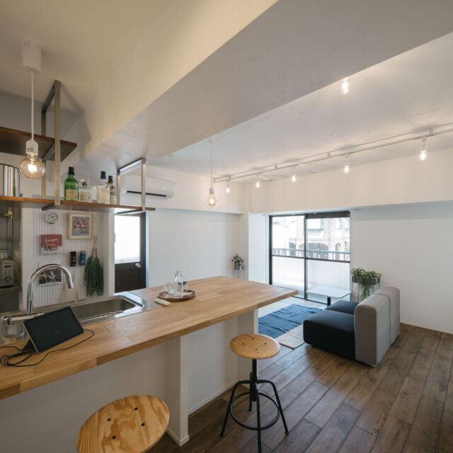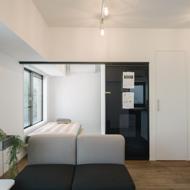 青山、六本木、広尾の中間地点の西麻布、交差点から根津美術館へ抜ける道沿いの立地です。建物はこじんまりとした14世帯、室内は2人でも暮らせる41㎡のお部屋です。寝室をダブルベッドがギリギリ置ける大きさにミニマイズ、面積の大部分をLDKに振り分けました。ダイニングカウンターをドッキングさせたシステムキッチンは人を呼んでホームパーティーしたくなる西麻布らしいクールな設えです。