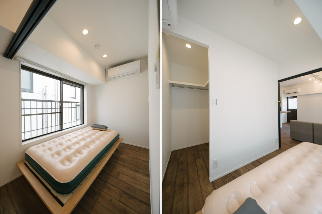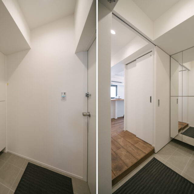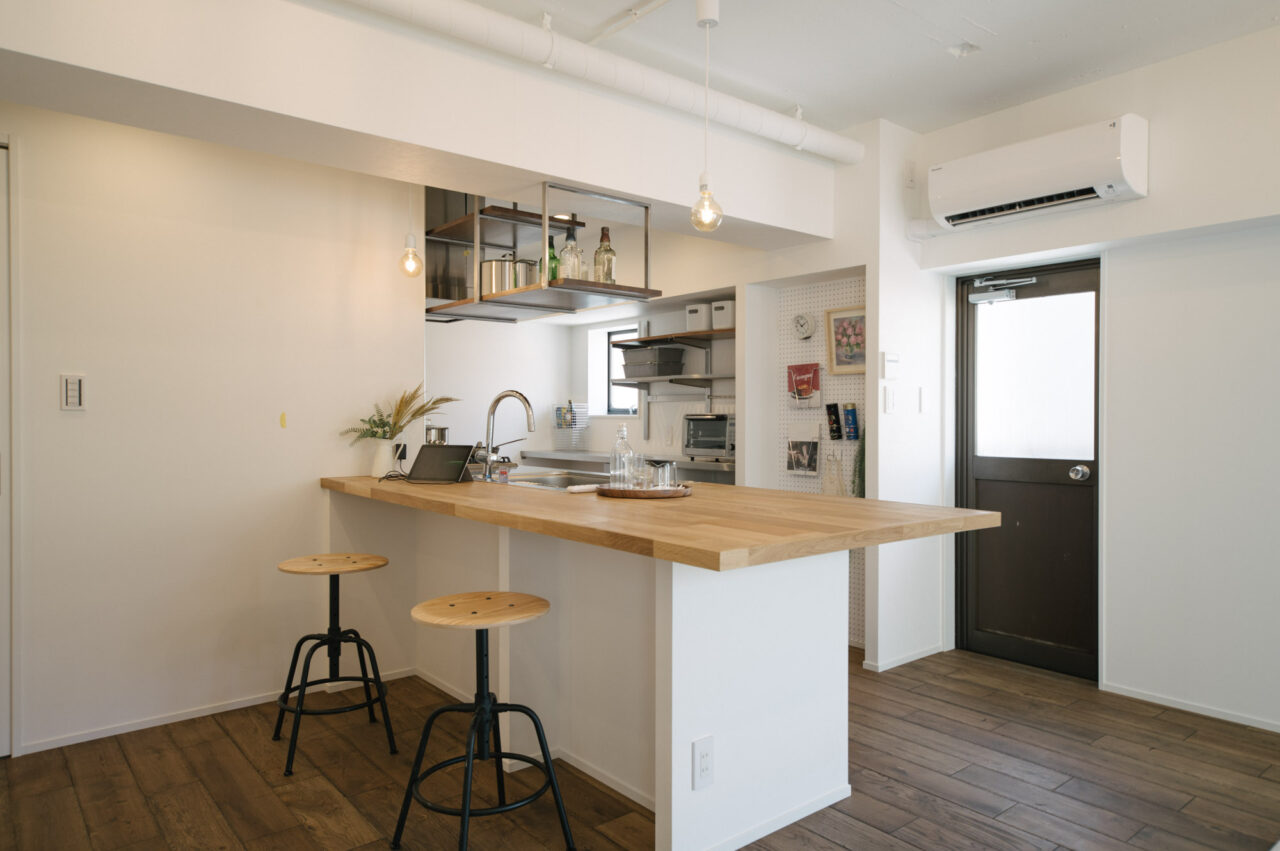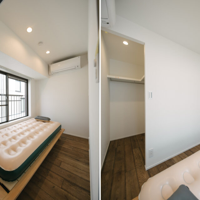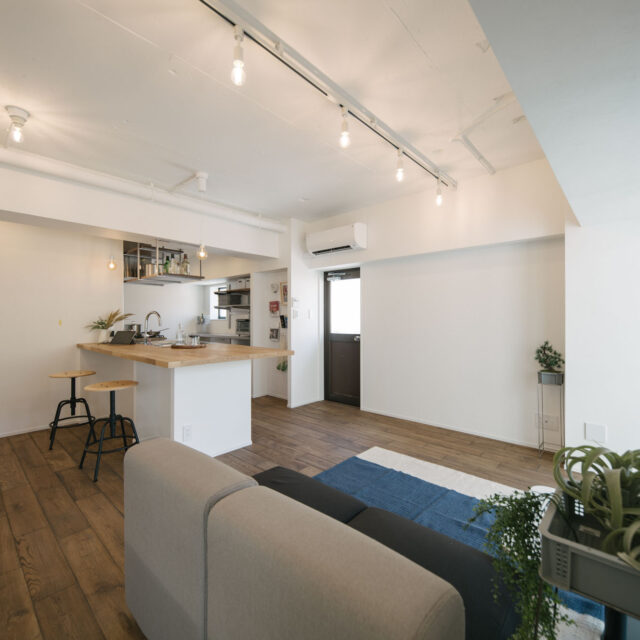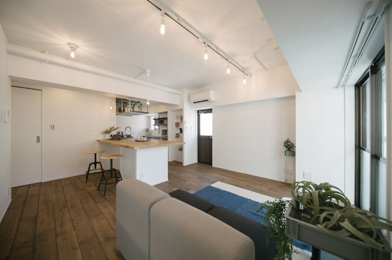 青山、六本木、広尾の中間地点の西麻布、交差点から根津美術館へ抜ける道沿いの立地です。建物はこじんまりとした14世帯、室内は2人でも暮らせる41㎡のお部屋です。寝室をダブルベッドがギリギリ置ける大きさにミニマイズ、面積の大部分をLDKに振り分けました。ダイニングカウンターをドッキングさせたシステムキッチンは人を呼んでホームパーティーしたくなる西麻布らしいクールな設えです。