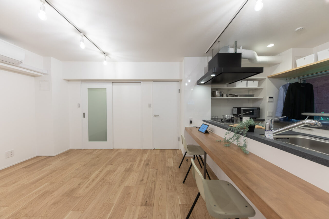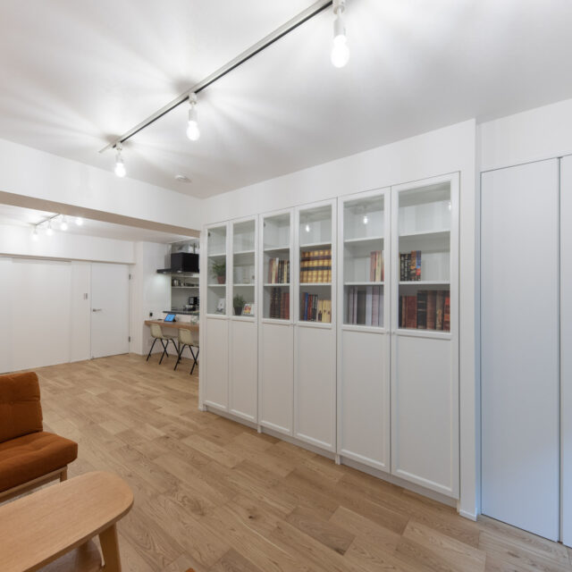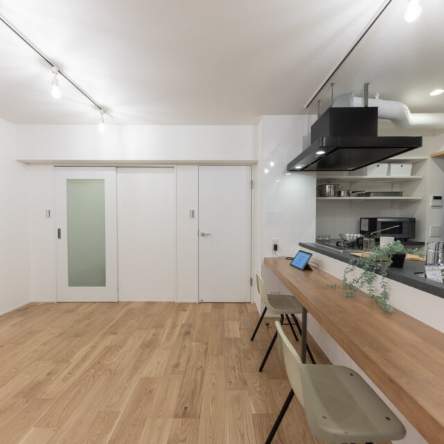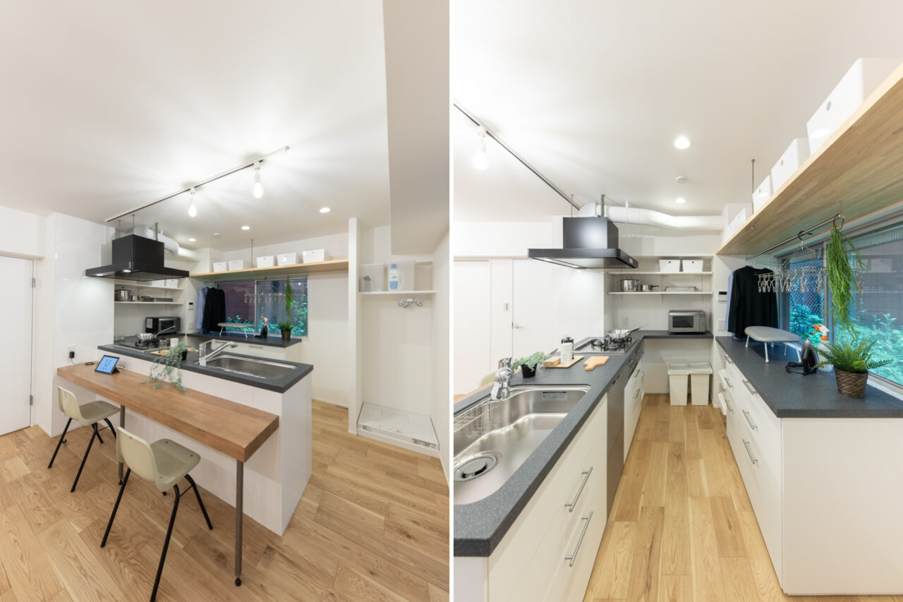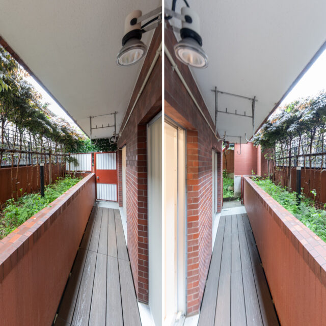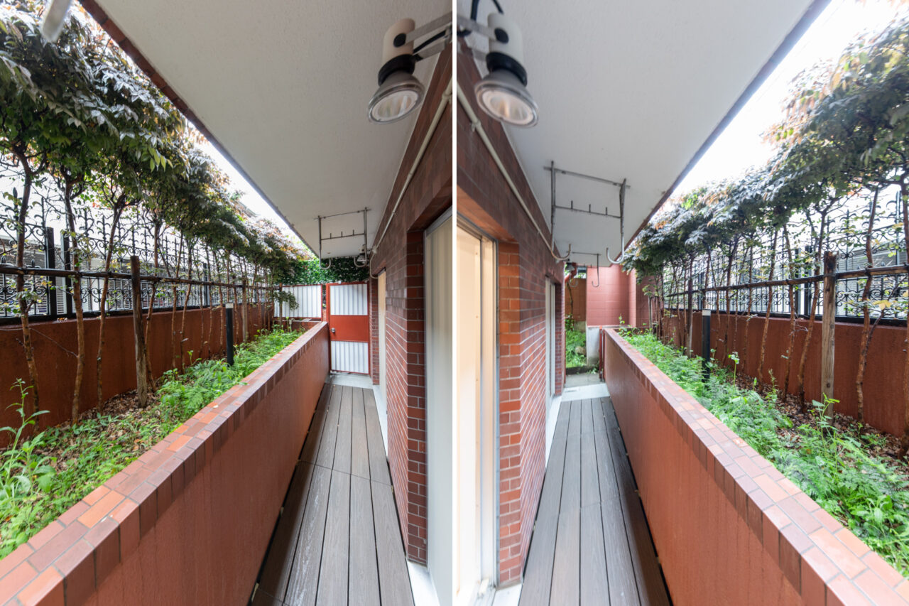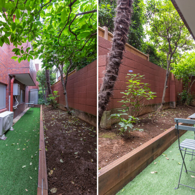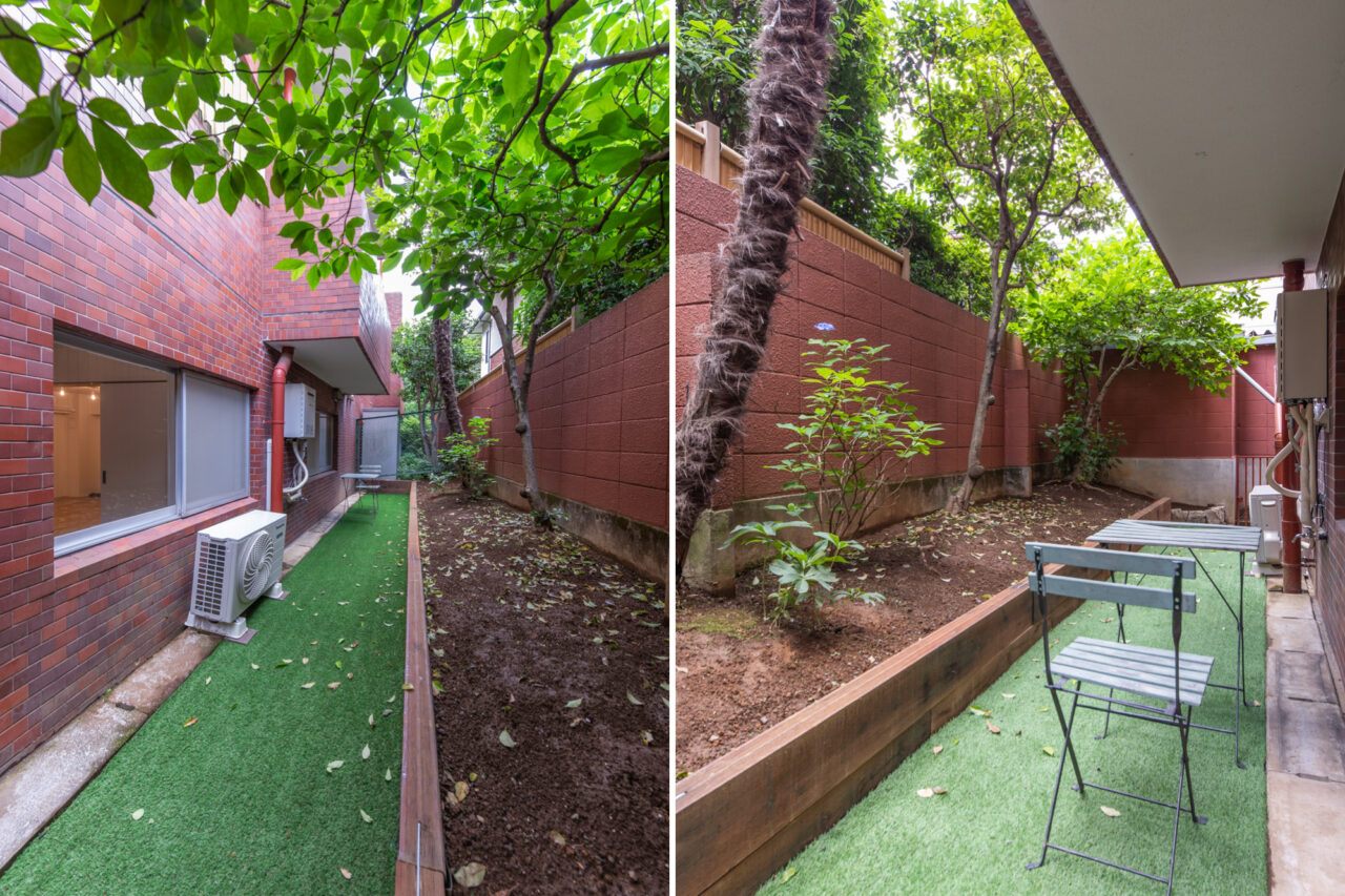 早稲田駅から徒歩3分、夏目漱石誕生の地「喜久井町」、便利で閑静な住宅地にひっそりと建つ小じんまりとした14世帯、4階建の建物です。室内は、2人が寝るのに必要最小限の広さの寝室がひとつ、その分面積をLDKに割り振りました。洗濯機置場をキッチンと並列に移設し、備付けの家事カウンターは、洗濯物を畳んだり、アイロンがけするにも十分な広さがあるから、2つの家事を併行してこなせるマルチスペースです。L字型で広めの専用庭(約27㎡)は、ガーデニングやDIYなどが趣味の人にとってはうれしい特典です。