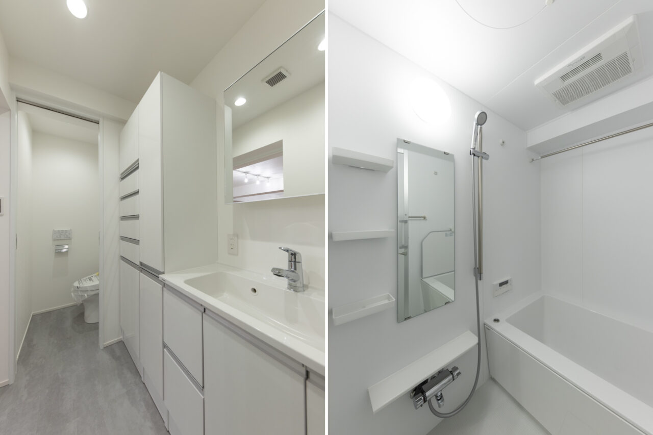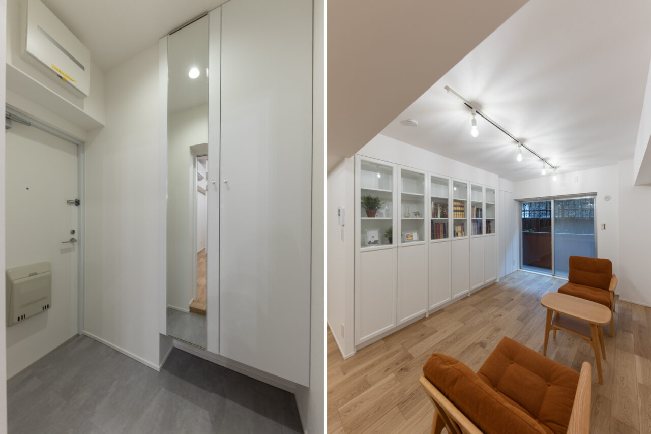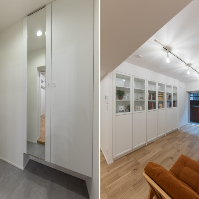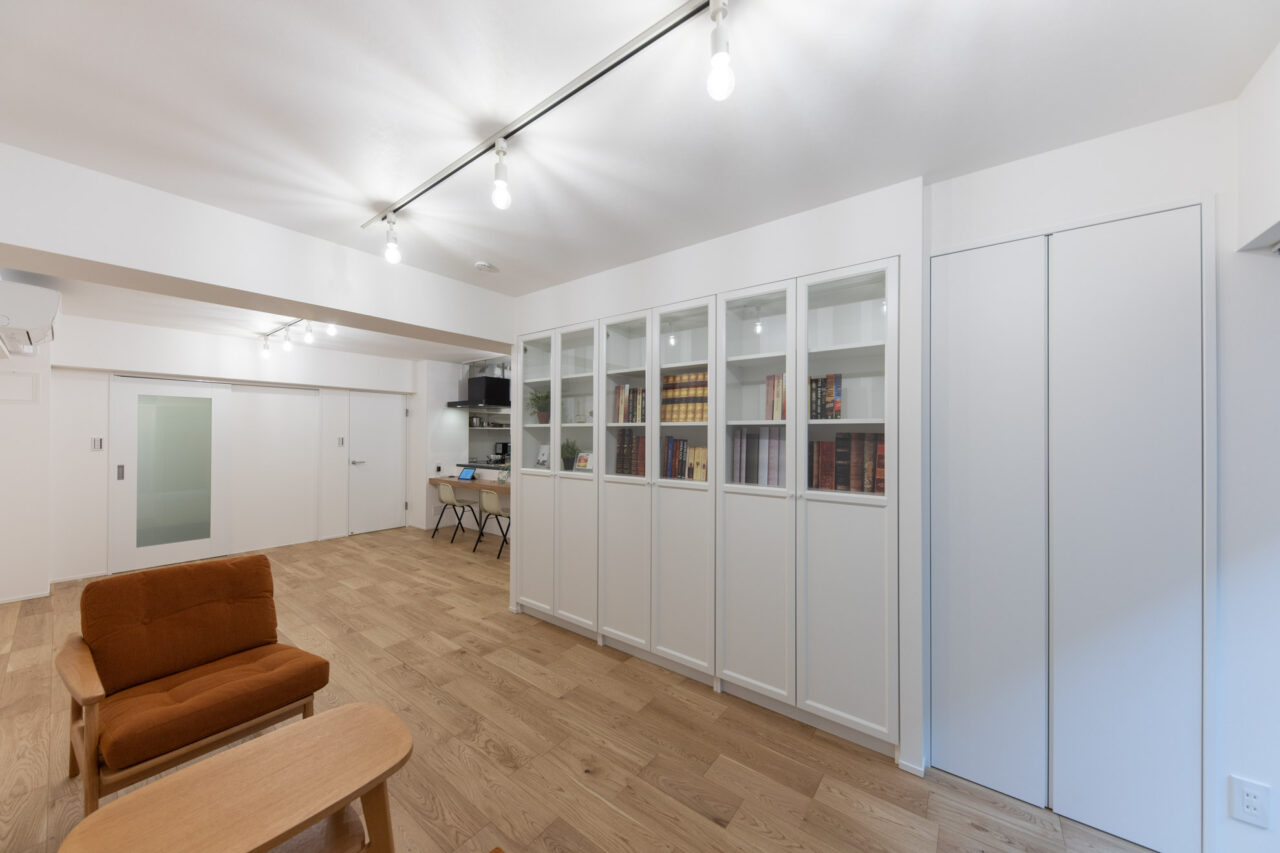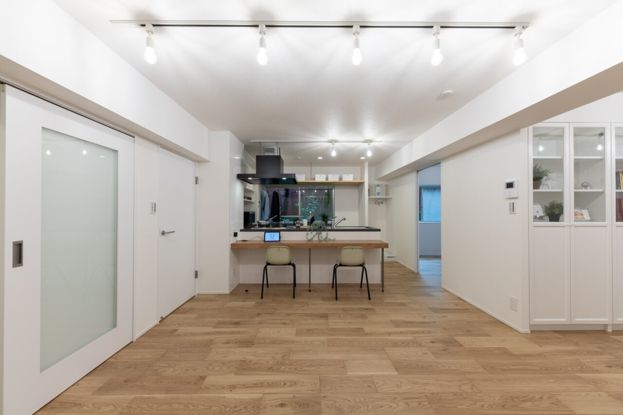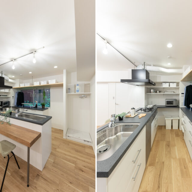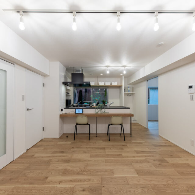 早稲田駅から徒歩3分、夏目漱石誕生の地「喜久井町」、便利で閑静な住宅地にひっそりと建つ小じんまりとした14世帯、4階建の建物です。室内は、2人が寝るのに必要最小限の広さの寝室がひとつ、その分面積をLDKに割り振りました。洗濯機置場をキッチンと並列に移設し、備付けの家事カウンターは、洗濯物を畳んだり、アイロンがけするにも十分な広さがあるから、2つの家事を併行してこなせるマルチスペースです。L字型で広めの専用庭(約27㎡)は、ガーデニングやDIYなどが趣味の人にとってはうれしい特典です。