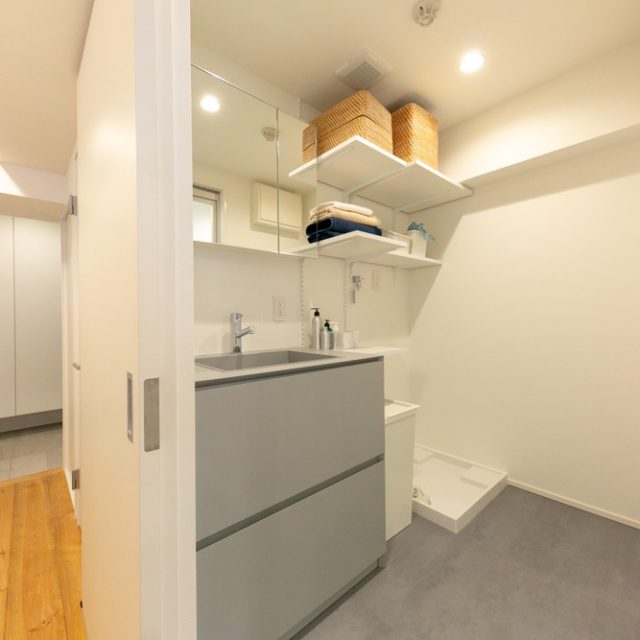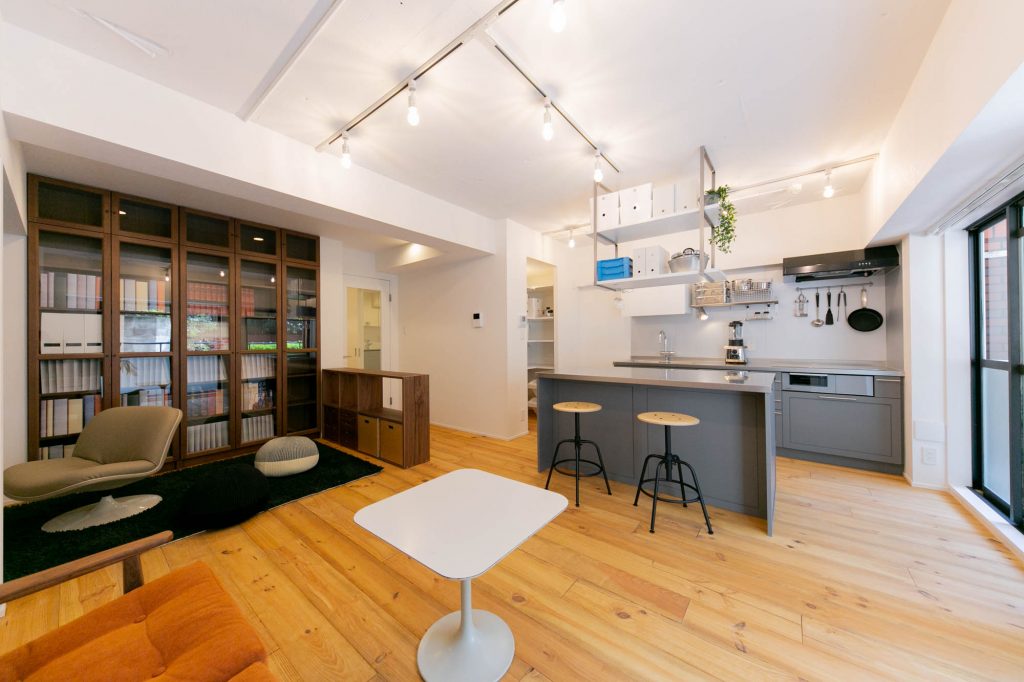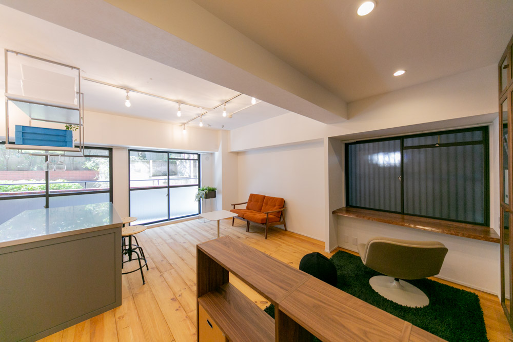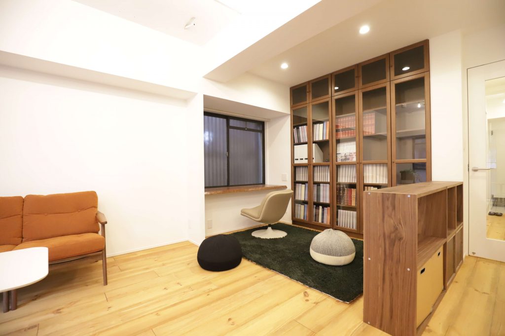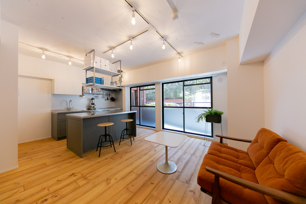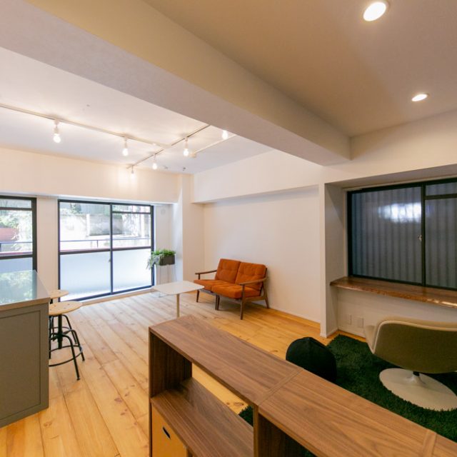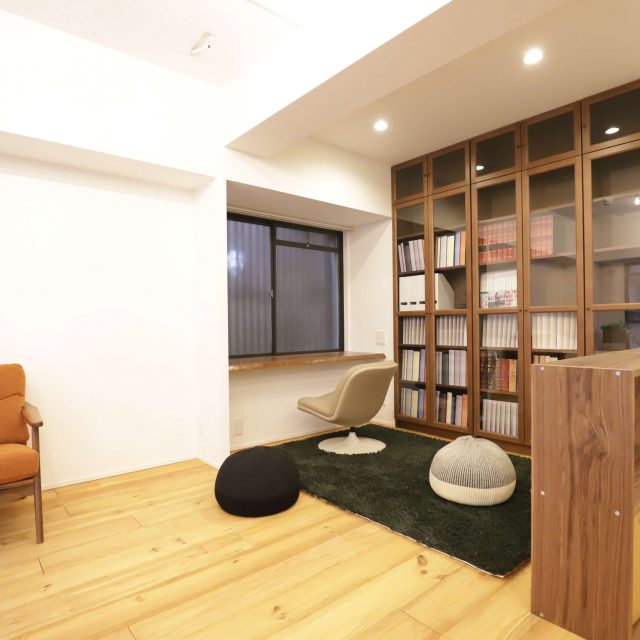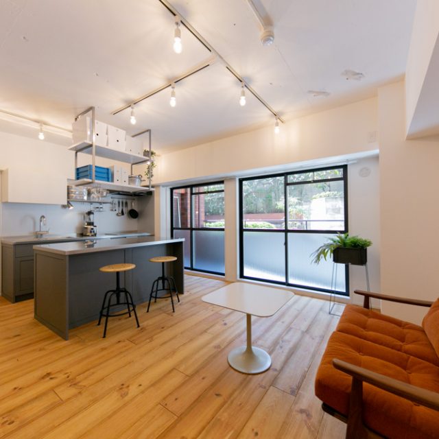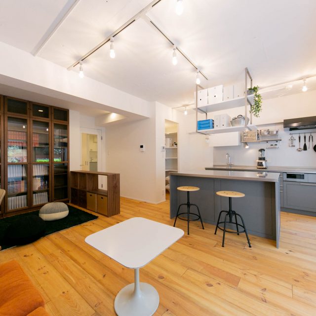 恵比寿から代官山に向かって5差路を少し奥に入った、いかにも代官山らしい雰囲気の住宅地にあるレトロなレンガタイル貼り低層マンション。前回の4階のお部屋に続いて、今回は1階の角部屋(トランクルーム使用権付)をフルリノベーションしました。躯体現しの天井にアンティーク超のパイン材無垢フローリング、リビングの一角にはライブラリースペースやデスクコーナーを造作。仕事もプライベートも充実した暮らしをされる方にぴったりのお部屋に仕上がりました。