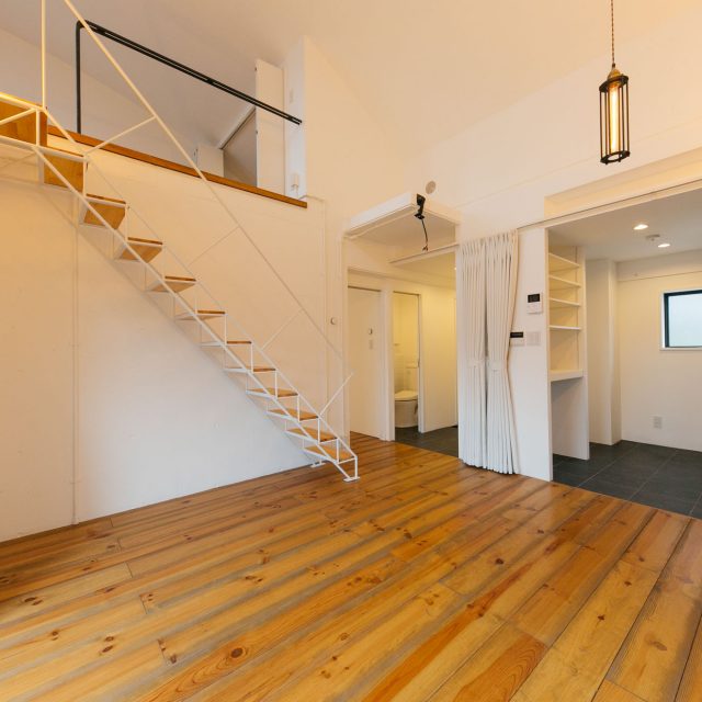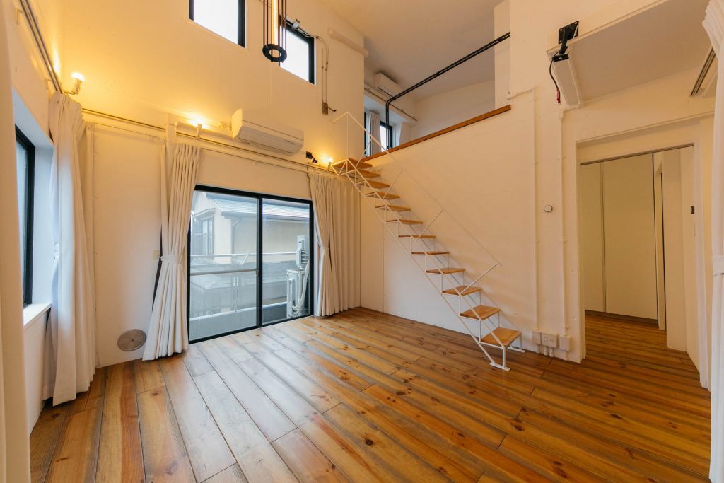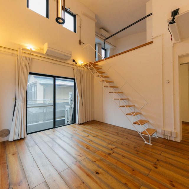 再開発が進む三鷹駅北口から徒歩8分、吉祥寺へは井の頭通りをまっすぐ歩いて18分の便利な立地です。平成3年完成、低層3階建の2階の部屋のドアをあければそこは異空間。吹き抜け部分最高約5mの高さのLDは、きっとあなたの想像を超える開放感です。3年使い込んだアンティーク調無垢パイン材フローリングの床と、RC打ちっぱなしの天上と壁が武骨な風合いを醸し出してくれています。この圧倒的な空間をぜひ体感してみてください! (H28/9当社施工リノベ物件の受託販売です)
