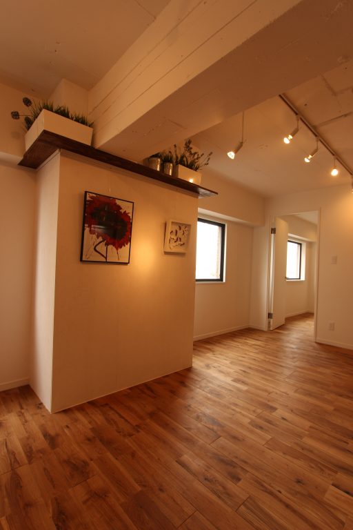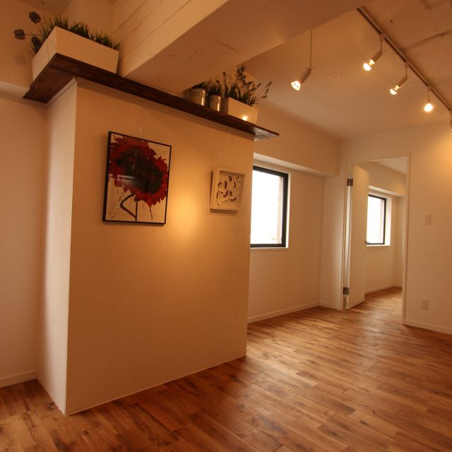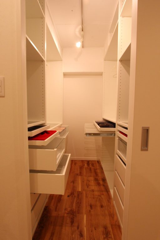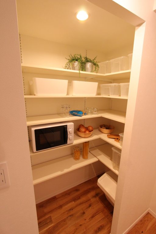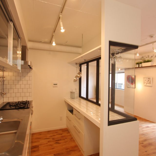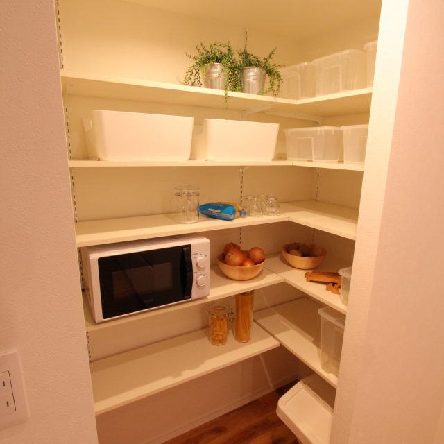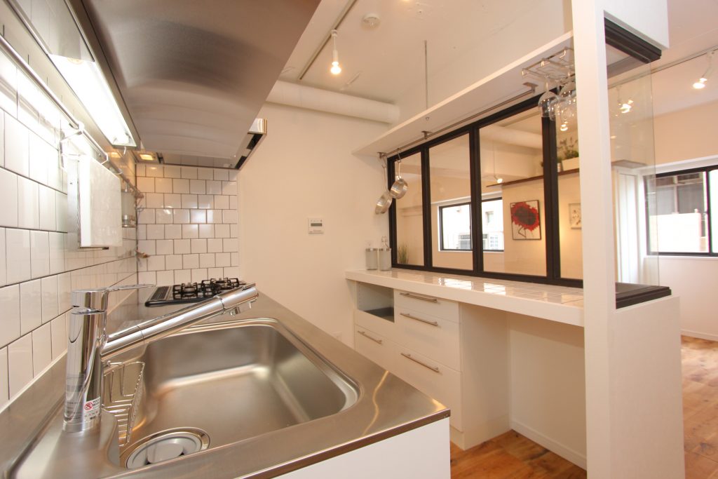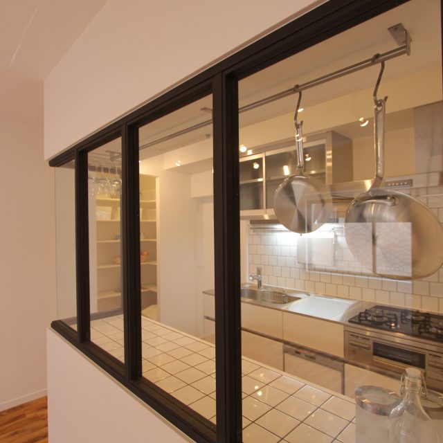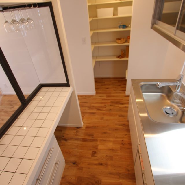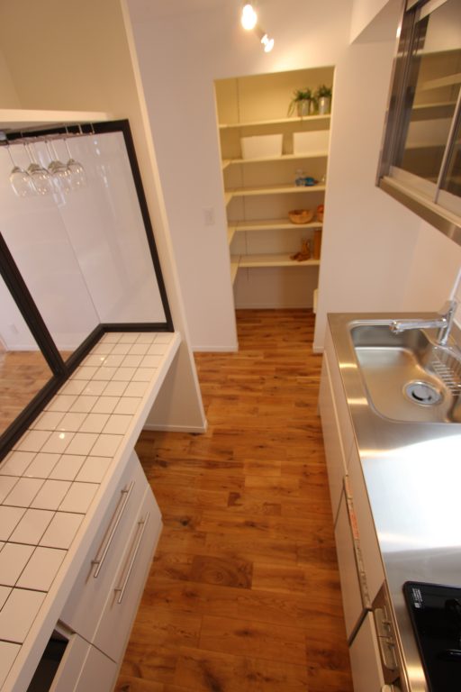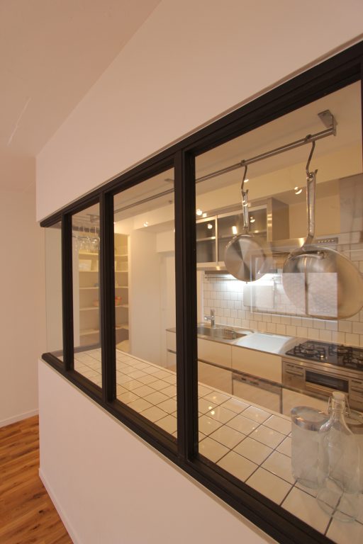 「おしゃれなレストランやカフェみたい!」と思わず言ってしまうような、ガラスの間仕切りがあります。この間仕切りは、リビングとキッチンをおしゃれに分けるだけでなく、料理の匂いがリビングに流れすぎないという効果も。リビングからガラス越しにお料理の様子が見え、おもてなし好きのご家庭にもぴったりでしょう。キッチン内には、タイル貼りの作業テーブルがあり、ワイングラスを並べて吊るせるラックがあるなどプロ仕様で、お料理をする時間もワクワクしそう。おいしいもの好きな友人をたくさん呼んで、楽しいパーティーが行われるシーンも目に浮かびます。