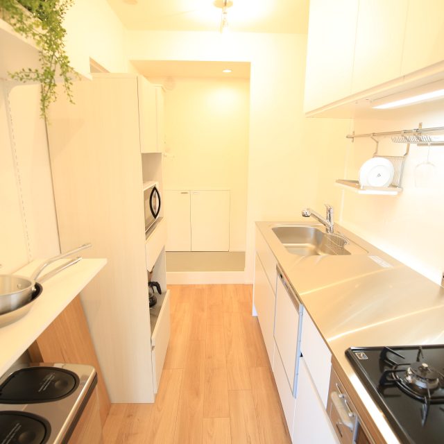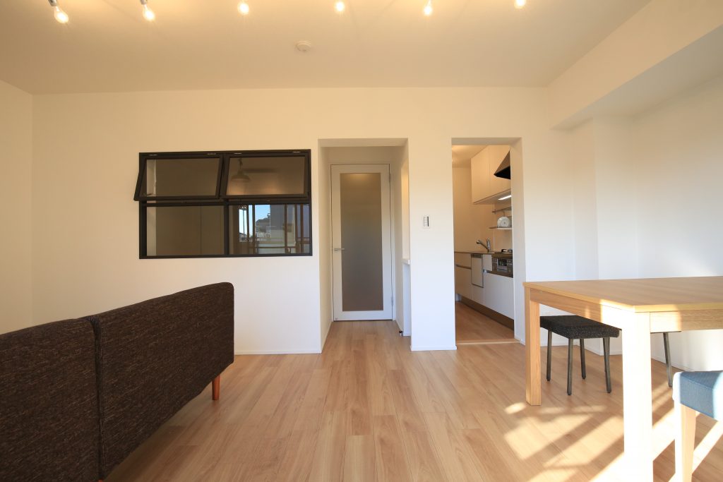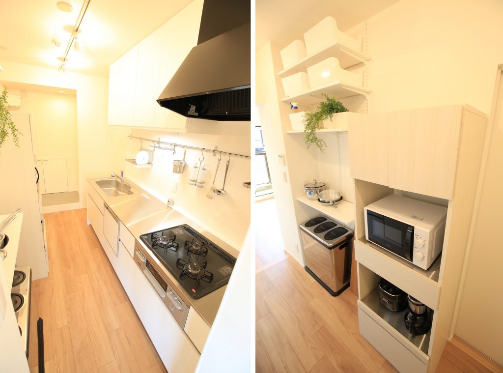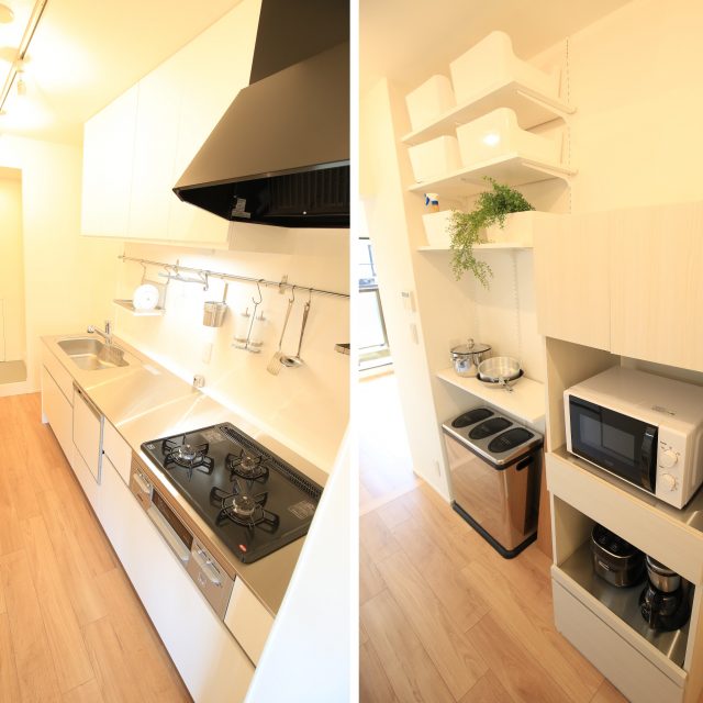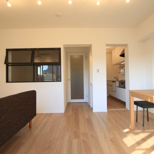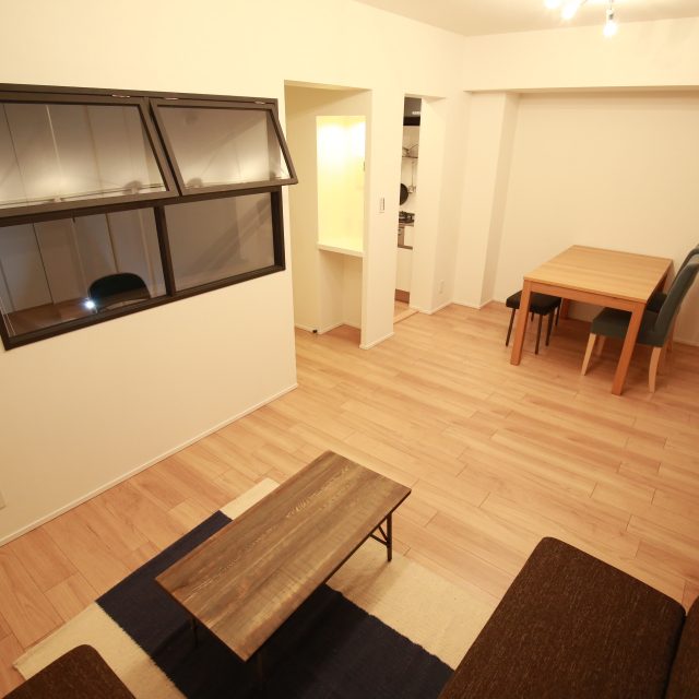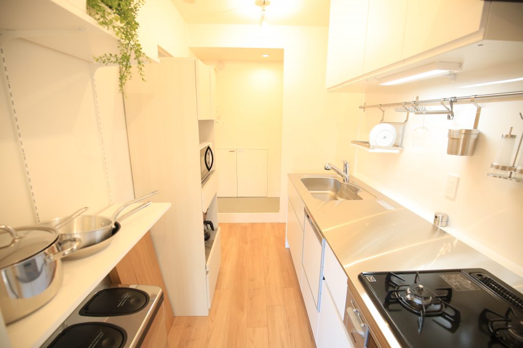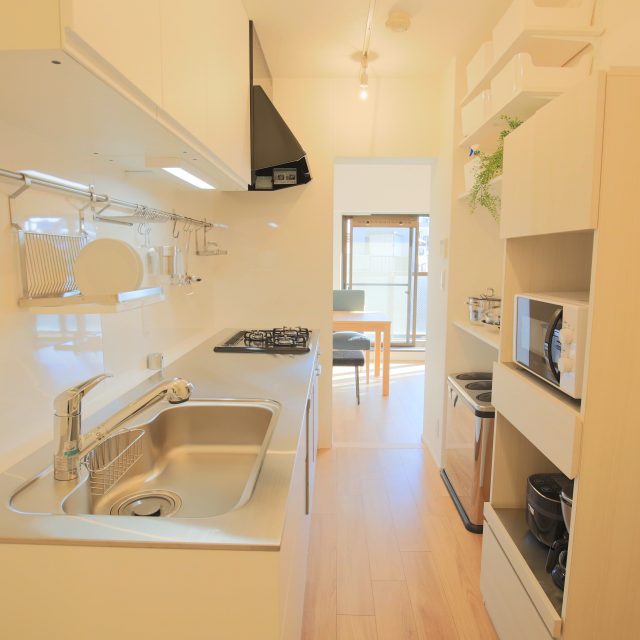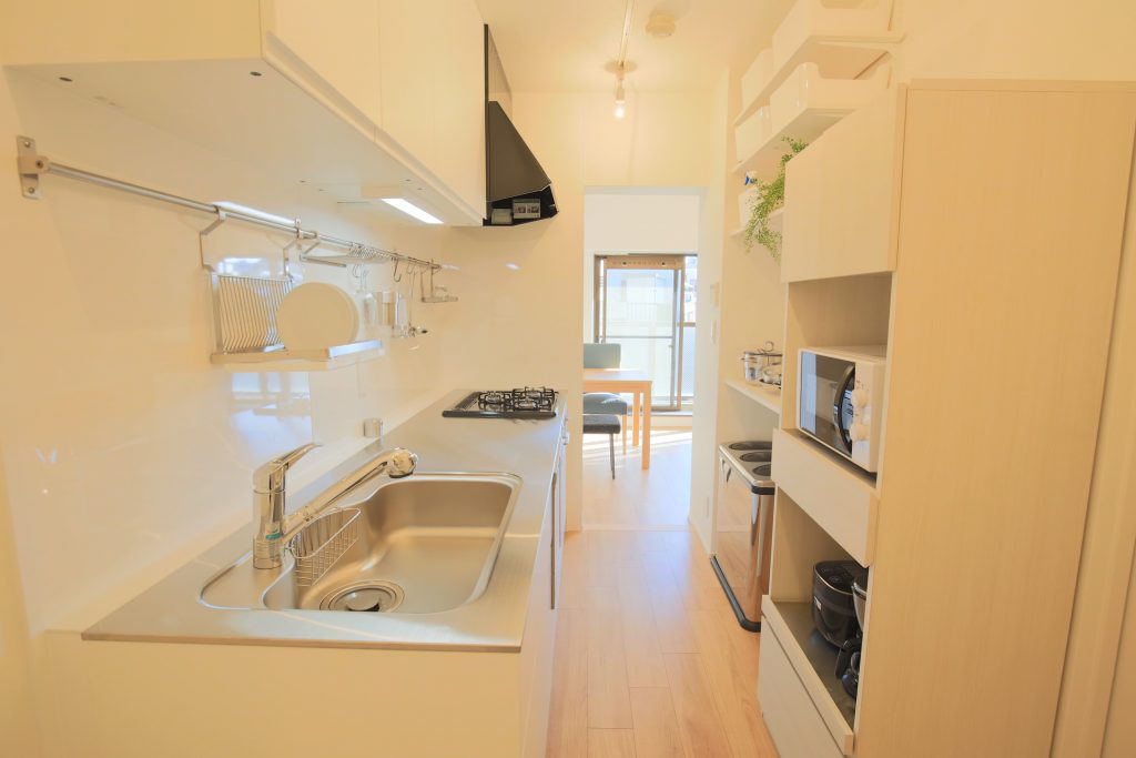 駒沢大学駅から徒歩8分の立地は、人気の三軒茶屋も生活圏内です。間取りは2LDK。洋室の1つは、SOHOでも使えるワイド幅の無垢材カウンターデスクを設けました。広いキッチン内には洗濯機置場が。行ったり来たりせずに済むので、炊事と洗濯をとても効率的に行えます。さらに、洗濯機横のニジリ戸を開けると、壁むこうの脱衣所のランドリーボックスを取り出せるようにしました。