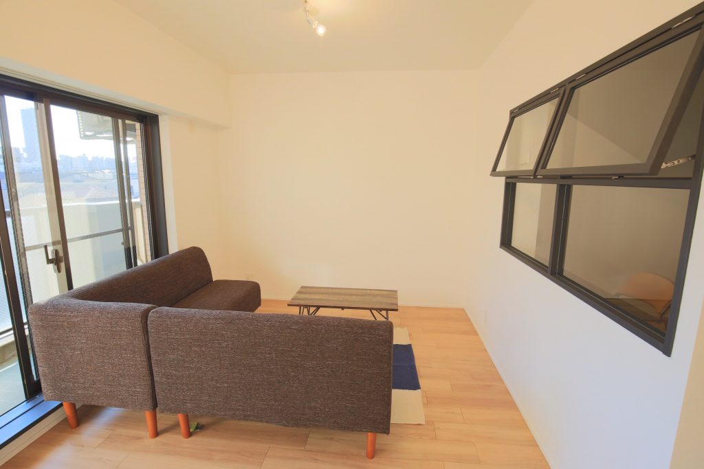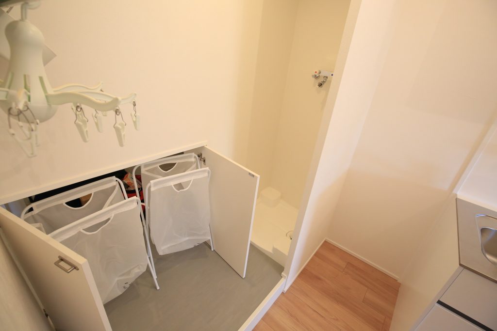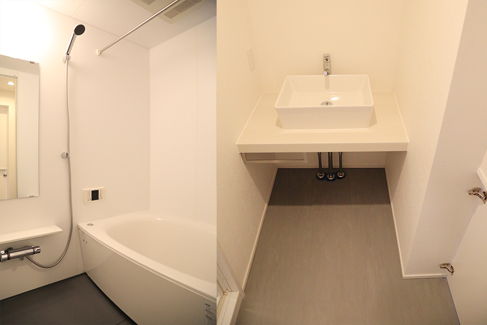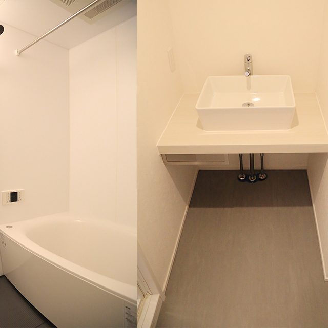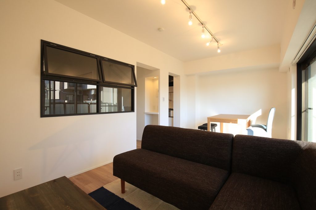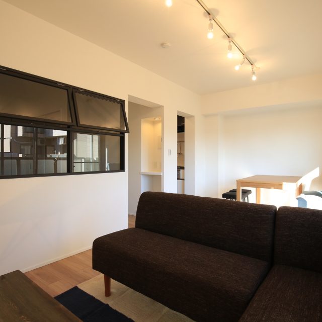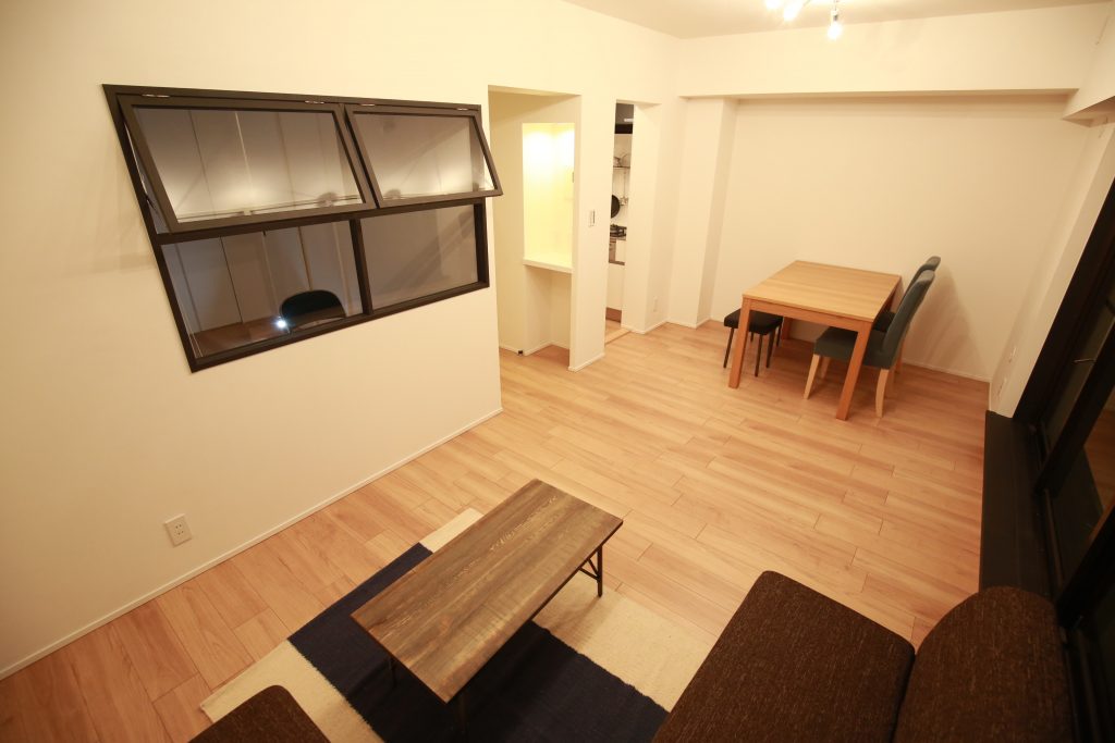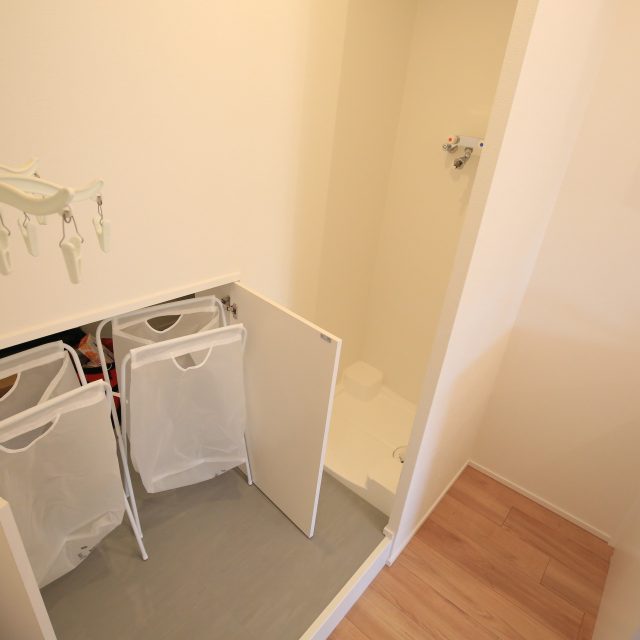 駒沢大学駅から徒歩8分の立地は、人気の三軒茶屋も生活圏内です。間取りは2LDK。洋室の1つは、SOHOでも使えるワイド幅の無垢材カウンターデスクを設けました。広いキッチン内には洗濯機置場が。行ったり来たりせずに済むので、炊事と洗濯をとても効率的に行えます。さらに、洗濯機横のニジリ戸を開けると、壁むこうの脱衣所のランドリーボックスを取り出せるようにしました。