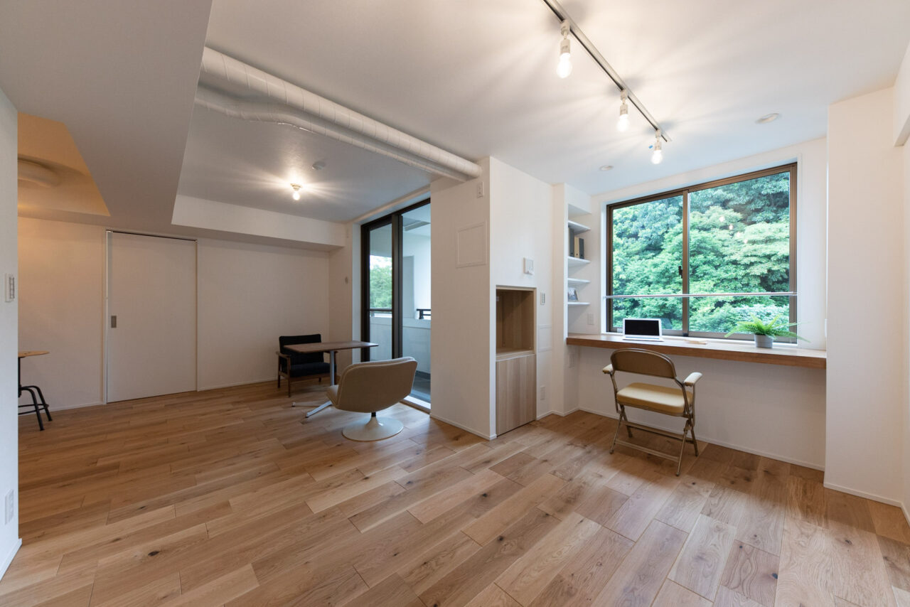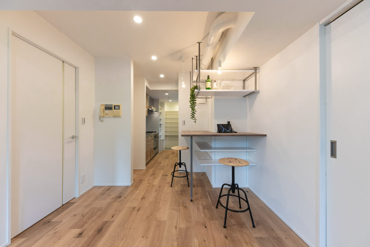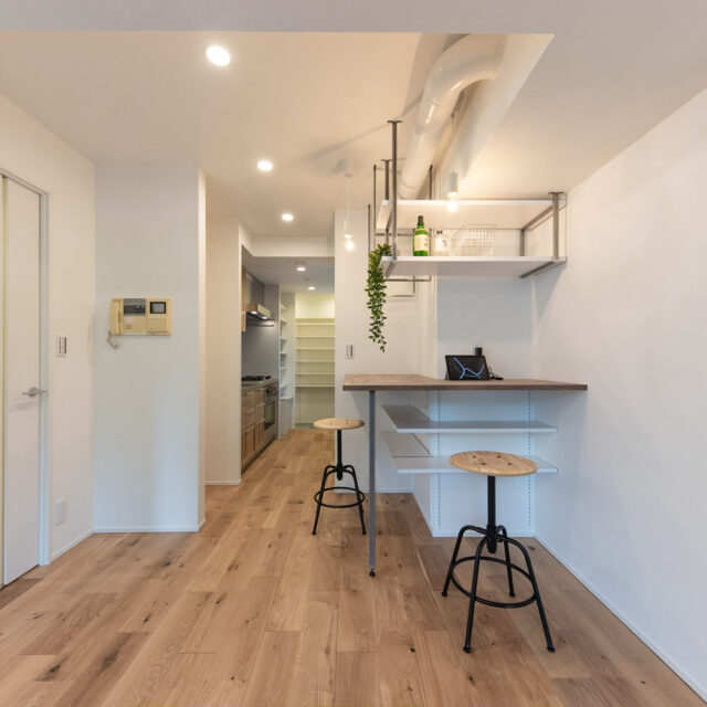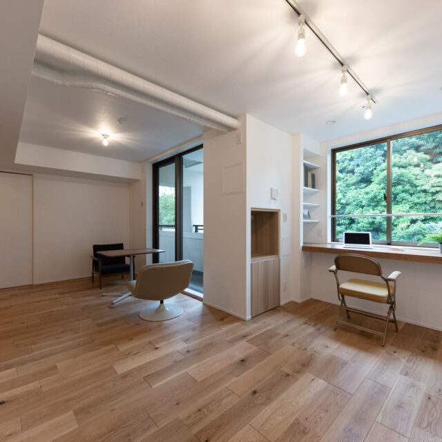 恵比寿、目黒どちらも約徒歩10分の目黒区三田一丁目。繰り返し通いたくなるような飲食店、ショップ、美術館などが生活圏の立地です。広い玄関収納につながるダイニングカウンター付キッチン、恵比寿ガーデンプレイスの緑を望む窓際の特等席にはワークデスクを設けました。バリバリ働き、遊ぶ、恵比寿フリークの暮らしが似合うお部屋です。