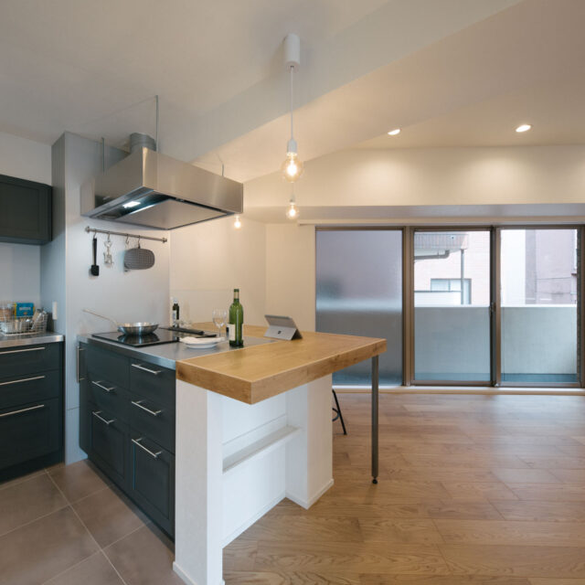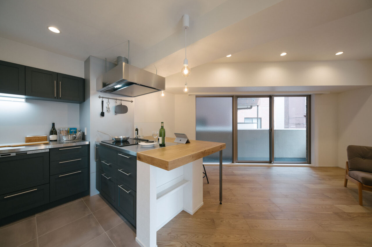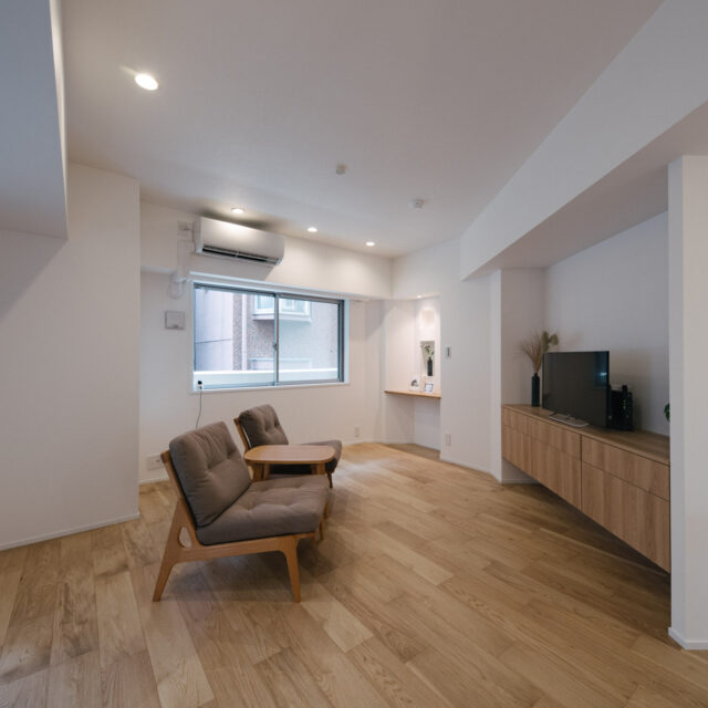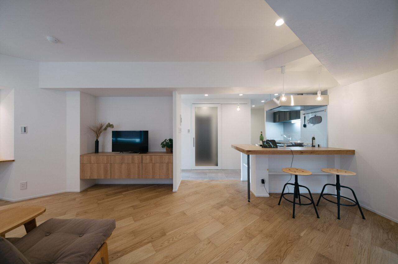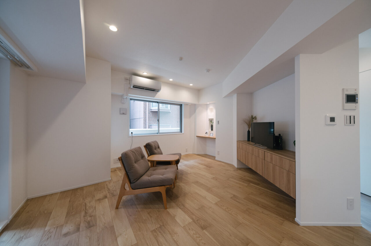 恵比寿、表参道、渋谷のちょうど中間地点の広尾3丁目に建つ築23年、1LDKのリノベーションです。室内は、L字型ダイニングカウンター付キッチンがある三角形のLDKは、インテリアの配置や工夫次第で空間のリズムを楽しめる個性的な間取りです。