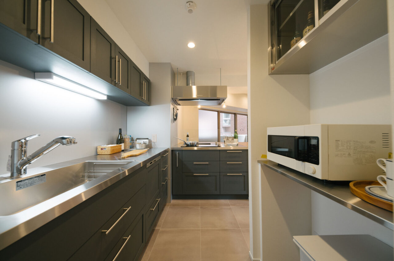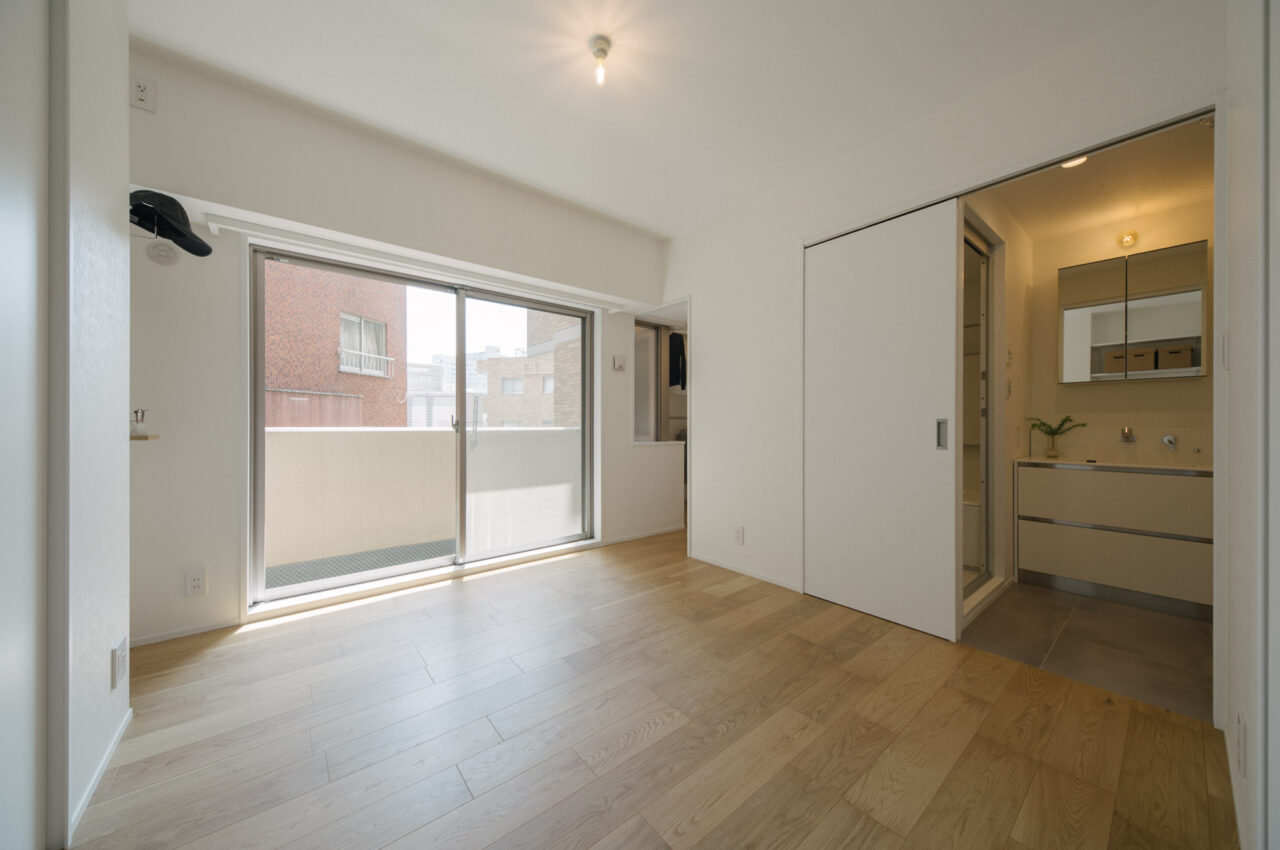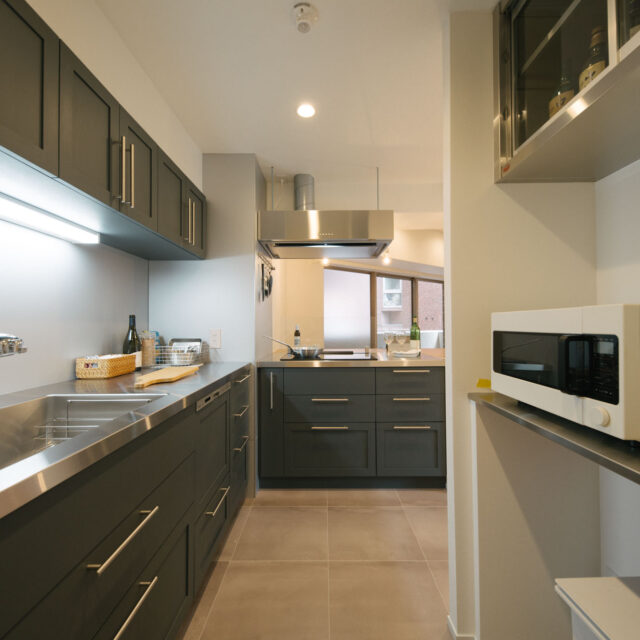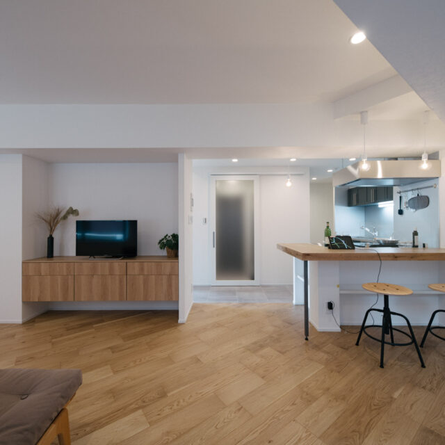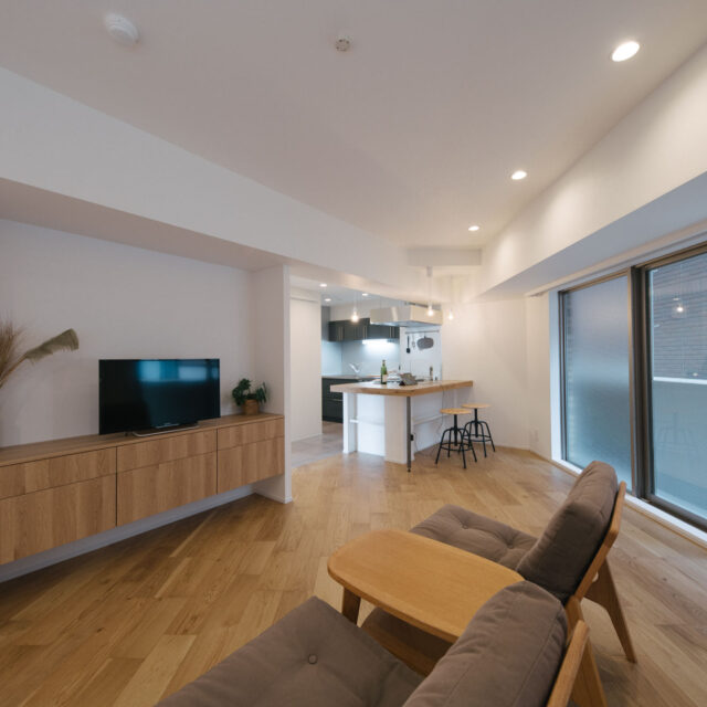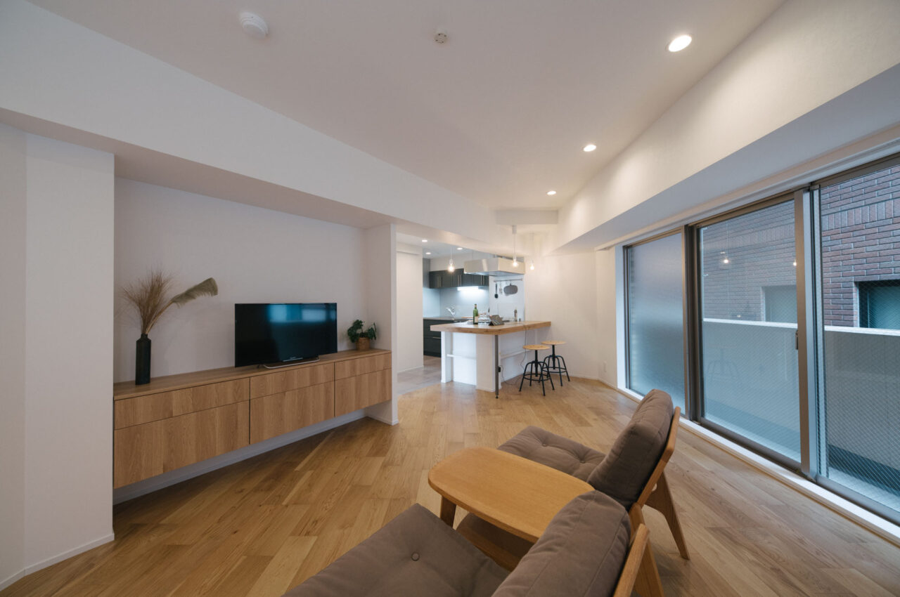 恵比寿、表参道、渋谷のちょうど中間地点の広尾3丁目に建つ築23年、1LDKのリノベーションです。室内は、L字型ダイニングカウンター付キッチンがある三角形のLDKは、インテリアの配置や工夫次第で空間のリズムを楽しめる個性的な間取りです。