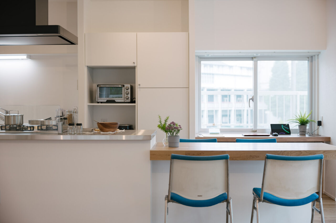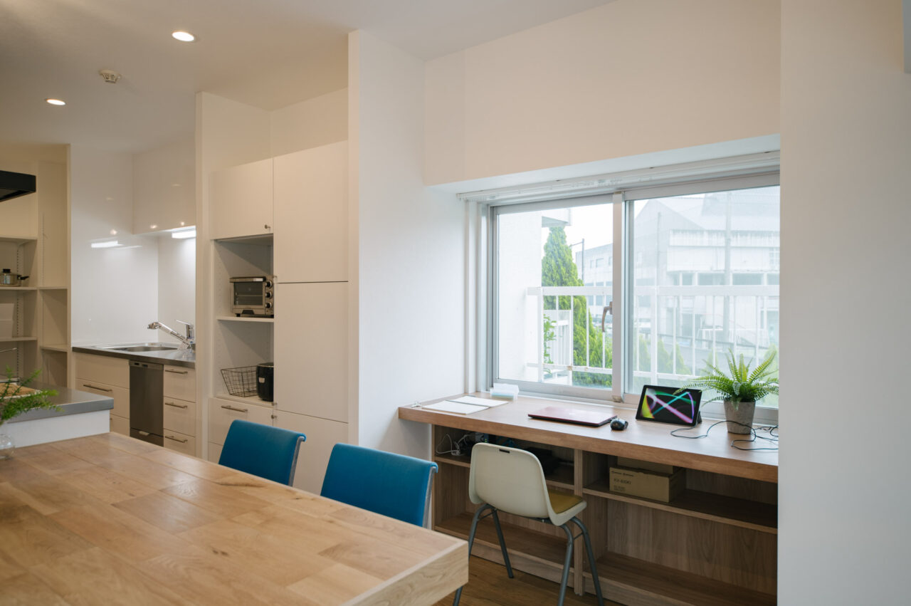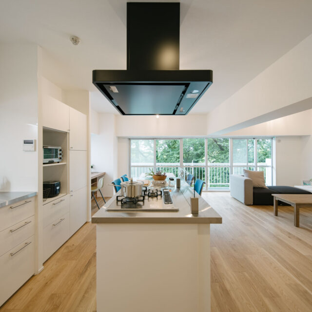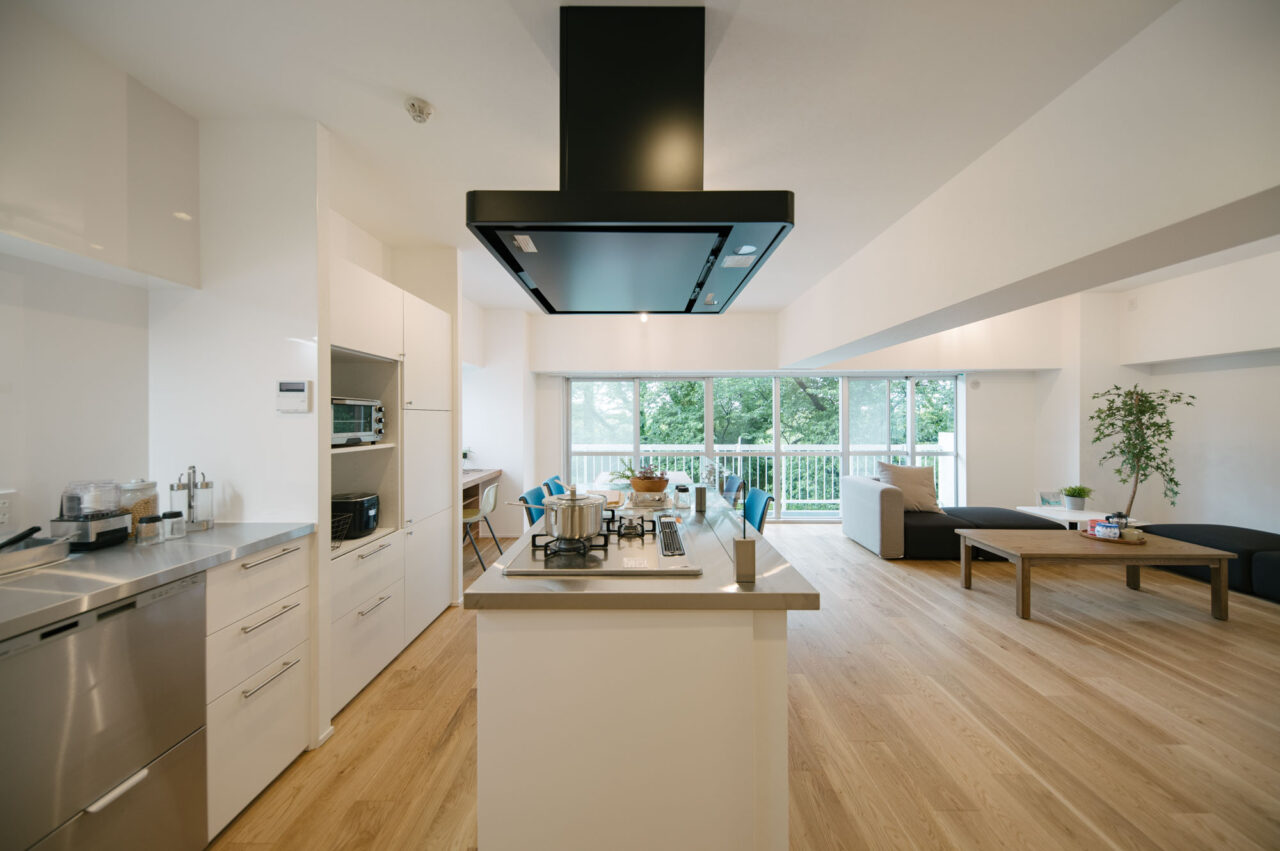 室内は2階のため川は見えませんが、敷地内の桜の樹々を望む眺望です。オーク材の造り付けダイニングテーブルを超大型アイランドキッチンとドッキングさせ、まるでクッキングスタジオと見まがうような大迫力。間仕切壁を設けることで3LDKに変更することも可能です。