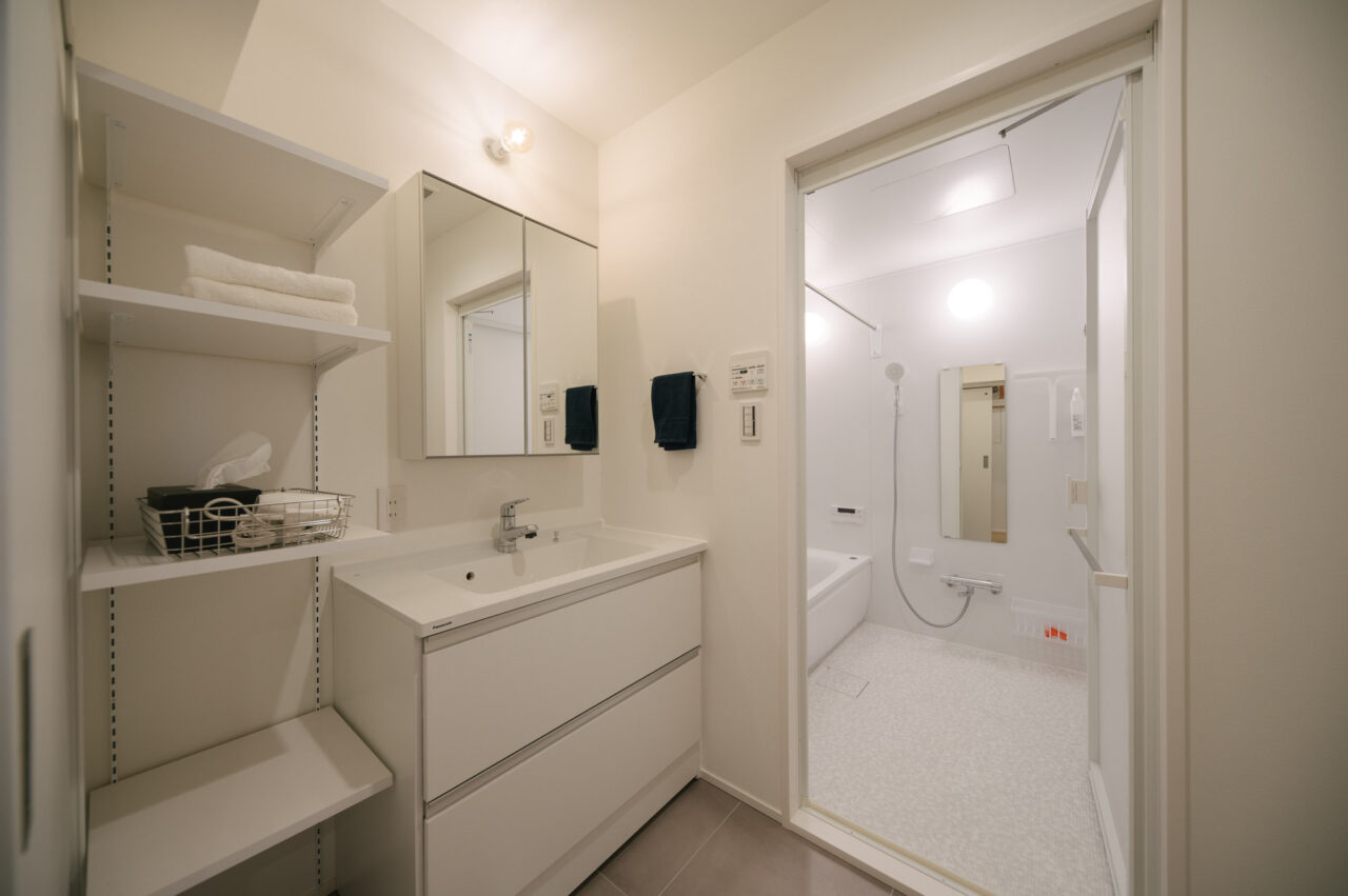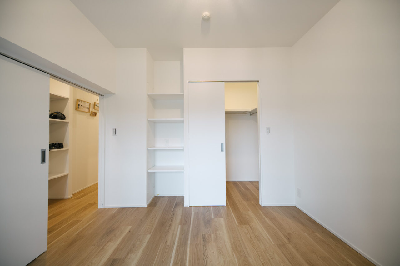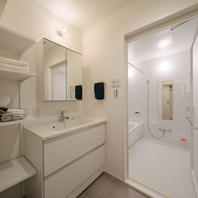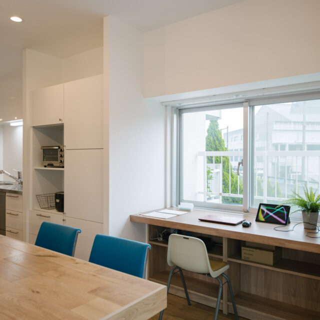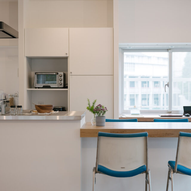 室内は2階のため川は見えませんが、敷地内の桜の樹々を望む眺望です。オーク材の造り付けダイニングテーブルを超大型アイランドキッチンとドッキングさせ、まるでクッキングスタジオと見まがうような大迫力。間仕切壁を設けることで3LDKに変更することも可能です。