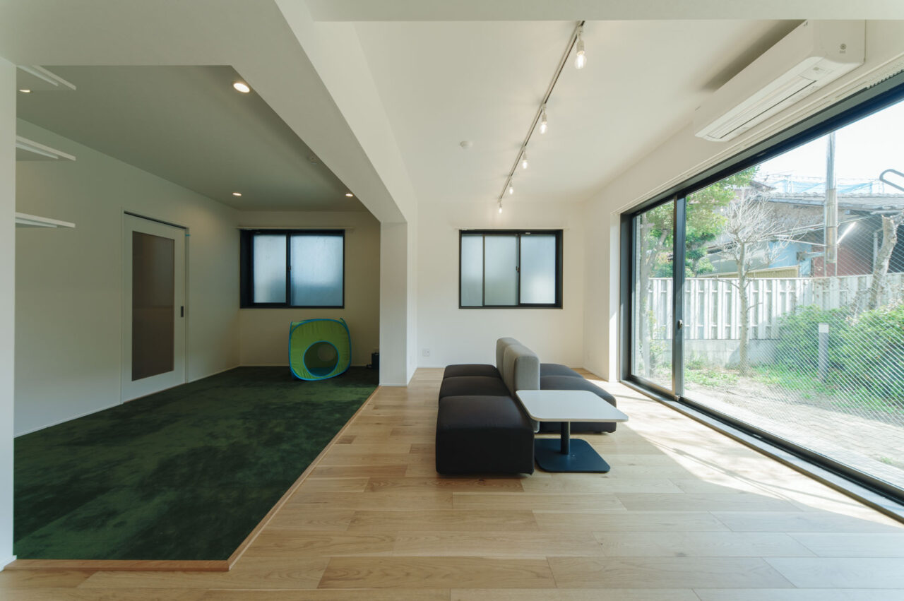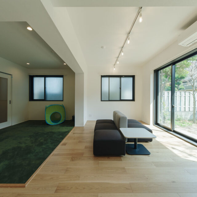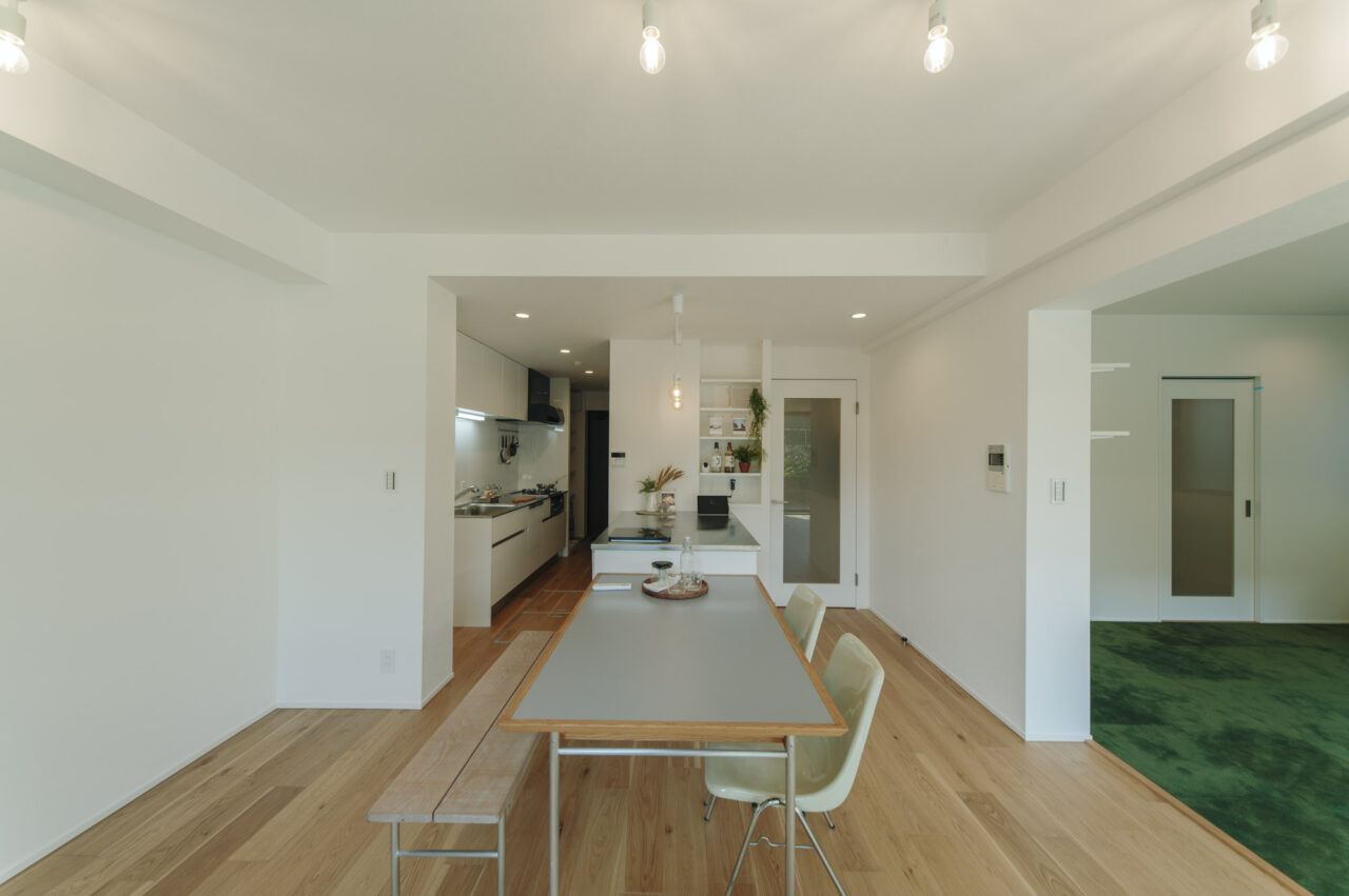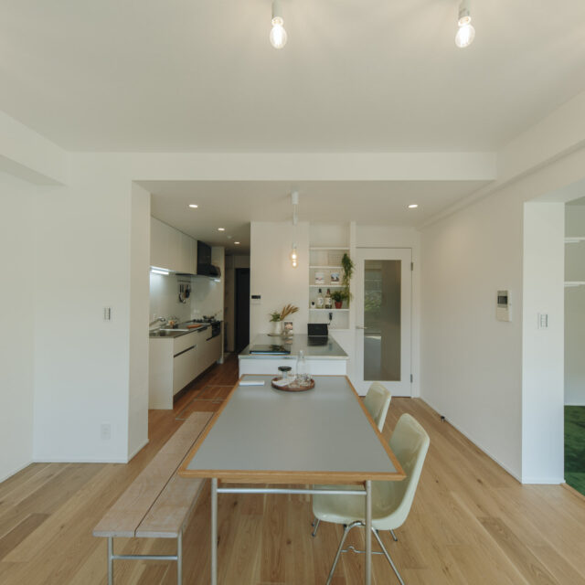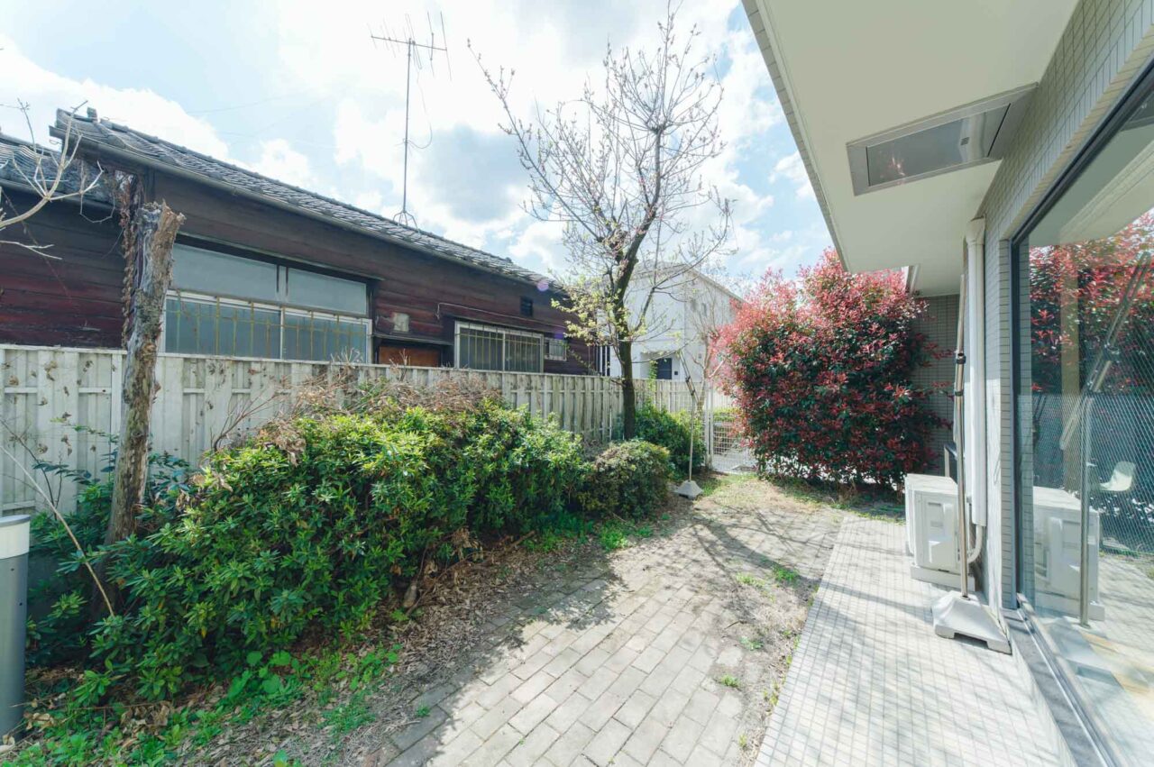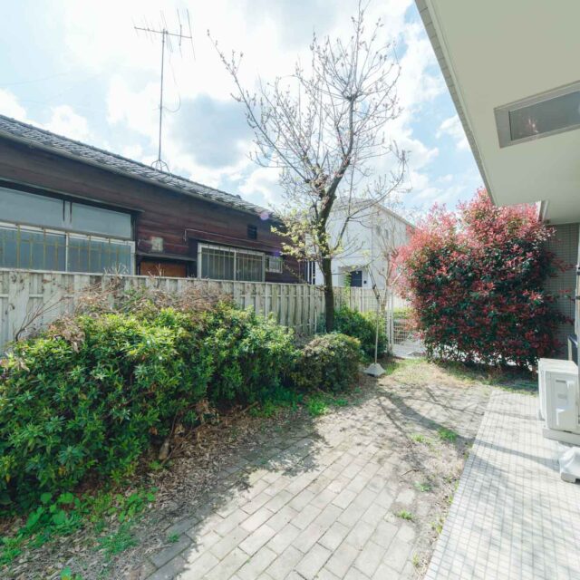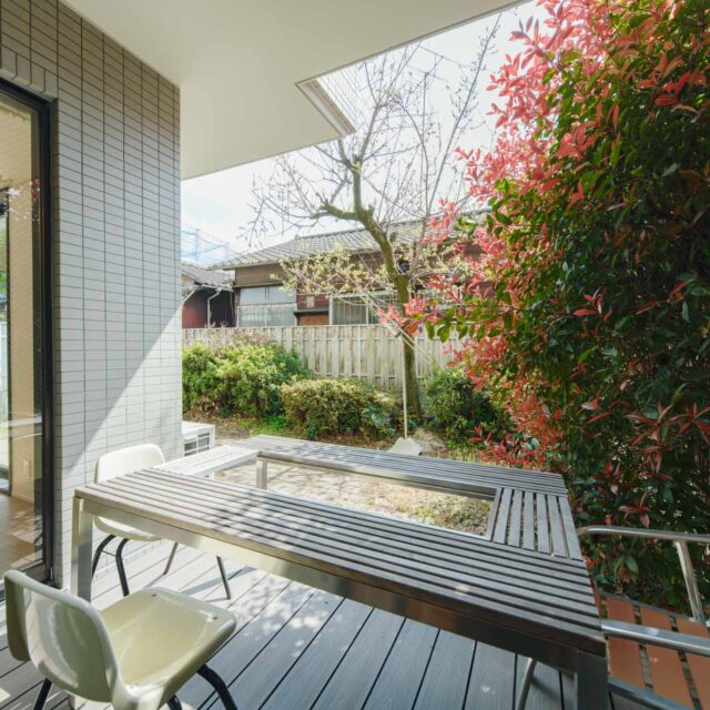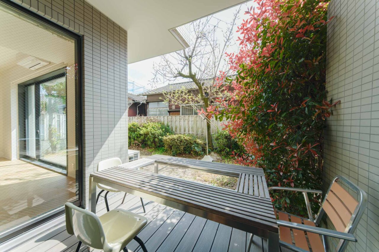 閑静な住宅地にどっしり構えた低層の3階建、中庭を囲むように配置された回廊型の建物は、エントランスホールから部屋までの明るいアプローチが開放的な気持ちにさせてくれます。お部屋は1階の東南角部屋、東・南側2面に専用庭があり、リビング側のテラスにはウッドデッキを設置、天気のいい日はアウターダイニングを楽しめます。
