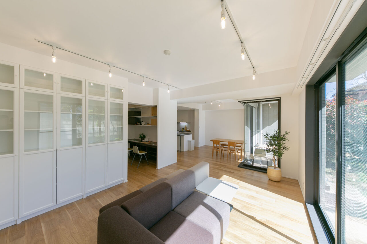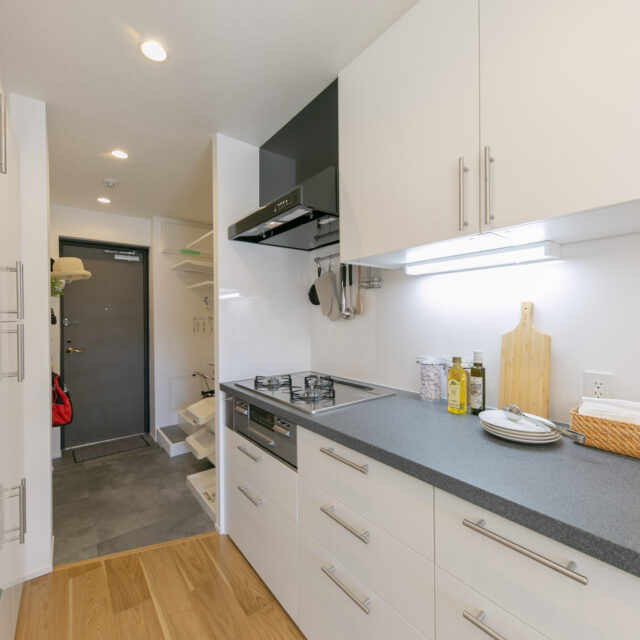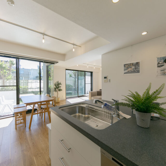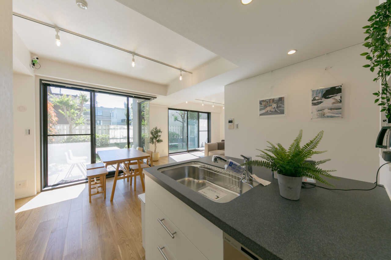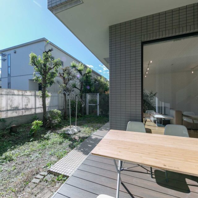 閑静な住宅地にどっしり構えた低層の4階建、中庭を囲むように配置された回廊型の建物は、エントランスホールから部屋までの明るいアプローチが開放的な気持ちにさせてくれます。お部屋は1階の専用庭付きの3LDK ∔ スタディスペース。その日の気分でテラスのウッドデッキでアウターダイニングを楽しめます。玄関横にある勝手口からの動線は、屋外用シャワー付きパンと洗濯機のランドリースペース→キッチンと効率的に家事をこなせれば、余ったその時間は家族の暮らしを豊かにしてくれるかもしれません。