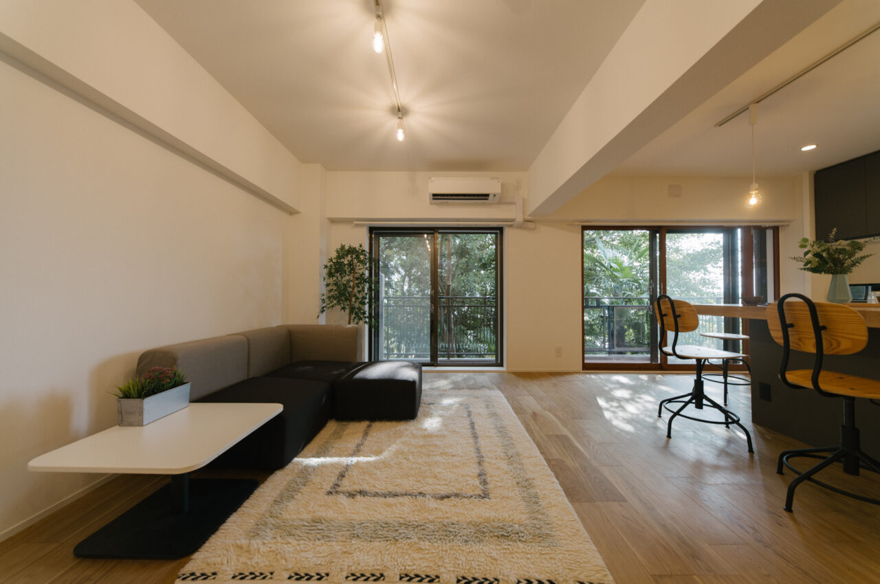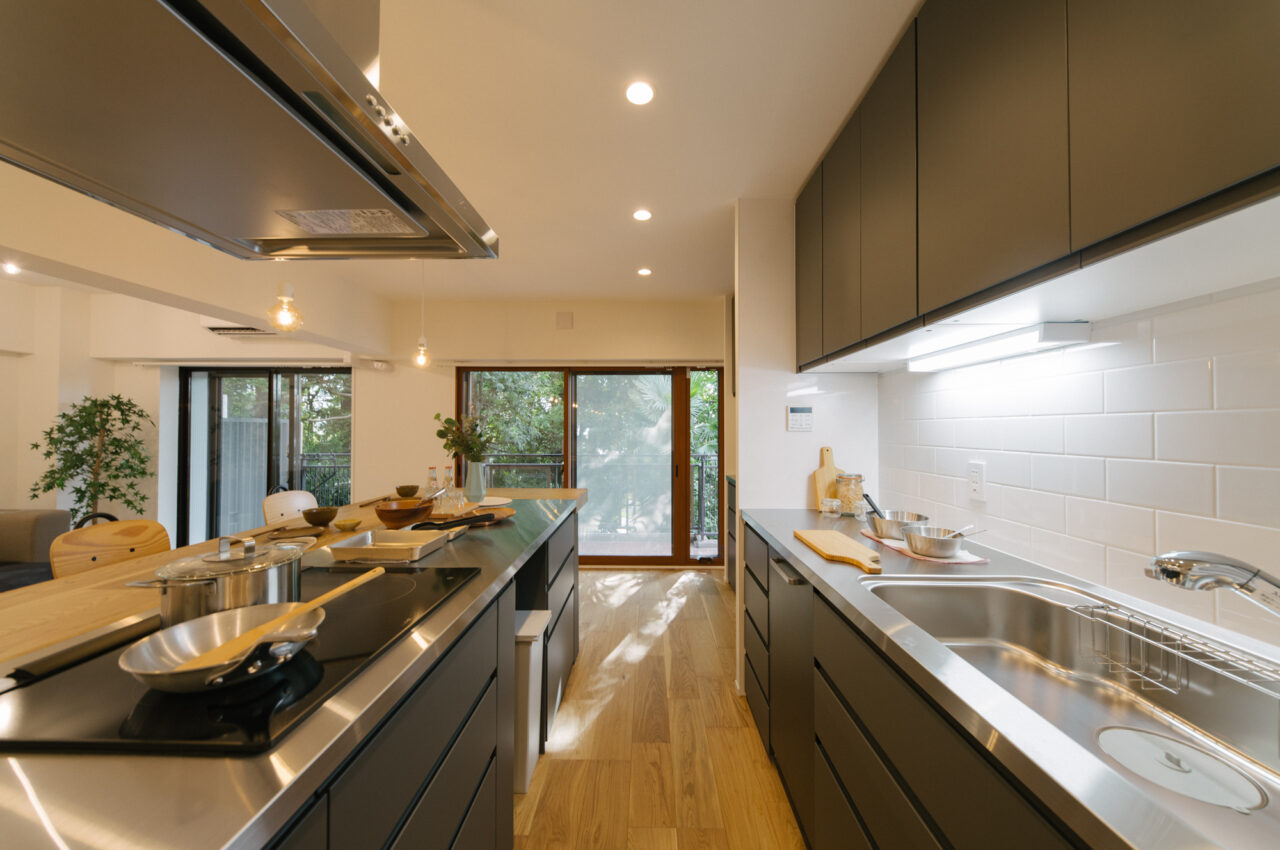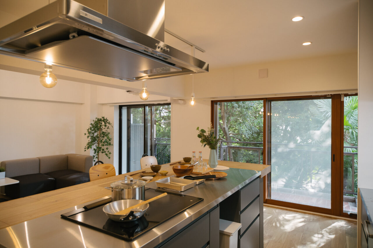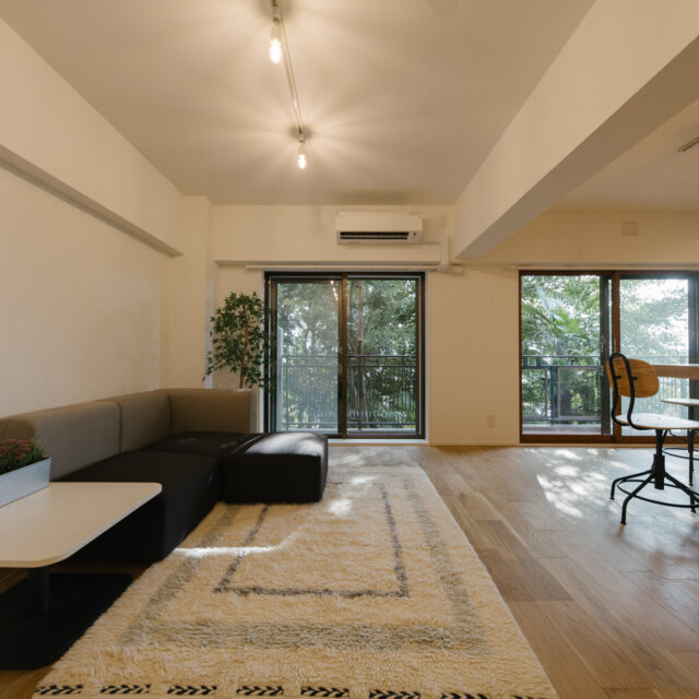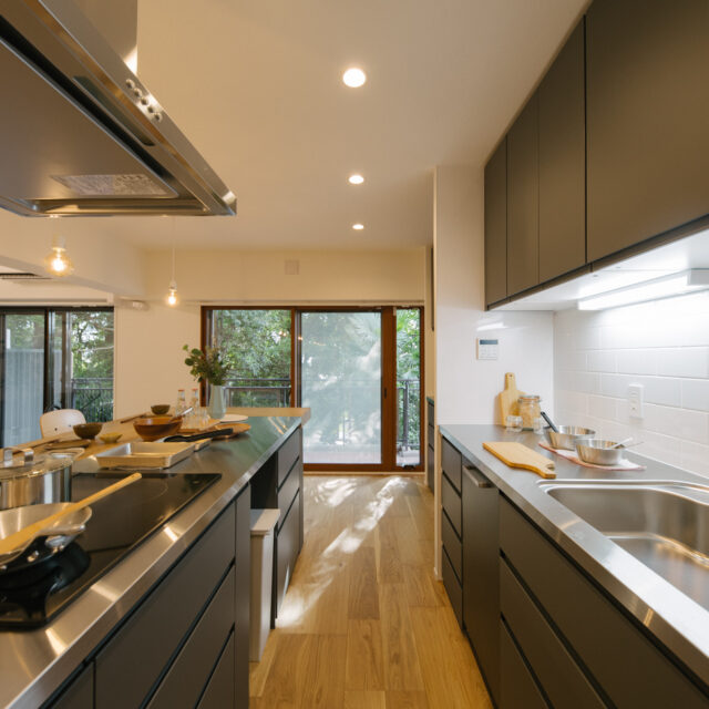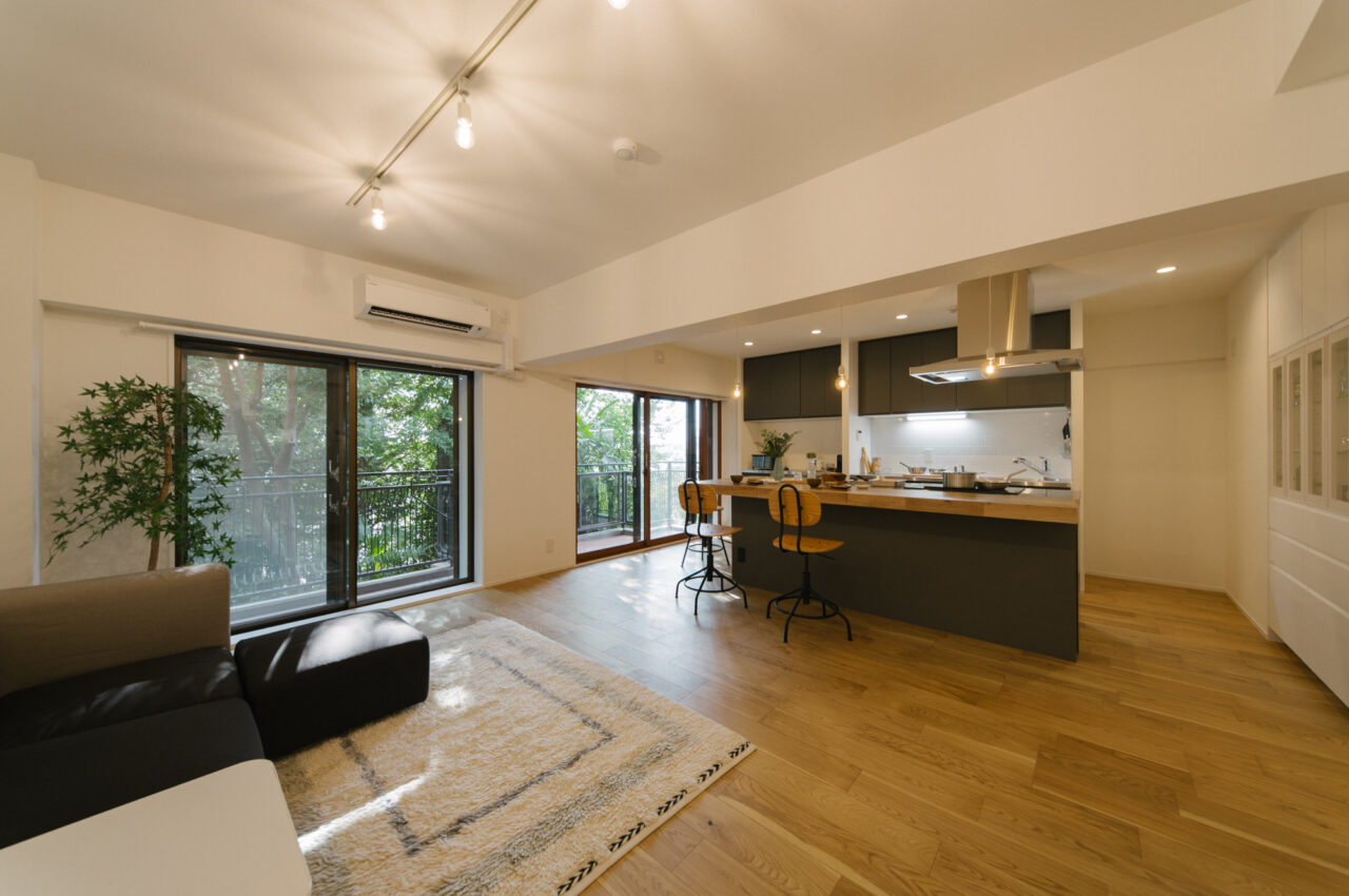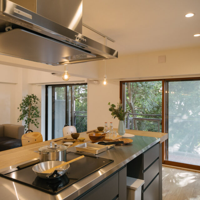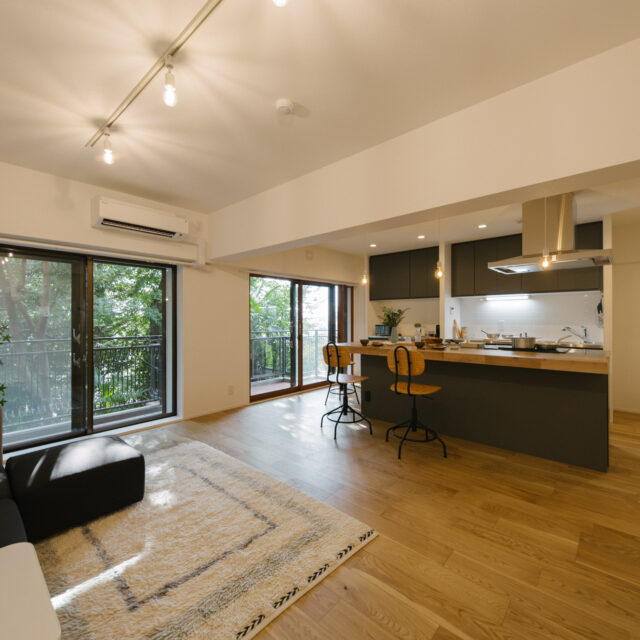 高感度な店舗群、豊かな緑と利便性が魅力の二子玉川駅から徒歩9分、深い緑に囲まれた1700坪超の敷地に東急グループが開発した3棟からなる昭和53年竣工のマンションの室内は、全戸南向きの2号棟、敷地内の緑を望む眺望の3LDKです。大小各種豊富な収納とゆとりの水回り設備、そしてこのお部屋のシンボルは、ホームパーティの頻度の高いファミリーにうってつけのクッキングスタジオのようなアイランドキッチン、カウンターダイニングが日々の暮らしの中心です。