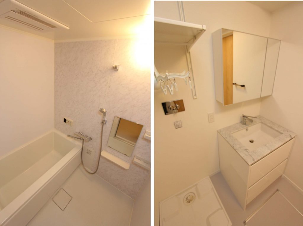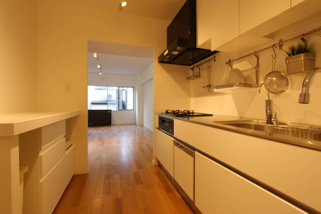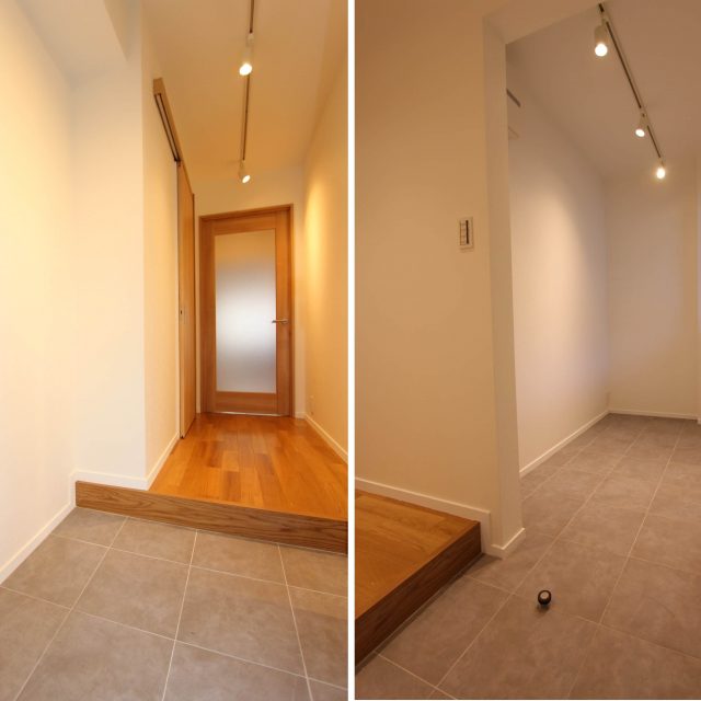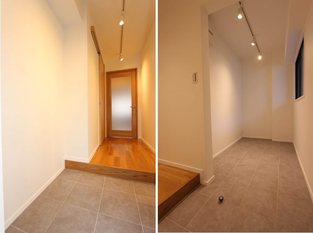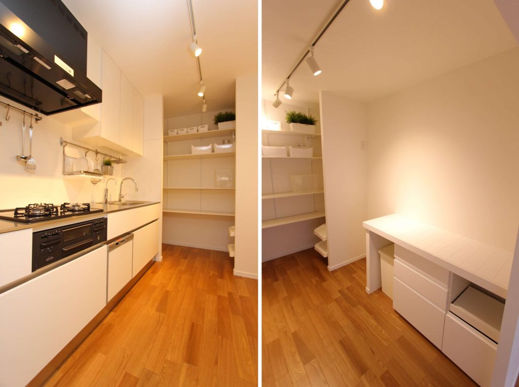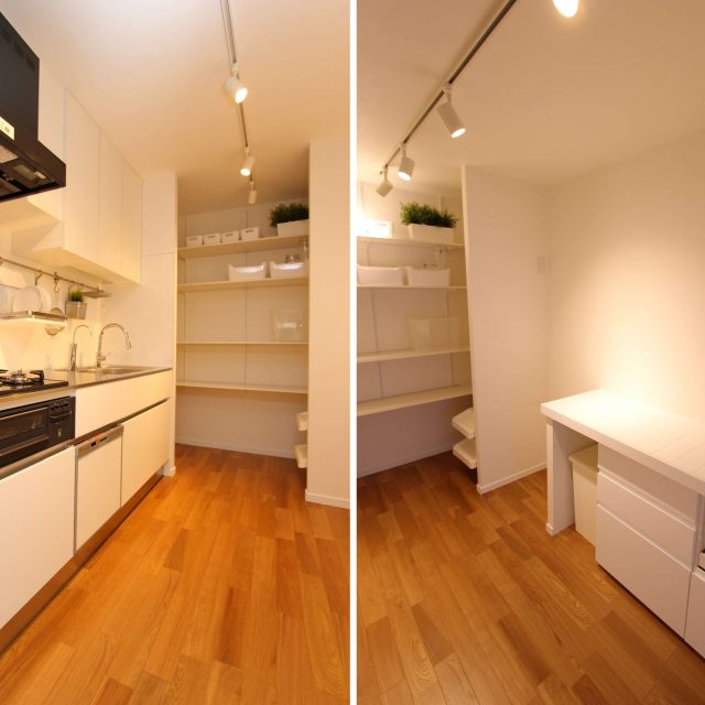 玄関を開けると左手に広々とした、シューズインクローゼットとしても活用できる土間スペースがあります。ゴルフバックやアウトドア用品などの収納にもピッタリです。また、キッチンはパントリーと直結しており、シンクの背面には作業台を併設。作業台は、タイル敷きになっているので熱いお鍋を置いたり、アイロンを掛けたり出来ます。家事に使うものを収納しておくのにも便利。作業台の下部も収納にもなっています。
