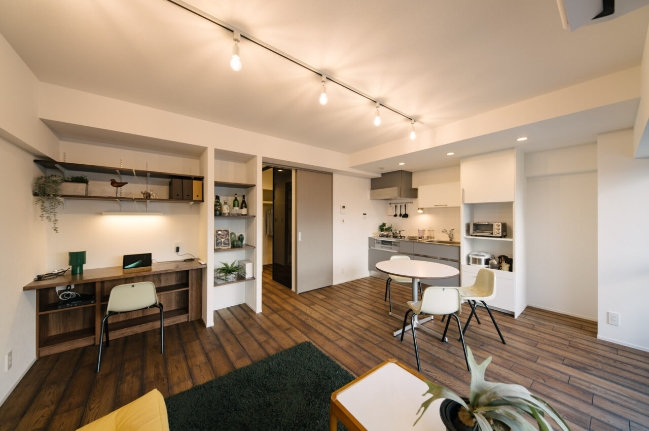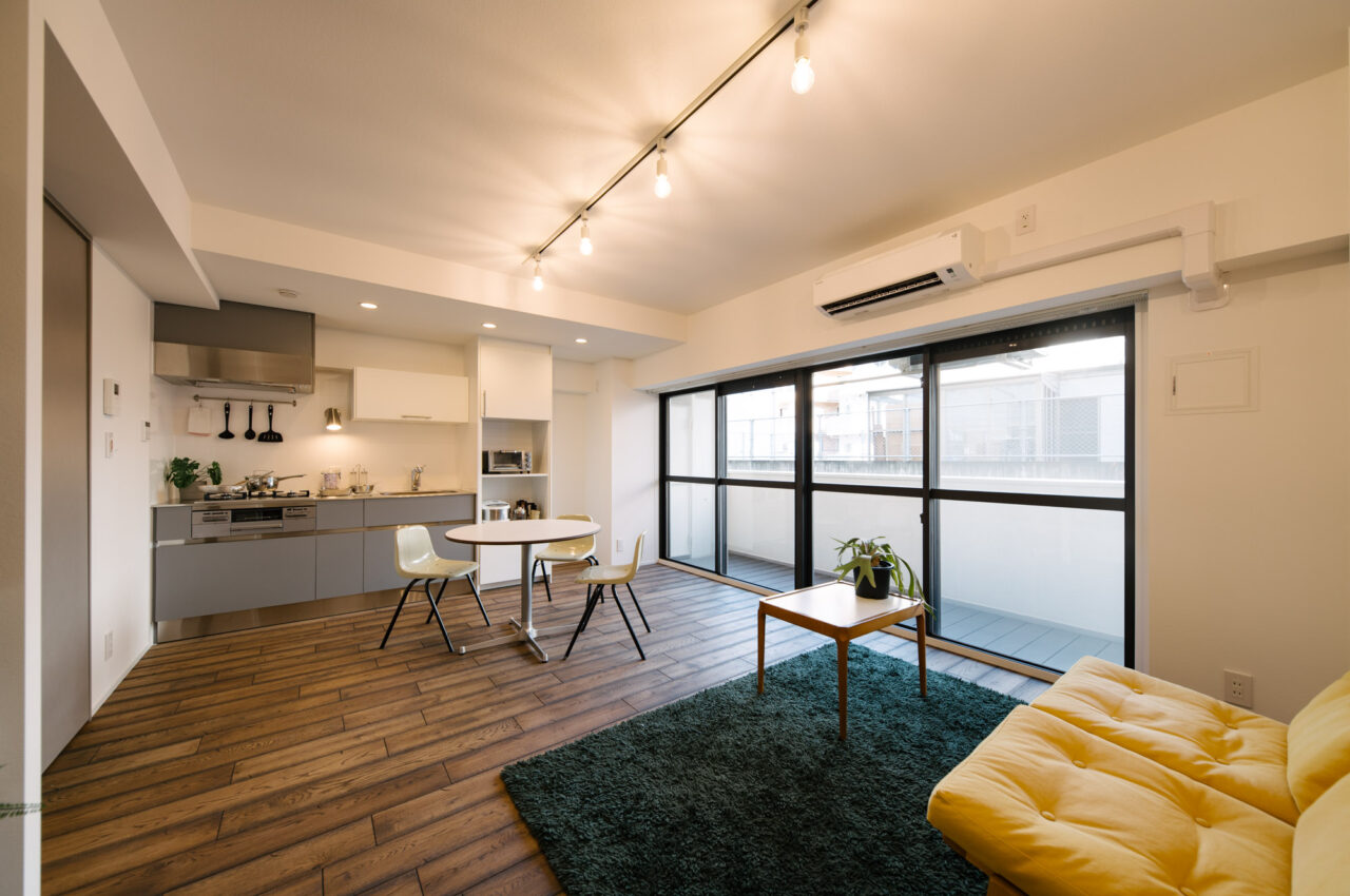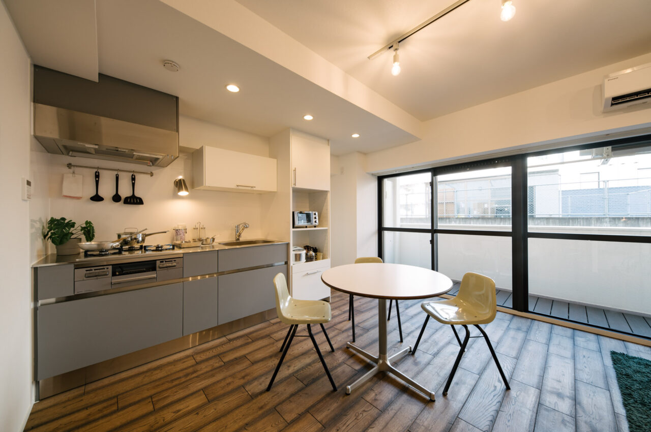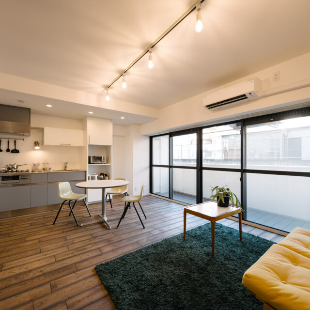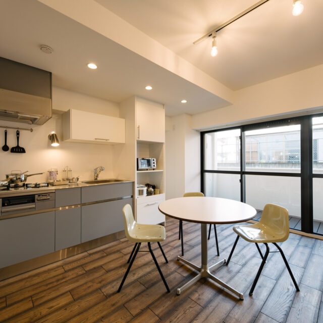 渋谷・代官山・三軒茶屋がお散歩圏、高感度のショップや個性的な飲食店が点在し、利便性と彩りのある暮らしが楽しい立地です。山手通りとR246どちらからも少し奥まった住宅地、建物は築49年超ですが、4年前に大規模修繕も完了し適宜必要な修繕が繰り返されています。室内はベッドスペース、水回り設備はミニマムサイズで、面積の大半をLDKに割り振りました。バルコニーから階段で一段下がった先の専用庭では、家庭菜園などを楽しめるお部屋です。