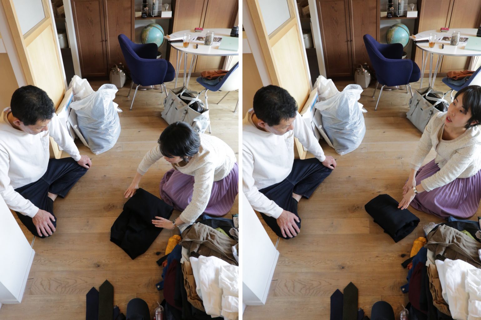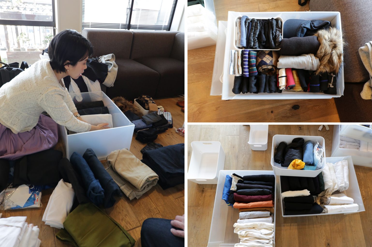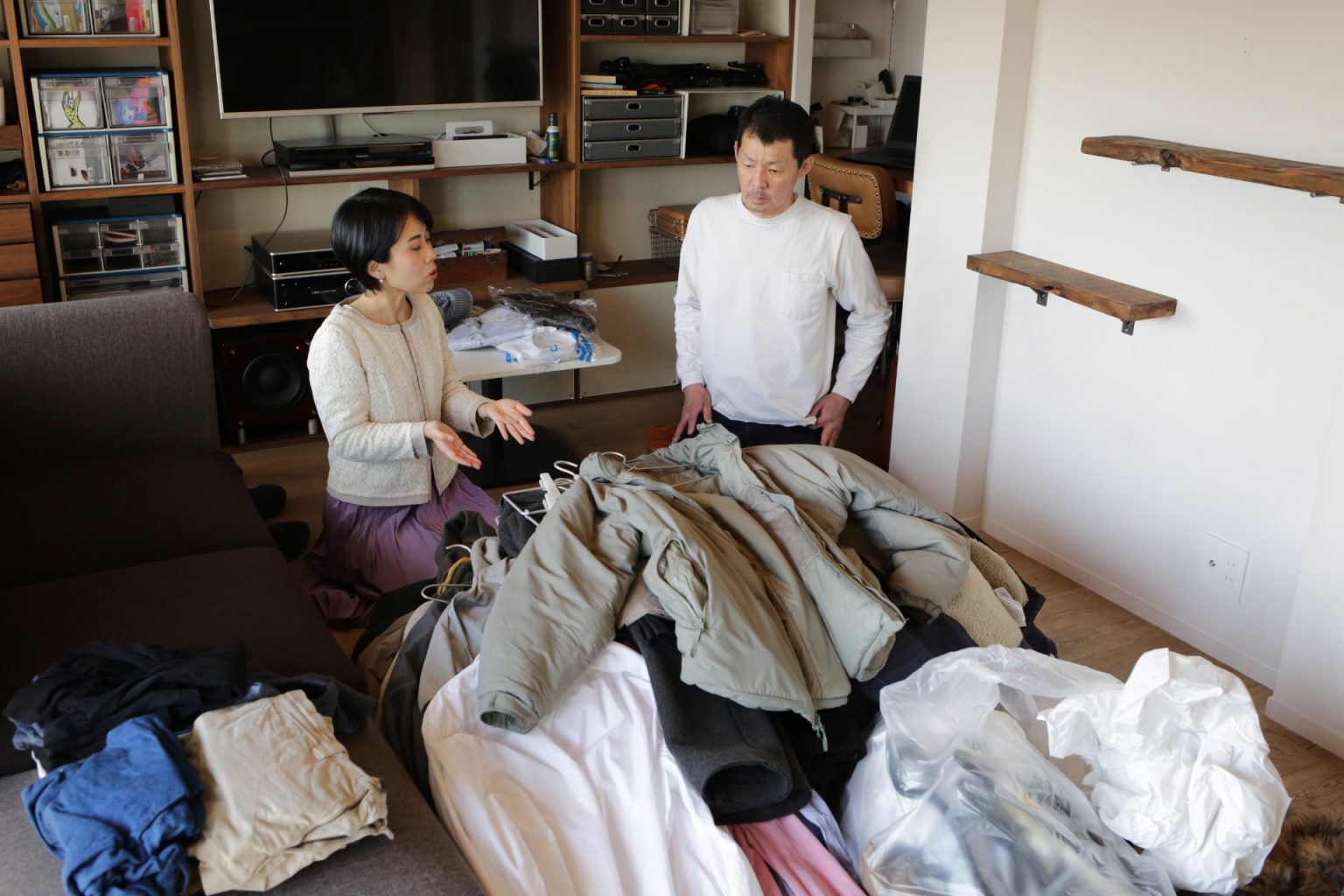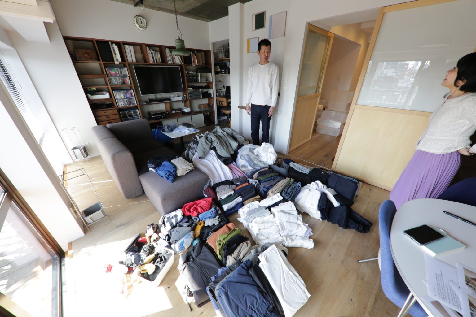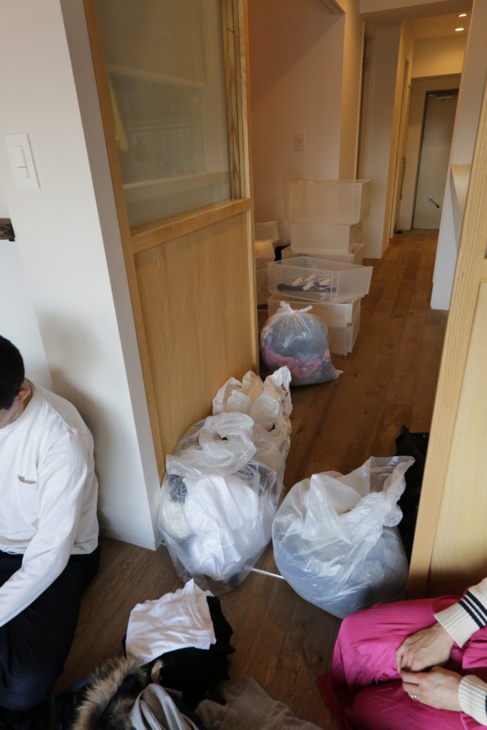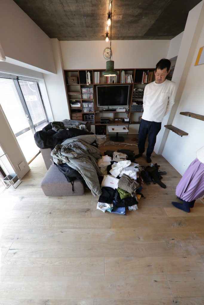 これらすべての服を取り出して、リビングにひとつ残らず集めます。