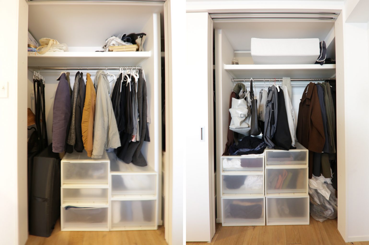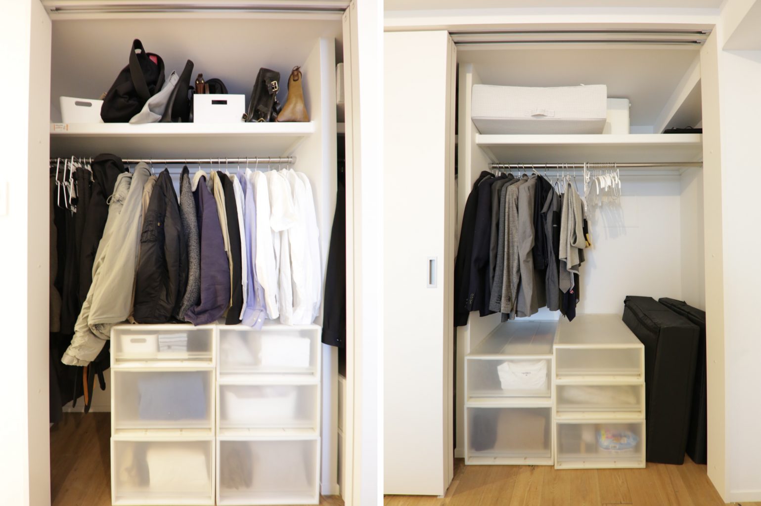 コートやジャケット、シャツなどすべてハンガーにかけて、収納が完了。色は明るいモノを右側に、丈は長いものを左側へ。すべてしまい方のルールがあるのです。