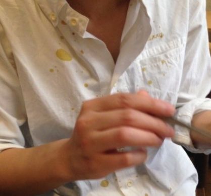 これは彼女のダンナ様が勤務している会社の商品で、カレーがはねてシャツについたのがデザインされている‘Curry‘というシャツなのだとか。ボクも最初は、どうしたの?だいぶ派手に汚したね。などと、まんまとそのデザインの狙いに引っかかってしまった。