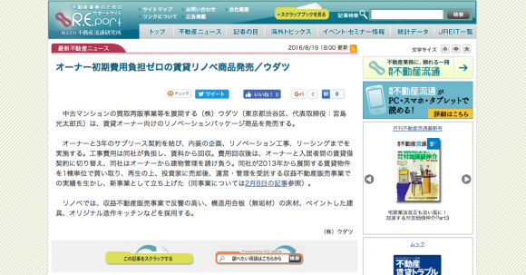 (株)不動産流通研究所が運営する、「R.E.port」にUDATSUの新事業、大家さん向け工事パッケージ事業の記事が掲載されました。