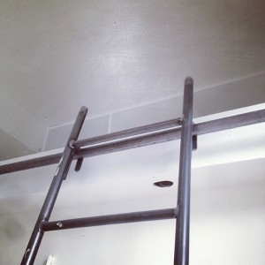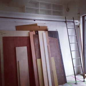 ロフトに設置したオリジナルのはしごです。上には本棚としても使える棚があります。はしごをのぼって自分だけの書庫に。