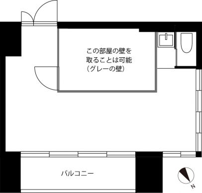 現在はもともと1Rだったのを、一部屋追加した形の間取りになっています。追加した部屋は残しても良いし、壁を取ってしまって1Rに戻すことも可能です。住居用ではなく、事務所を想定した作りになっているのでお風呂はなく、トイレと洗面のみの水回りです。キッチンはありません。