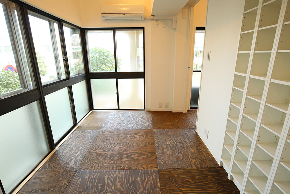 さて、奥のお部屋は角部屋で明るい印象です。壁には本棚が組み込まれています。
